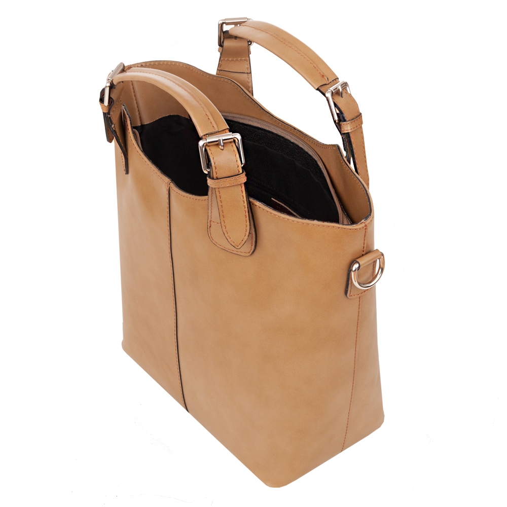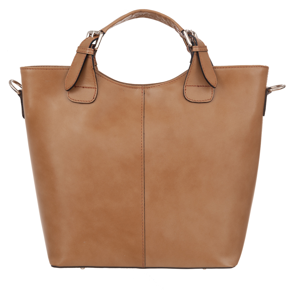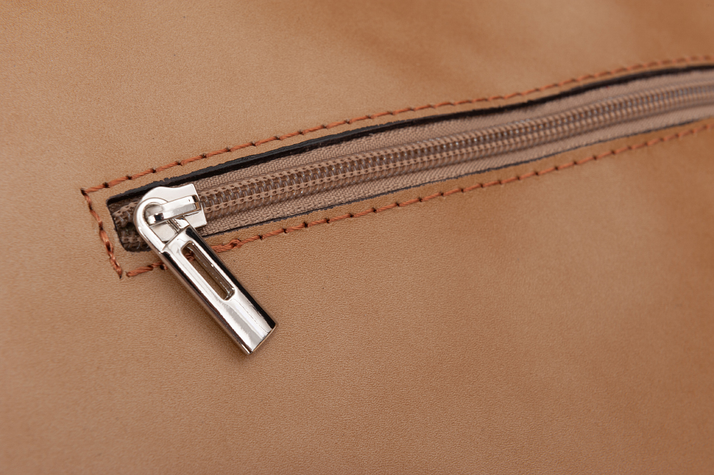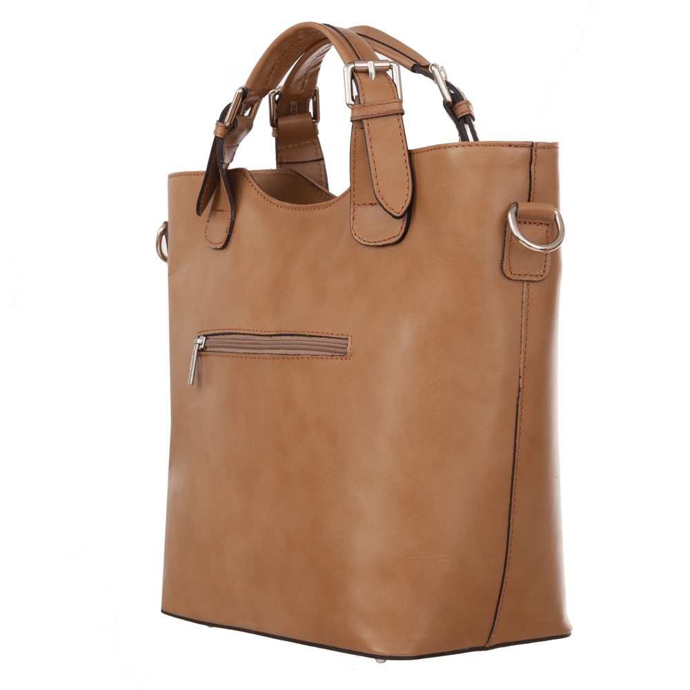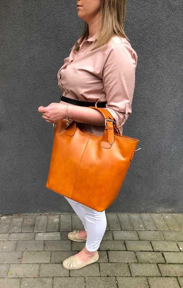 GENUINE LEATHER - MADE IN ITALY. Włoska A4 klasyczna, skórzana torebka wykonana z wysokogatunkowej naturalnej skóry licowej. Zamykana na zamek na całej szerokości, w środku mocna, czarna materiałowa podszewka. Torebka jednokomorowa, wewnątrz jedna kieszonka na zamek + dodatkowa kieszonka na telefon lub drobiazgi. Z tyłu pojemna kieszeń na zamek. Torebka od spodu usztywniona i podbita metalowymi nóżkami. Dodatkowy doczepiany pasek o długości 100 cm. Metalowe elementy wykończenia w kolorze srebrnym.