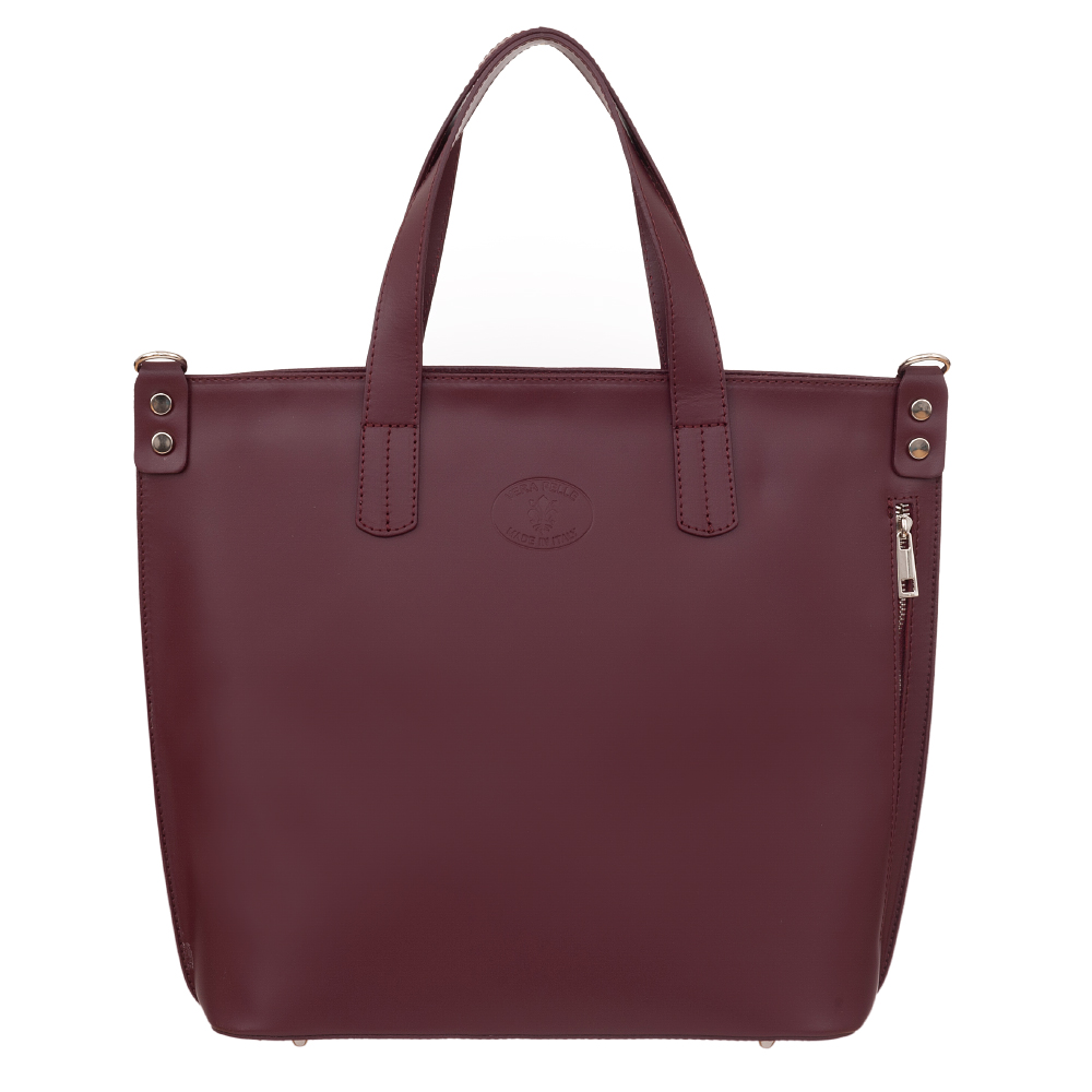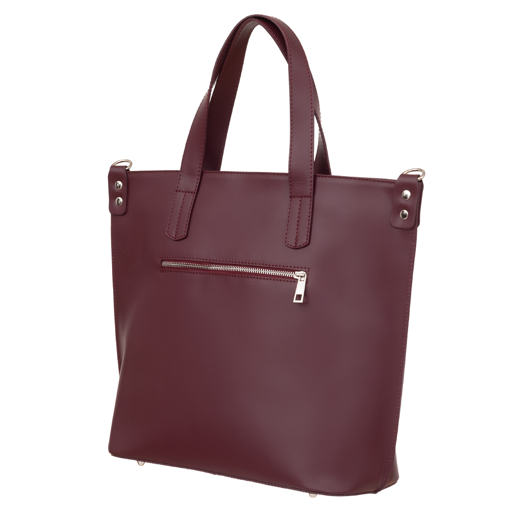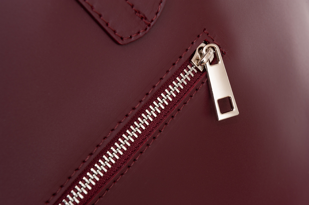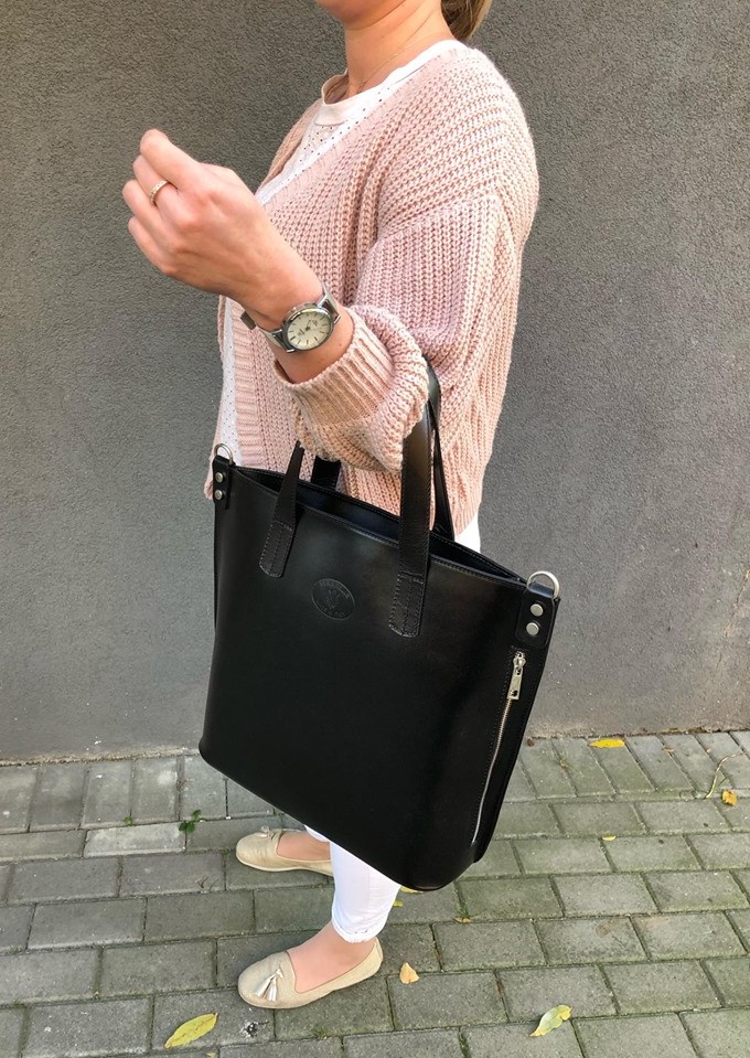 GENUINE LEATHER - MADE IN ITALY. Włoska A4 klasyczna, skórzana torebka wykonana z wysokogatunkowej matowej naturalnej skóry. Zamykana na zamek na całej szerokości, w środku mocna, czarna materiałowa podszewka. Torebka jednokomorowa, wewnątrz 2 x kieszonka na zamek + dodatkowa kieszonka na telefon lub drobiazgi + 2 x mała wsuwna kieszeń. Z tyłu pojemna kieszeń na zamek + pionowa kieszonka z przodu. Torebka od spodu usztywniona i podbita metalowymi nóżkami. Dodatkowy doczepiany pasek o długości 92 cm. Metalowe elementy wykończenia w kolorze srebrnym.
