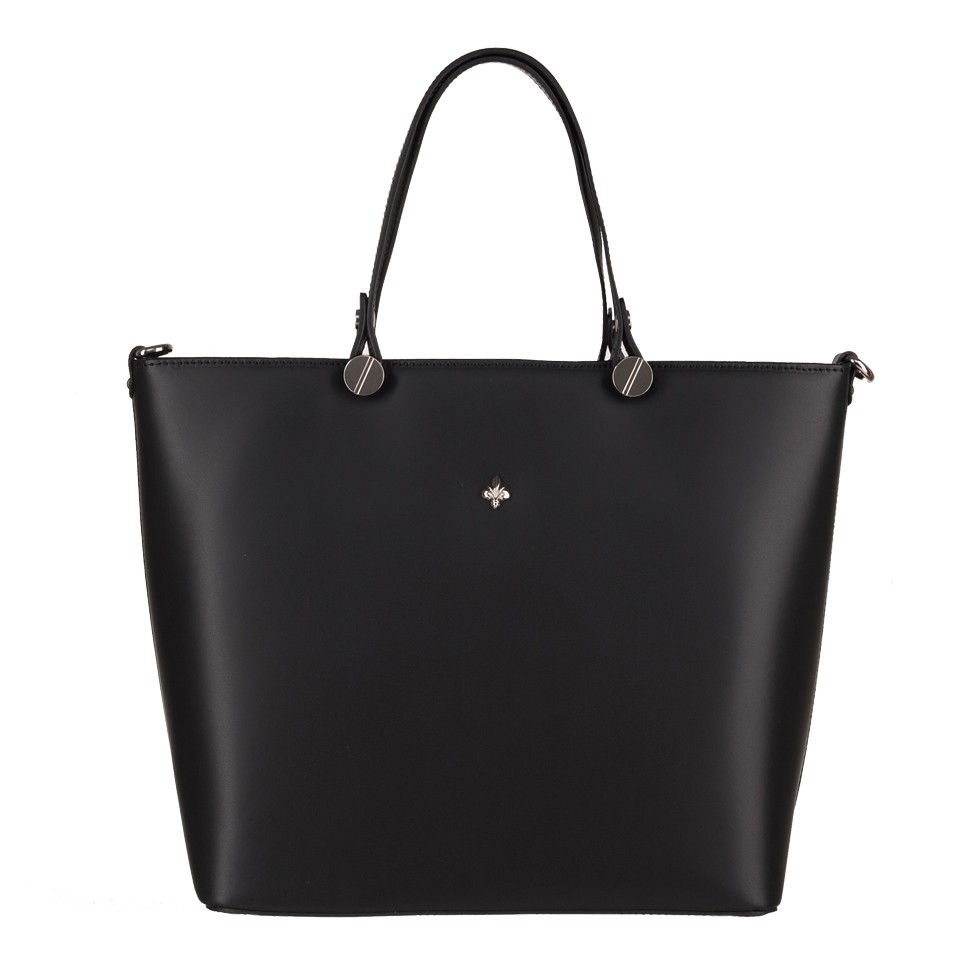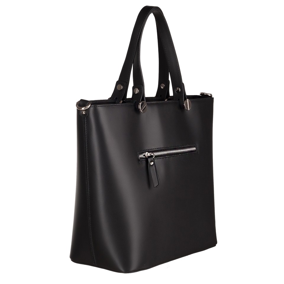 GENUINE LEATHER - MADE IN ITALY. Włoska A4 klasyczna, skórzana torebka wykonana z wysokogatunkowej naturalnej matowej skóry licowej. Zamykana na zamek na całej szerokości, w środku mocna, czarna materiałowa podszewka. Torebka jednokomorowa, wewnątrz jedna kieszonka na zamek + dodatkowa kieszonka na telefon + kieszeń na drobiazgi. Z tyłu pojemna kieszeń na zamek. Torebka od spodu usztywniona i podbita metalowymi nóżkami. Dodatkowy doczepiany pasek o długości 119 cm. Metalowe elementy wykończenia w kolorze srebrnym.