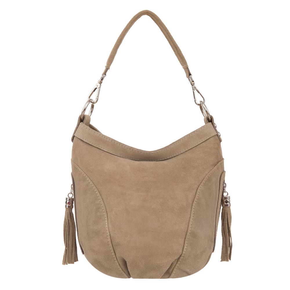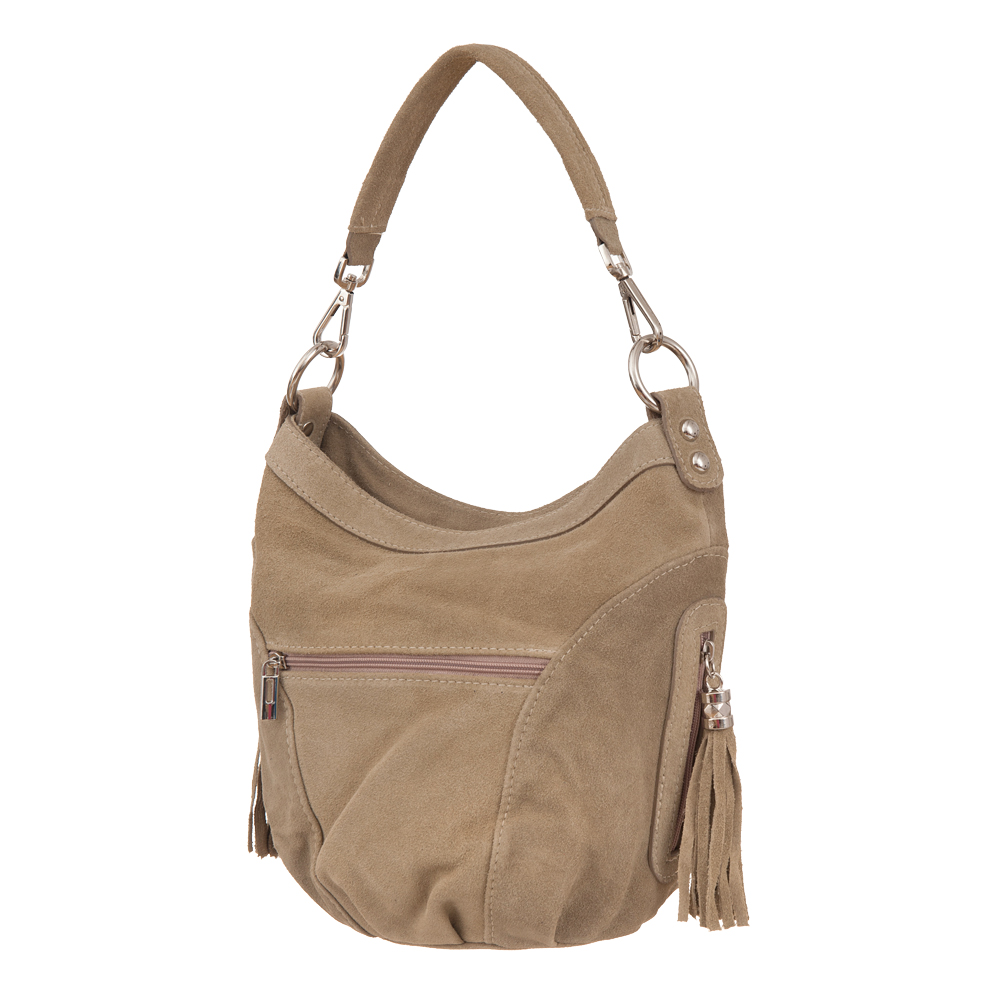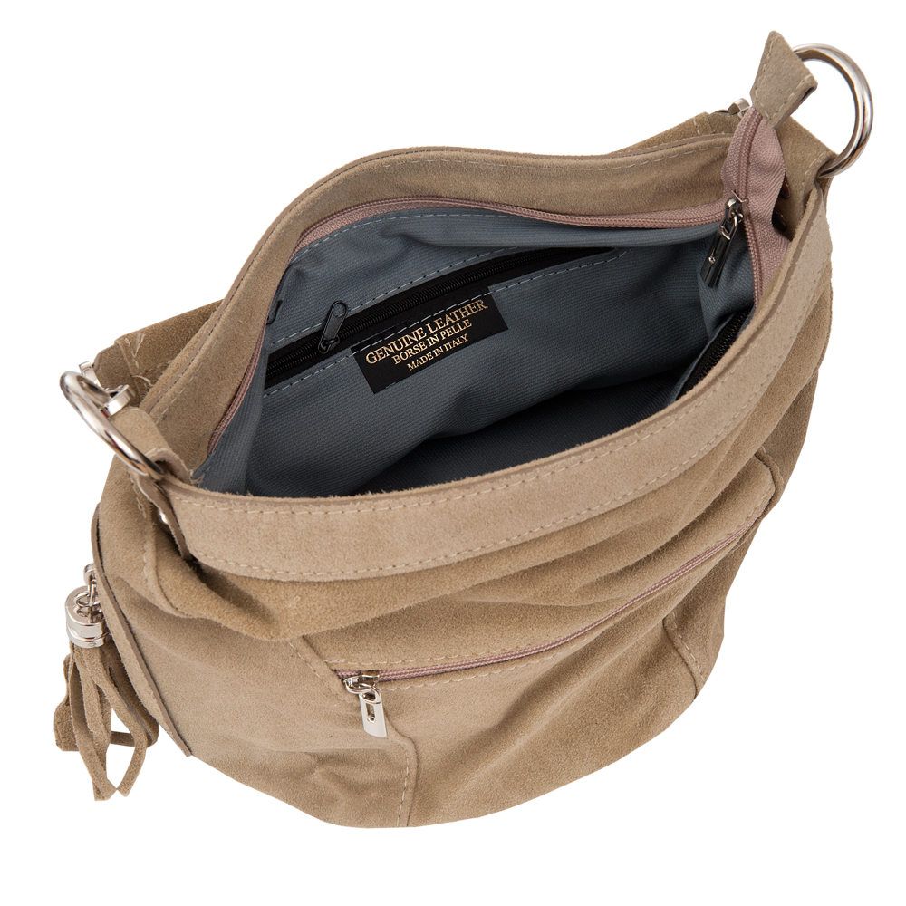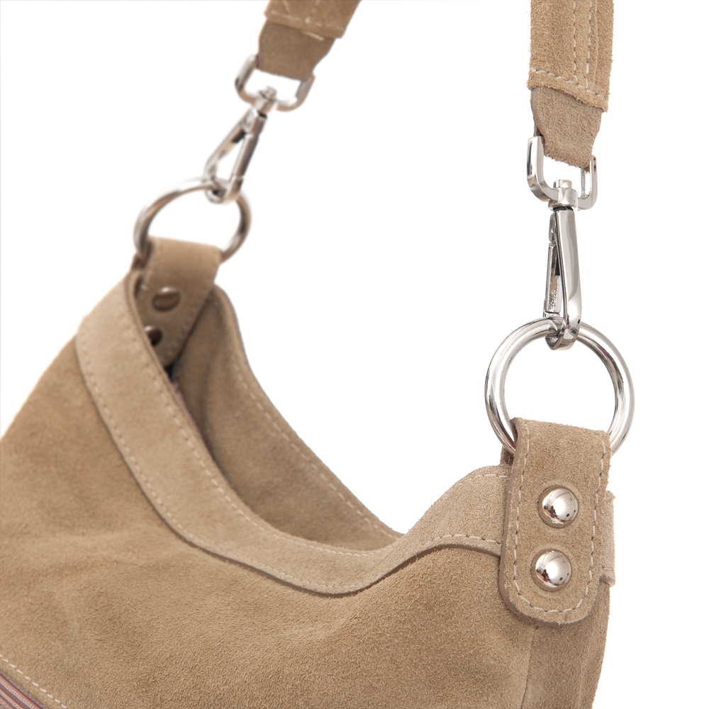 Włoska skórzana torebka worek wykonana w 100% z naturalnej skóry zamszowej. Zamykana z góry na suwak. Torebka dwukomorowa przedzielona dużą kieszenią na suwak. Wewnątrz jedna kieszonka na zamek, jedna na telefon + dodatkowa kieszeń. Dodatkowo z tyłu i po bokach kieszonki na suwak. Wnętrze wykończone trwałą, czarną podszewką. Dodatkowy pasek z możliwością regulacji długości do 115 cm. Możliwość całkowitego wypięcia krótszego ucha.