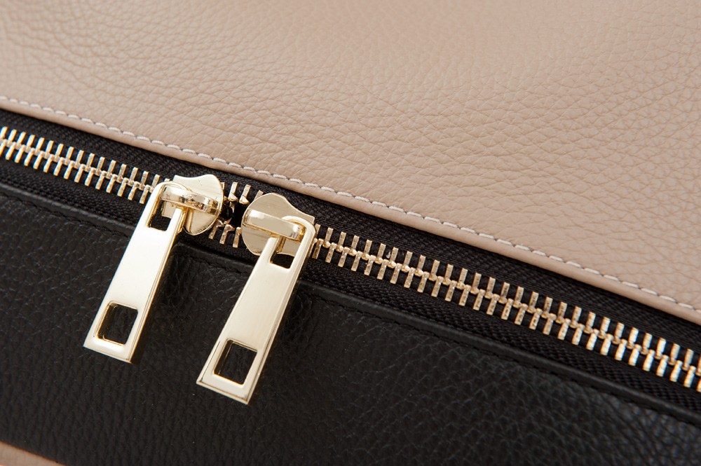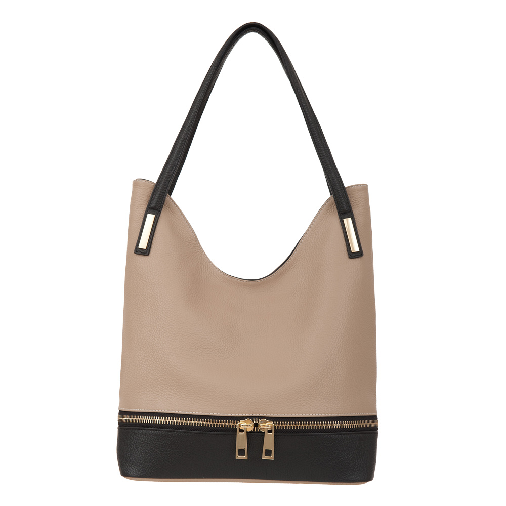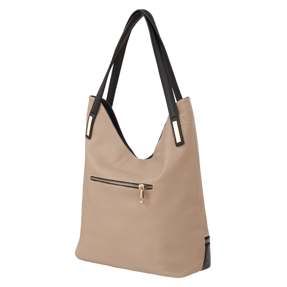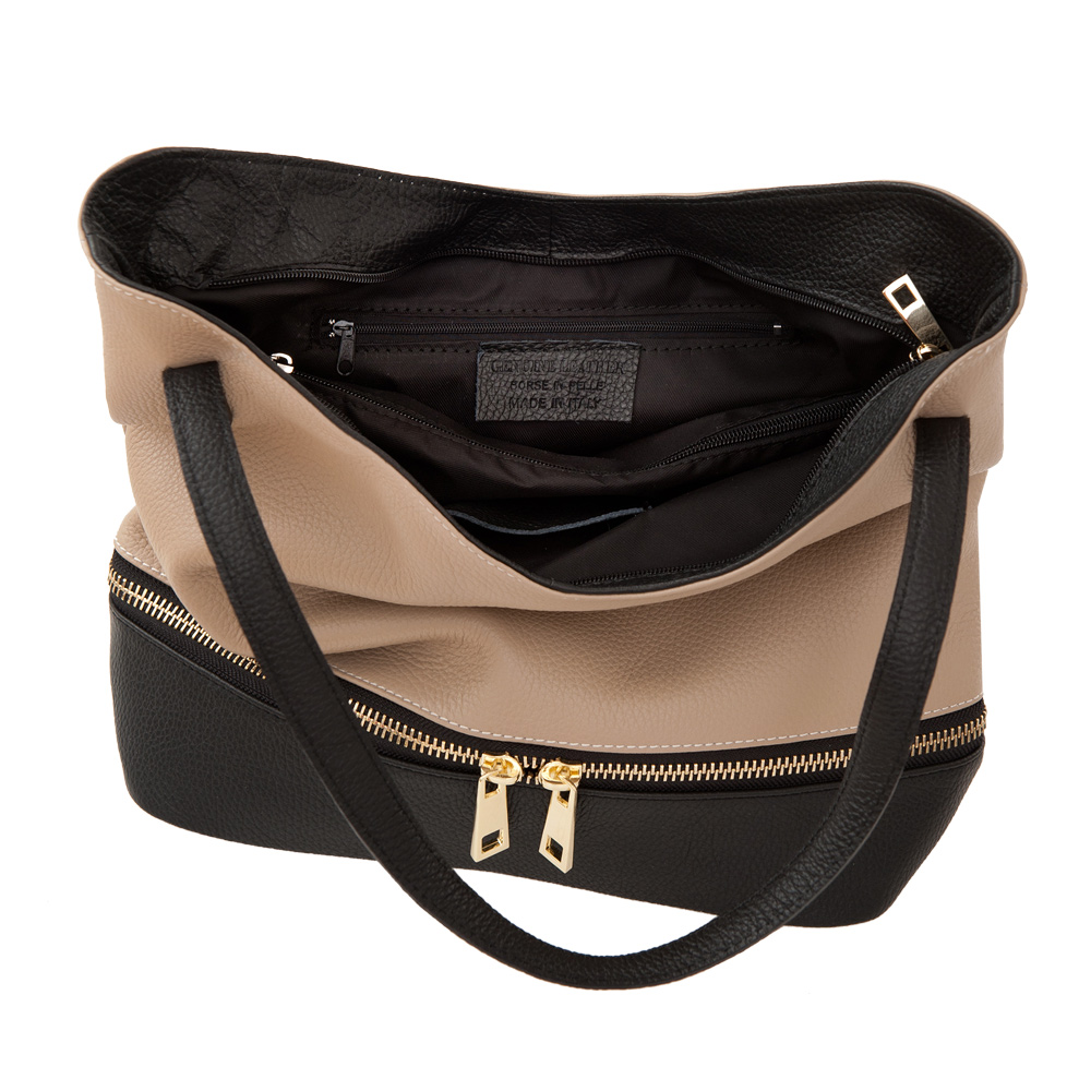 Włoska skórzana torebka / worek wykonana z wysokogatunkowej naturalnej skóry. Zamykana z góry na suwak. Torebka dwukomorowa przedzielona na środku dużą kieszenią na suwak + wewnątrz jedna kieszonka na zamek oraz jedna na telefon. Z tyłu torebki kieszeń na suwak + duża kieszonka z przodu na całej szerokośći. Wnętrze wykończone trwałą, czarną podszewką. Elementy wykończenia w kolorze złotym. Dno usztywnione.