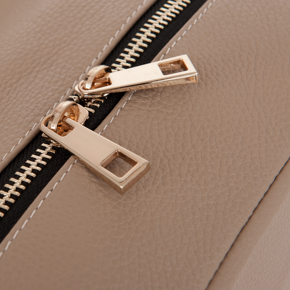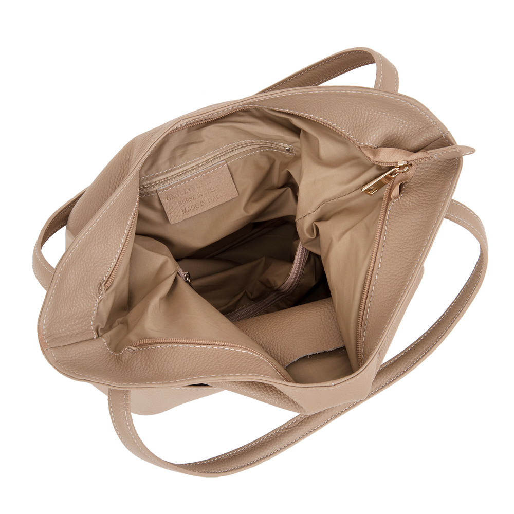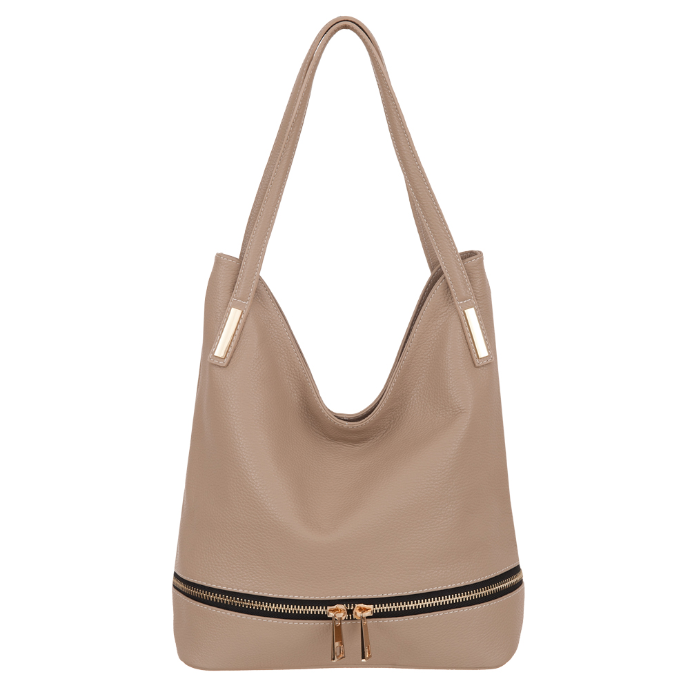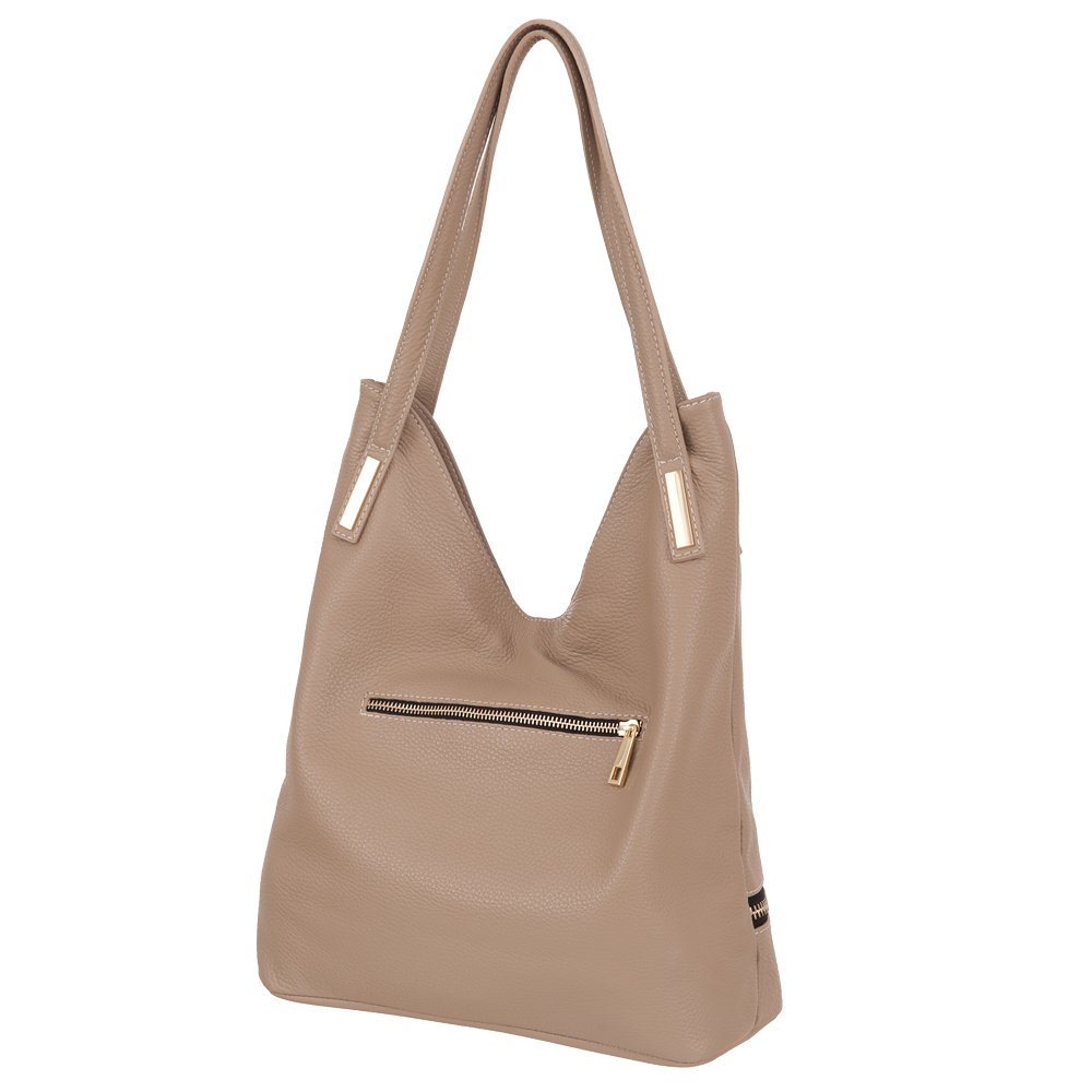 Włoska skórzana torebka / worek wykonana z wysokogatunkowej naturalnej skóry. Zamykana z góry na suwak. Torebka dwukomorowa przedzielona na środku dużą kieszenią na suwak + wewnątrz jedna kieszonka na zamek oraz jedna na telefon. Z tyłu torebki kieszeń na suwak + duża kieszonka z przodu na całej szerokośći. Wnętrze wykończone trwałą, czarną podszewką. Elementy wykończenia w kolorze złotym. Dno usztywnione.