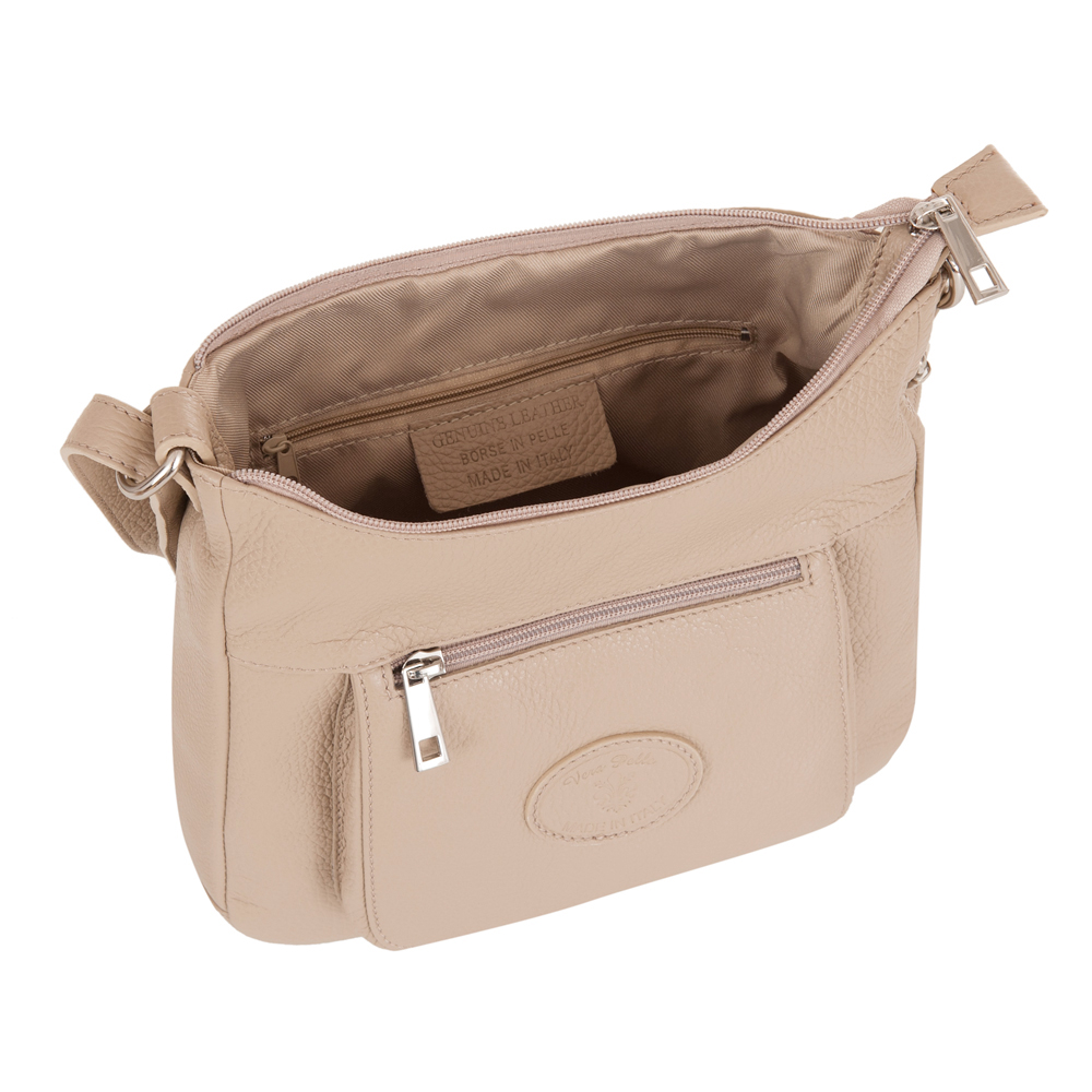 Vera Pelle - Włoska skórzana pojemna listonoszka wykonana z wysokogatunkowej skóry naturalnej. Zamykana szczelnie od góry na zamek na całej szerokości. Torebka jednokomorowa, wewnątrz jedna kieszonka na zamek + dwie wsuwne kieszonki m.in. na telefon. Wnętrze wykończone trwałą , materiałową podszewką. Długi, regulowany pasek umożliwia wygodne noszenie na ramieniu lub przez ramię jako listonoszka. Dodatkowa pojemna kieszeń z tyłu na zamek + kieszonka z przodu. Elementy wykończenia w kolorze srebrnym. Dno lekko usztywnione.