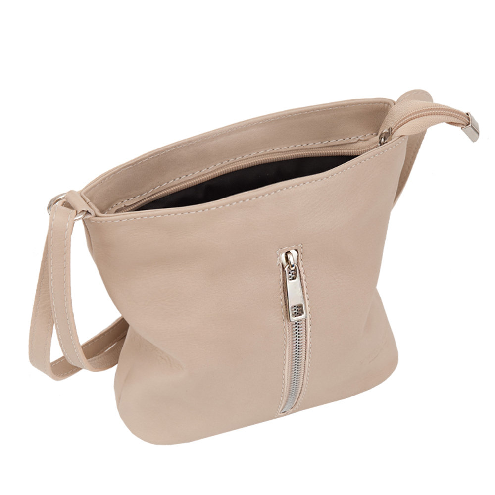 Włoska skórzana duża torebka / listonoszka wykonana z wysokogatunkowej naturalnej miękkiej skóry cielęcej. Zamykana od góry na zamek + klapka. Torebka jednokomorowa, wewnątrz dodatkowo jedna kieszonka na zamek + kieszonka na telefon + z tyłu torebki kieszonka na suwak. Wnętrze wykończone trwałą podszewką. Długi, regulowany pasek umożliwia wygodne noszenie na ramieniu lub przez ramię. Elementy wykończenia w kolorze srebrnym.