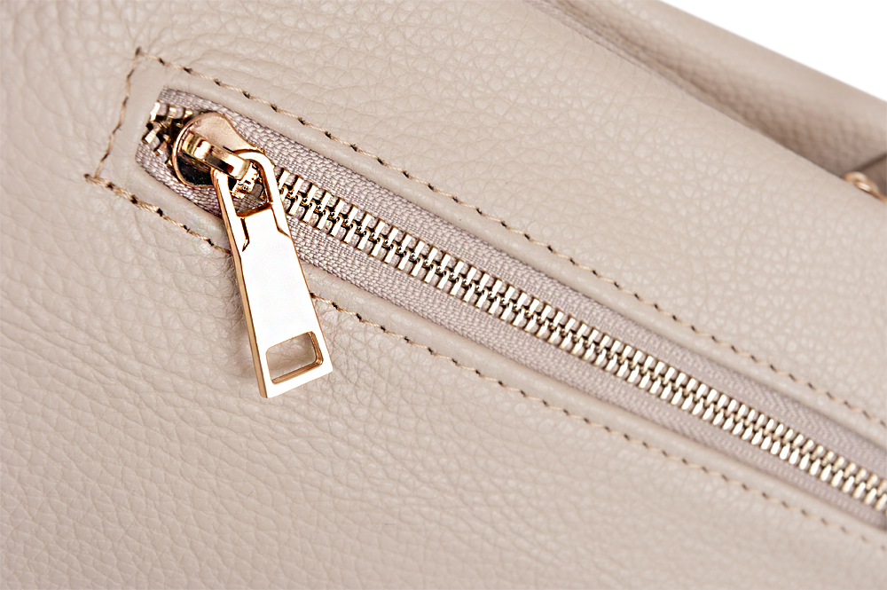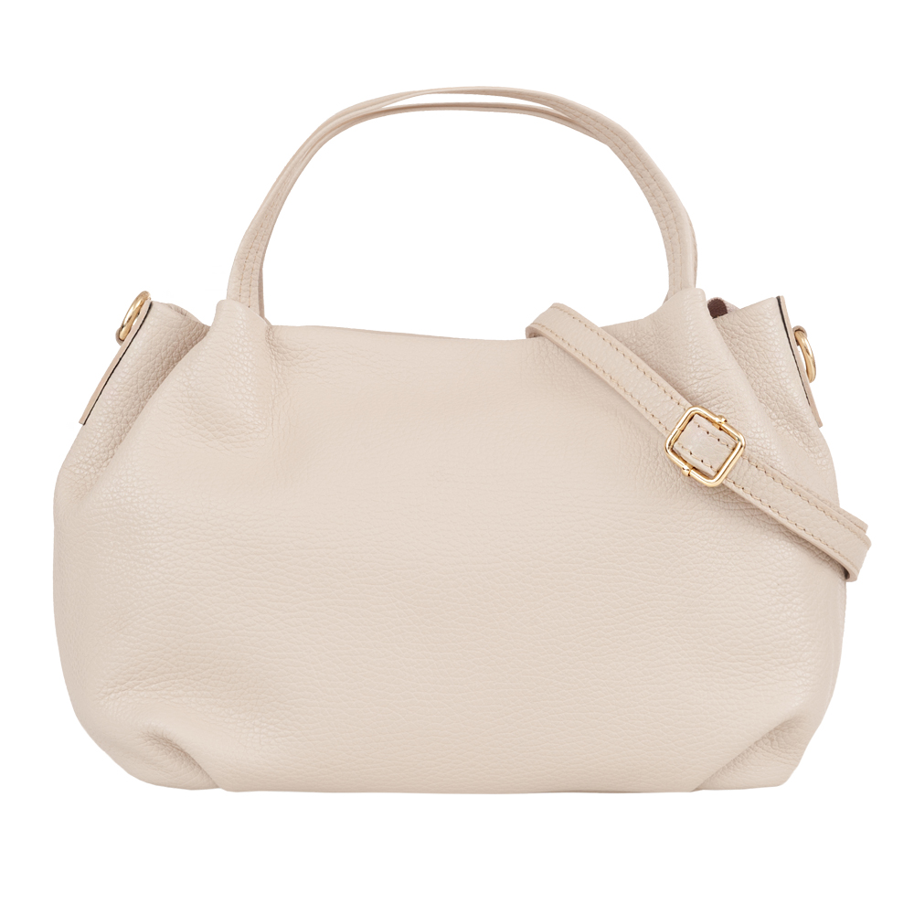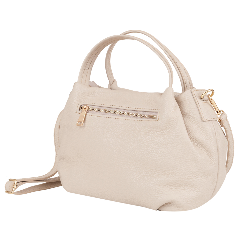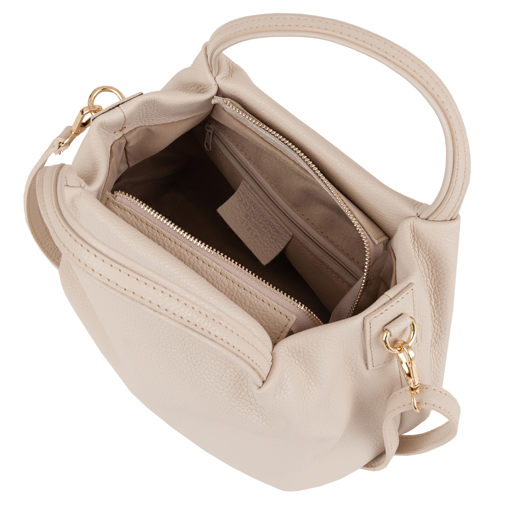 Włoska skórzana torebka wykonana z miękkiej skóry naturalnej. Skóra odporna na zarysowania. Zamykana z góry na suwak. Torebka jednokomorowa + wewnątrz jedna kieszonka na zamek oraz jedna na telefon + kieszeń wsuwna. Dodatkowo z tyłu torebki kieszeń na zamek. Wnętrze wykończone trwałą podszewką dopasowaną pod kolor skóry. Dodatkowy pasek z możliwością regulacji długości 60 - 120 cm. Metalowe elementy w kolorze złotym. Dno lekko usztywnione.