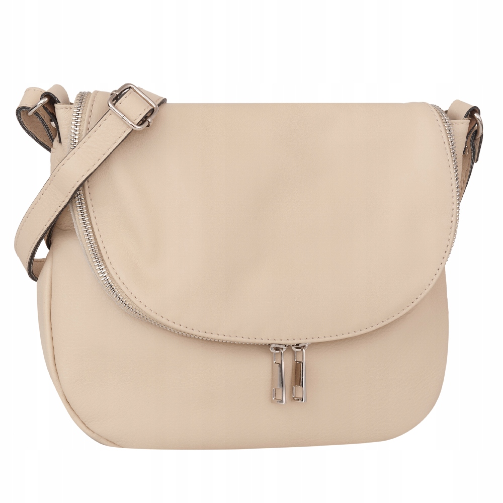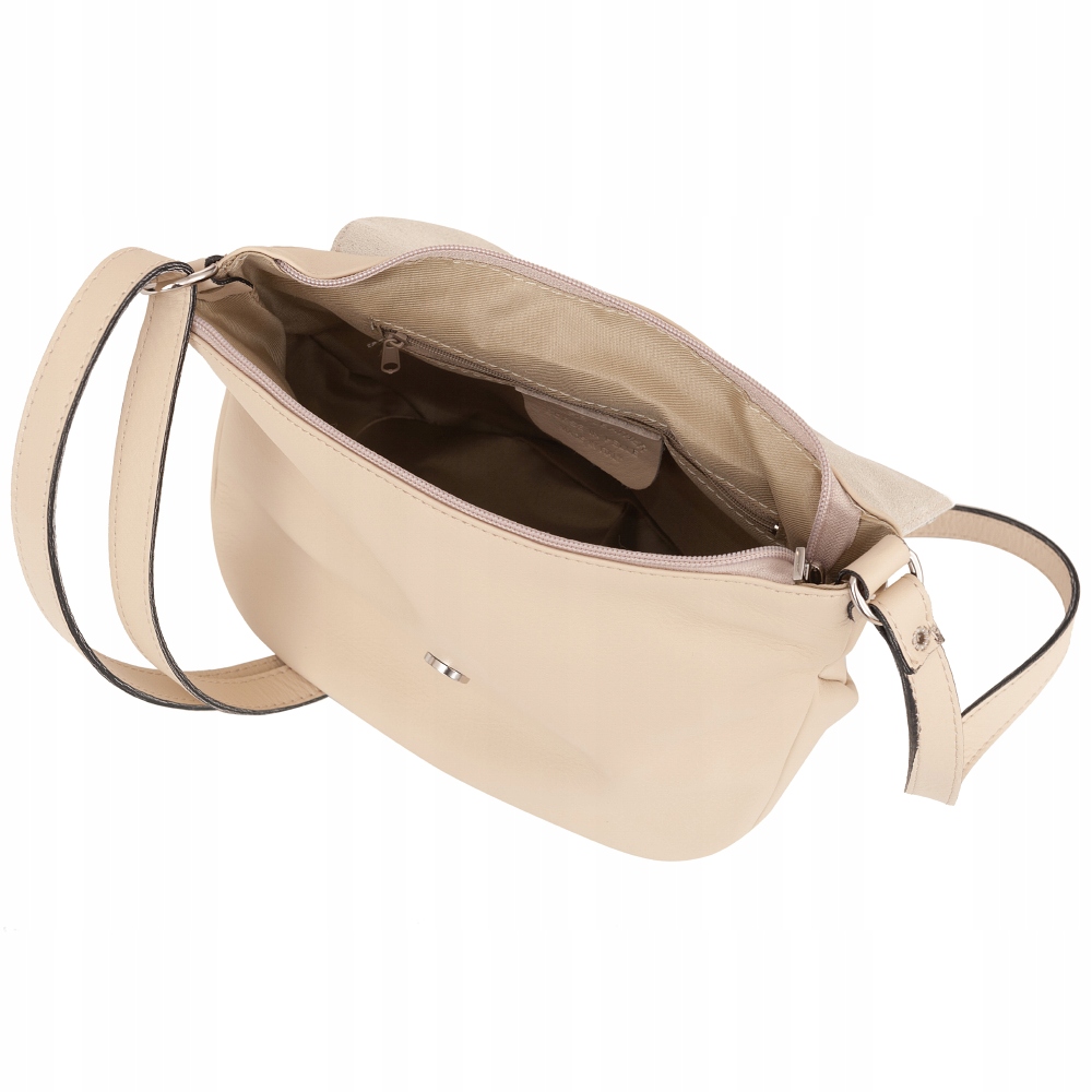 Włoska duża skórzana torebka / listonoszka wykonana z wysokogatunkowej naturalnej gładkiej skóry cielęcej. Zamykana na dużą klapę na magnes (w klapie duża kieszonka) + suwak na całej szerokości torebki. Torebka jednokomorowa, wewnątrz jedna kieszonka na zamek + miejsce na telefon. Wnętrze wykończone trwałą, ciemną podszewką. Długi, regulowany pasek umożliwia wygodne noszenie na ramieniu lub przez ramię. Dodatkowa kieszeń w klapie torebki na suwak.