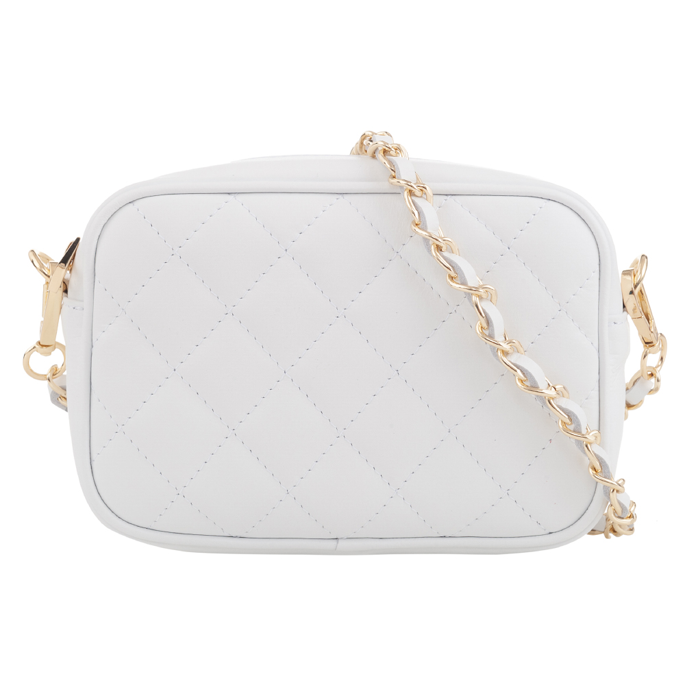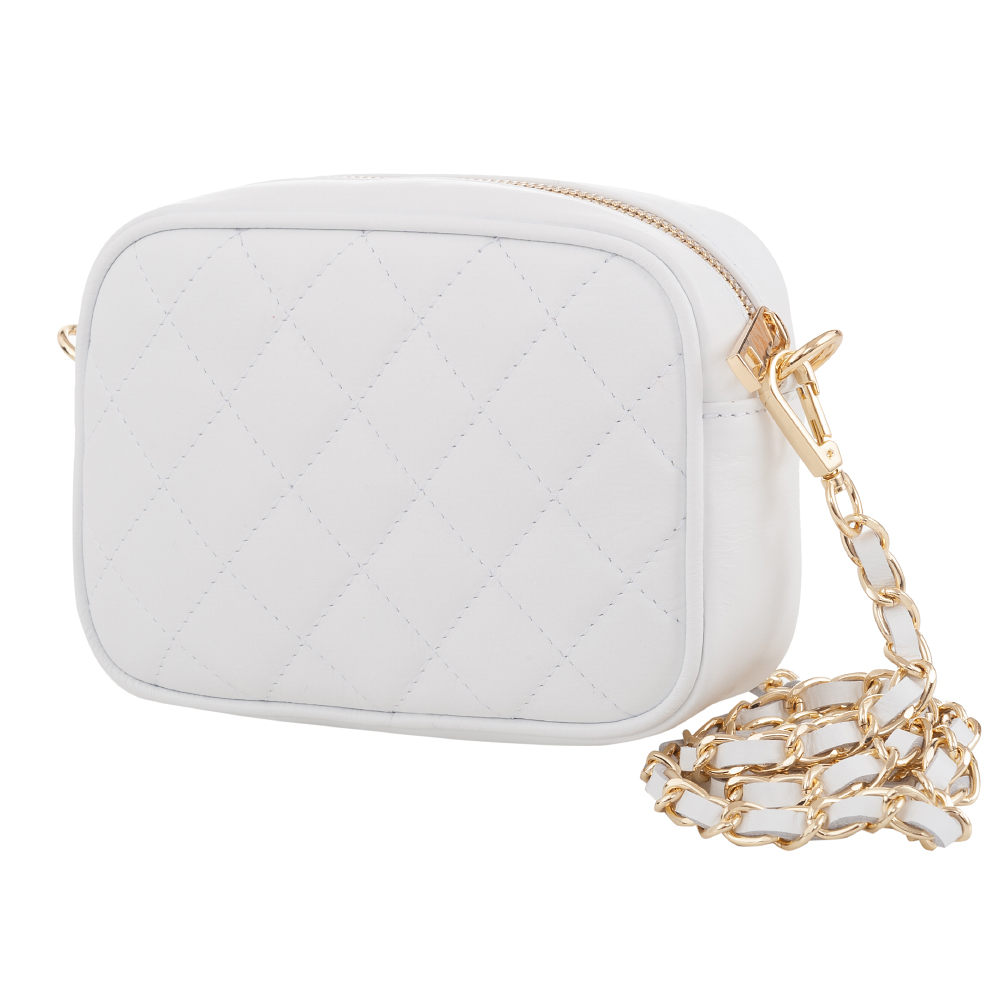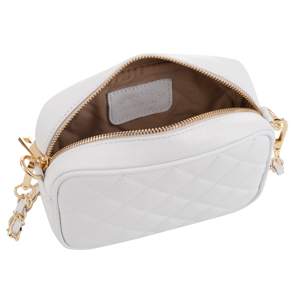 Włoska skórzana pikowana listonoszka wykonana z wysokogatunkowej naturalnej gładkiej skóry cielęcej VERA PELLE. Zamykana z góry na suwak. Torebka jednokomorowa, wewnątrz jedna kieszonka. Wnętrze wykończone trwałą podszewką. Elementy wykończenia w kolorze złotym. Pasek przepleciony naturalną skórą, z możliwością całkowitego odpięcia, dzięki czemu torebkę można nosić jako elegancką kopertówkę.