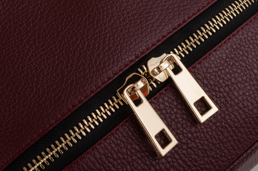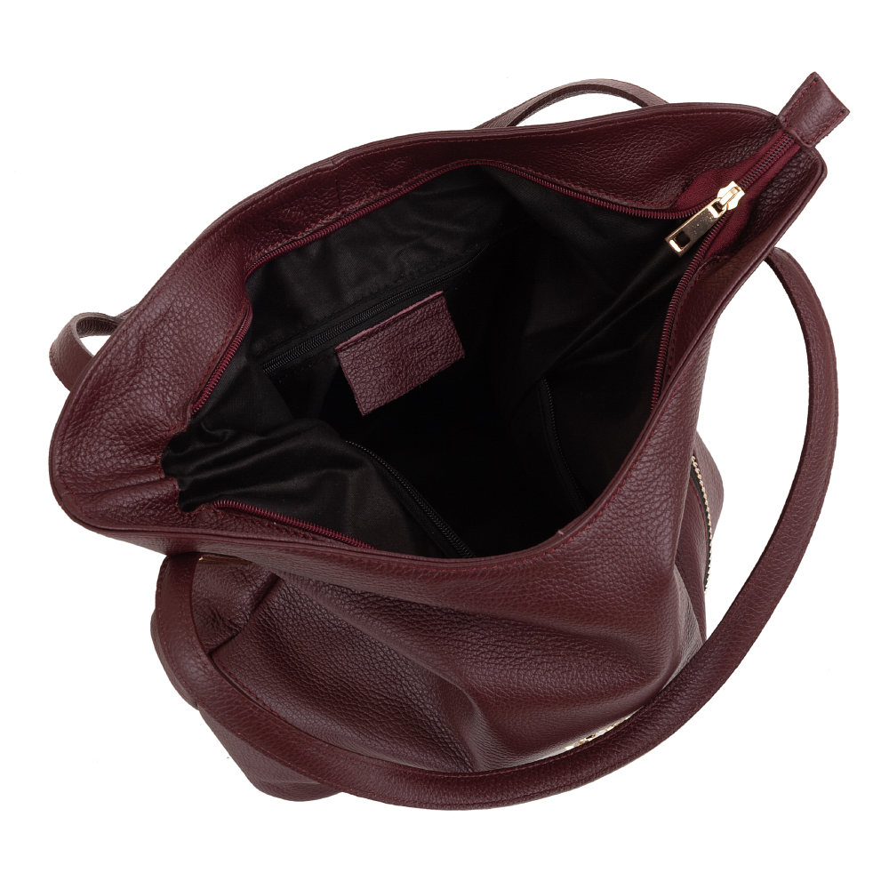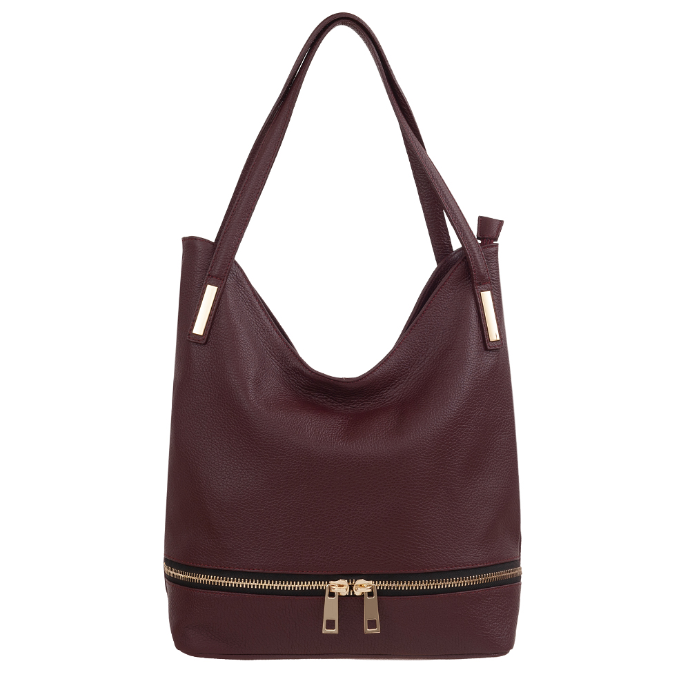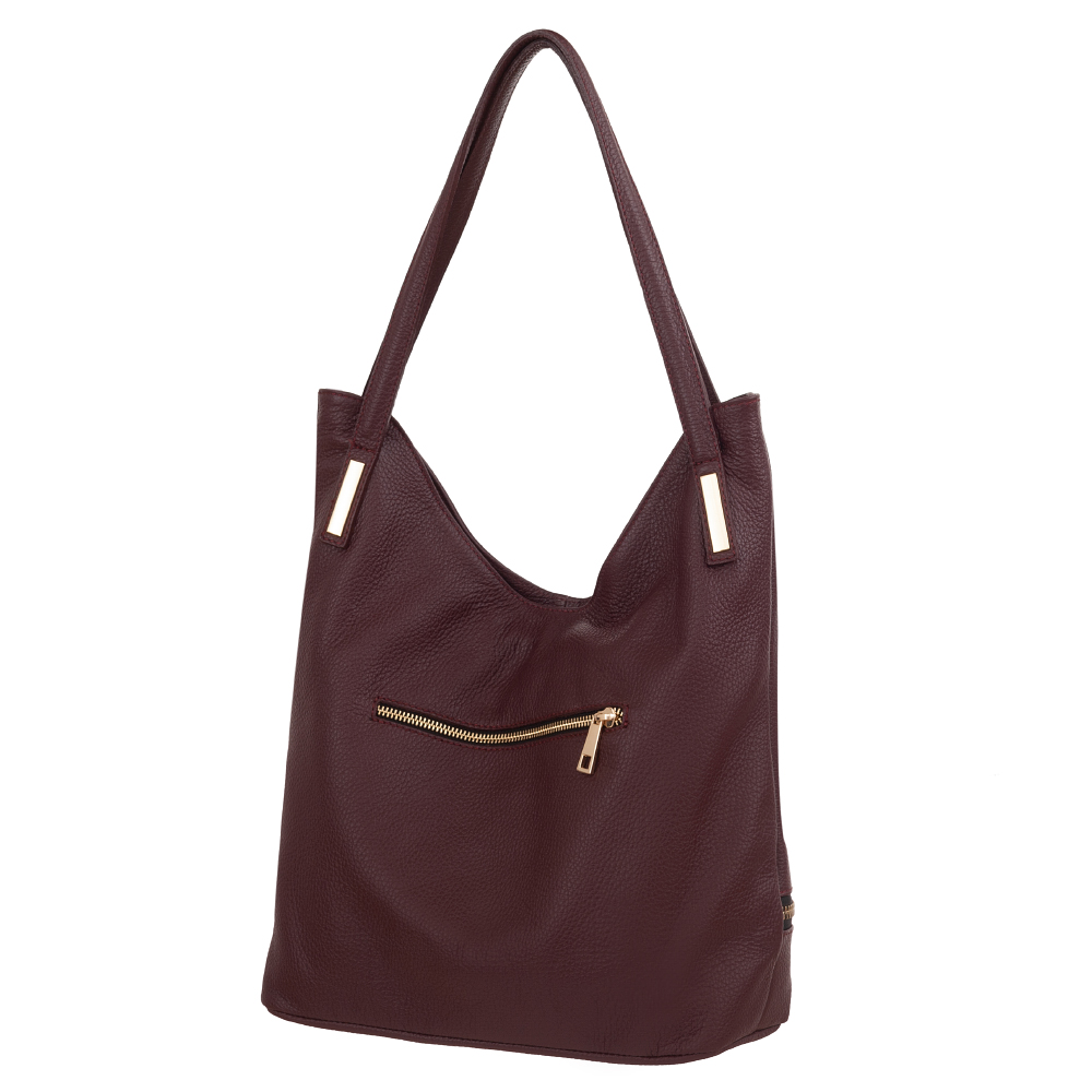 Włoska skórzana torebka / worek wykonana z wysokogatunkowej naturalnej skóry. Zamykana z góry na suwak. Torebka dwukomorowa przedzielona na środku dużą kieszenią na suwak + wewnątrz jedna kieszonka na zamek oraz jedna na telefon. Z tyłu torebki kieszeń na suwak + duża kieszonka z przodu na całej szerokośći. Wnętrze wykończone trwałą, czarną podszewką. Elementy wykończenia w kolorze złotym. Dno usztywnione.