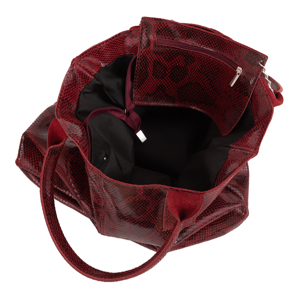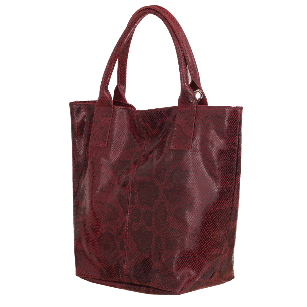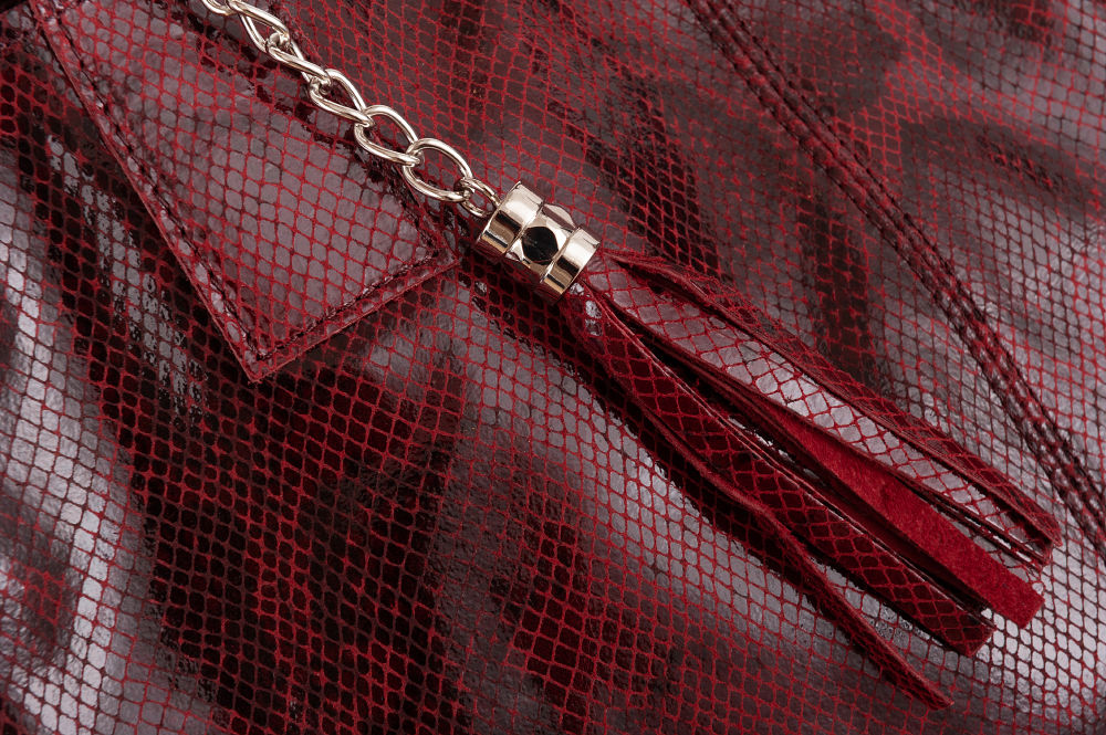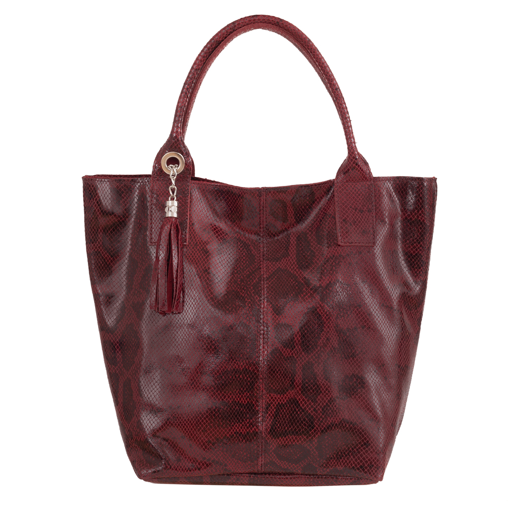 VERA PELLE Włoska skórzana torebka / worek wykonana z miękkiej, wysokogatunkowej naturalnej miękkiej lakierowanej skóry z fakturą łuski. Bardzo oryginalny i praktyczny model. Zamykana z góry na zamek. W środku duża komora wykończona podszewką + kieszonka na zamek + saszetka zamykana na suwak. Elementy wykończenia w kolorze srebrnym. Modny pęk frędzli z przodu torebki.