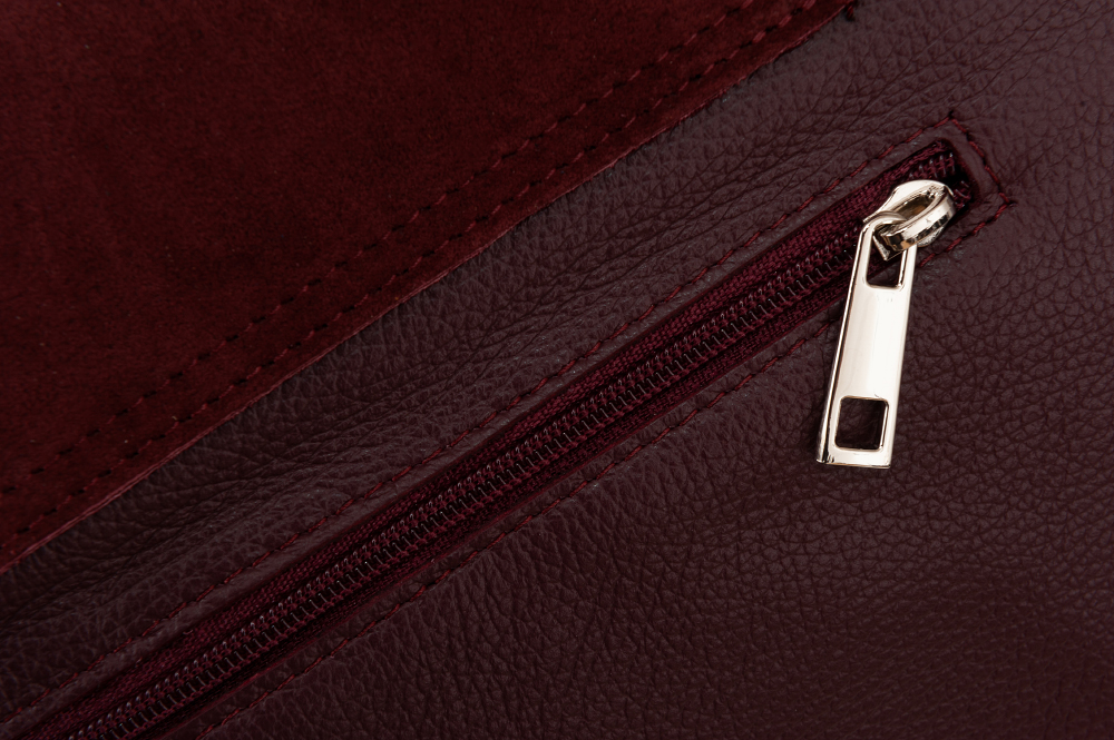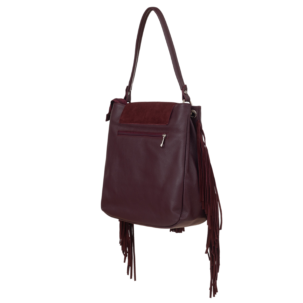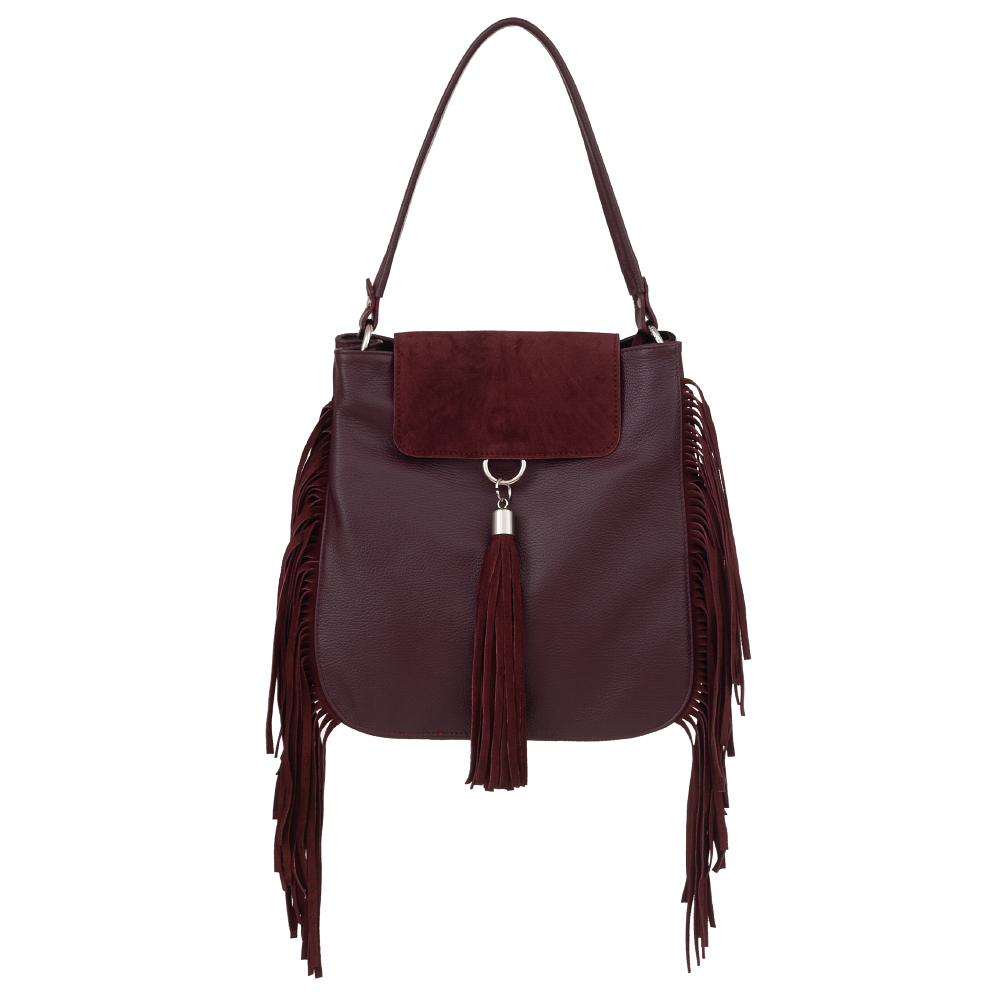 VERA PELLE - Włoska skórzana torebka wykonana z wysokogatunkowej naturalnej skóry licowej łączonej z zamszową klapą i frędzlami. Bardzo oryginalny i praktyczny model. Zamykana z góry na zamek + klapa z magnesem. W środku mocna, materiałowa podszewka. W środku 2 x kieszonka na zamek + miejsce na telefon. Z tyłu kieszeń na zamek. Elementy wykończenia w kolorze srebrnym. Modny pęk frędzli z przodu torebki przy klapie. Swobodnie można nosić ją w dłoni, przedramieniu jak i na ramieniu. W komplecie dodatkowy regulowany pasek do max 120 cm.