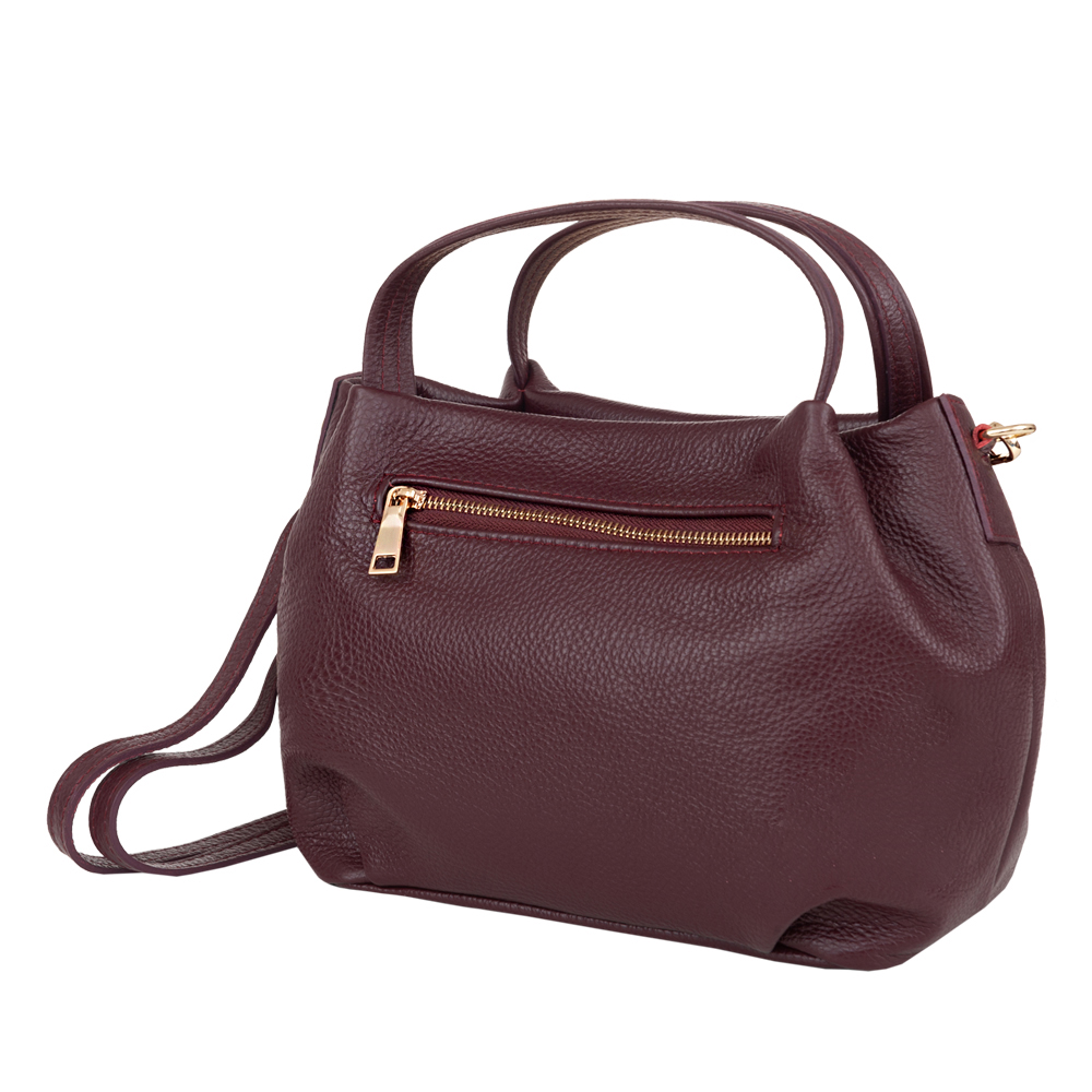 Włoska skórzana torebka wykonana z miękkiej skóry naturalnej. Skóra odporna na zarysowania. Zamykana z góry na suwak. Torebka jednokomorowa + wewnątrz jedna kieszonka na zamek oraz jedna na telefon + kieszeń wsuwna. Dodatkowo z tyłu torebki kieszeń na zamek. Wnętrze wykończone trwałą podszewką dopasowaną pod kolor skóry. Dodatkowy pasek z możliwością regulacji długości 60 - 120 cm. Metalowe elementy w kolorze złotym. Dno lekko usztywnione.