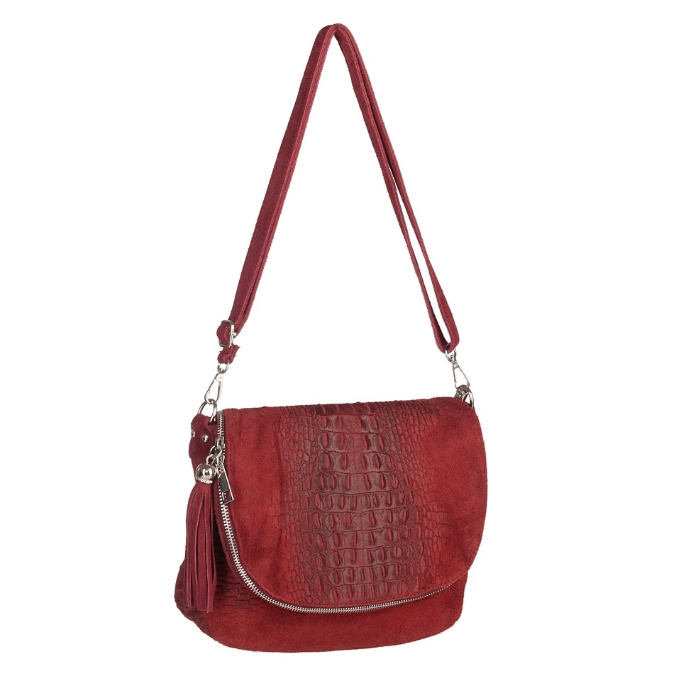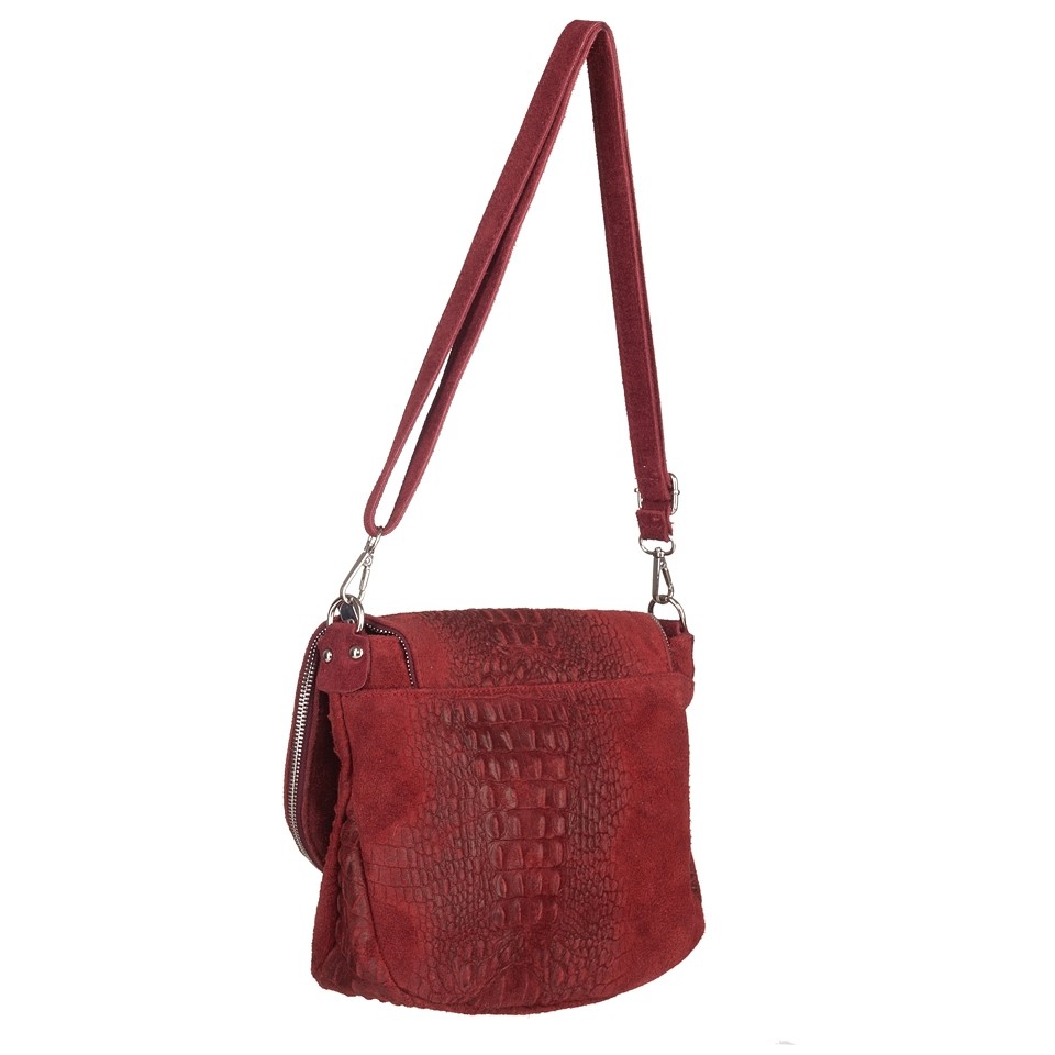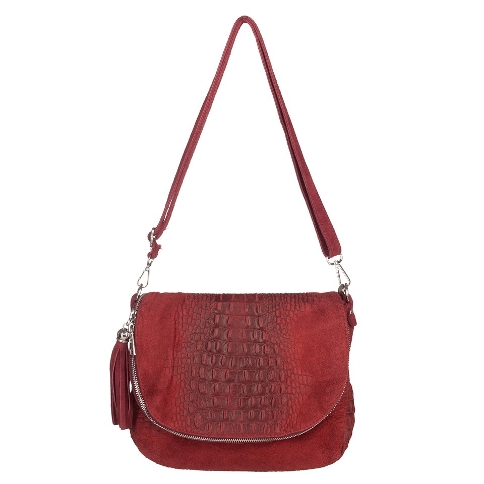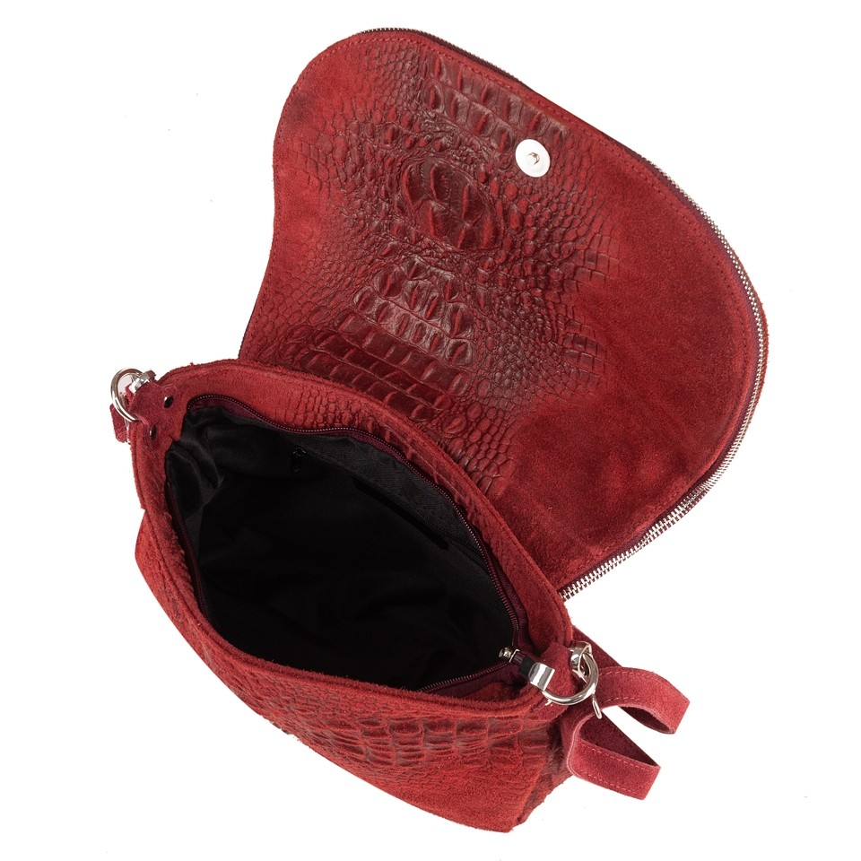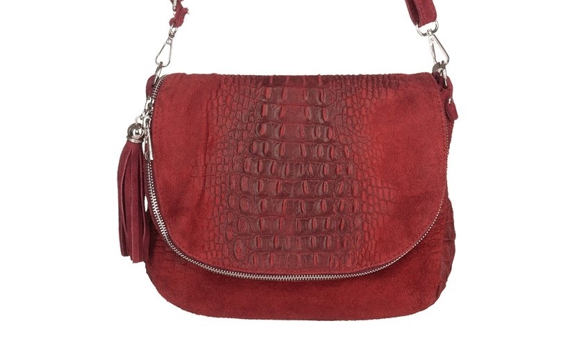 Vera Pelle - Włoska pojemna, modna skórzana listonoszka wykonana z wysokogatunkowej naturalnej skóry z motywem łuski krokodyla łączonej z gładkim zamszem naturalnym. Zamykana na dużą klapę na magnes + suwak. Torebka jednokomorowa, wewnątrz jedna kieszonka na zamek. Wnętrze wykończone trwałą, materiałową podszewką w kolorze czarnym. Długi, regulowany pasek umożliwia wygodne noszenie na ramieniu. Dodatkowa kieszeń w klapie torebki na suwak. Elementy wykończenia w kolorze srebrnym.