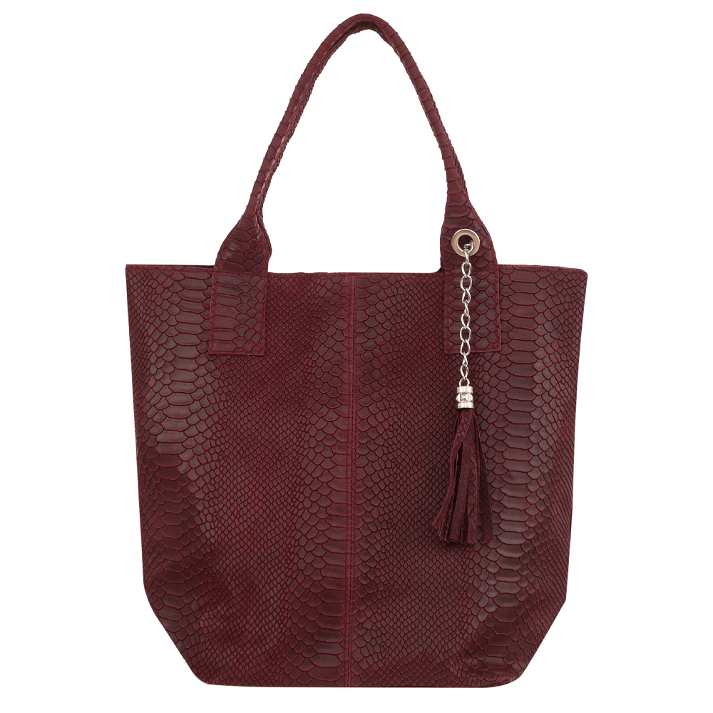 VERA PELLE Włoska skórzana torebka worek wykonana z naturalnej skóry z motywem łuski krokodyla. Bardzo oryginalny i praktyczny model. Zamykana z góry na zamek. W środku mocna, materiałowa podszewka. Kieszonka na suwak + saszetka na suwak w środku + miejsce na telefon. Elementy wykończenia w kolorze srebrnym. Modny pęk frędzli z przodu torebki. Swobodnie można nosić ją w dłoni, przedramieniu jak i na ramieniu.