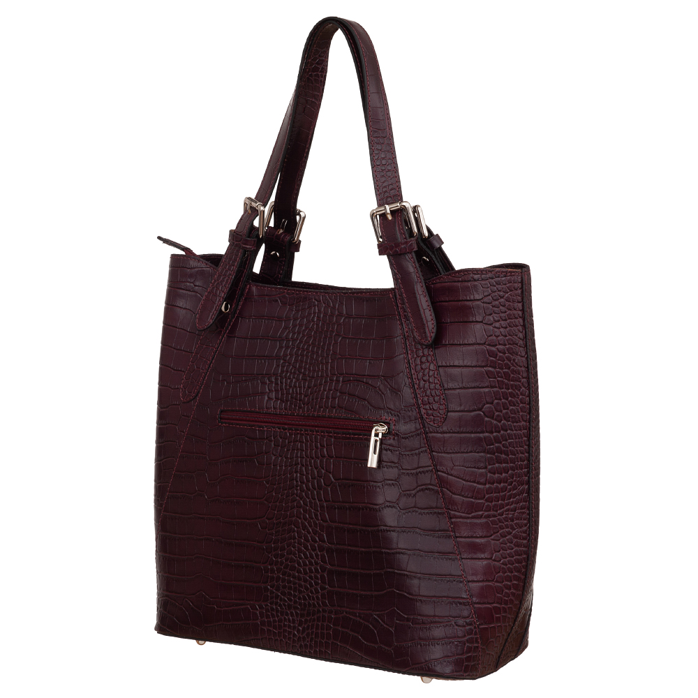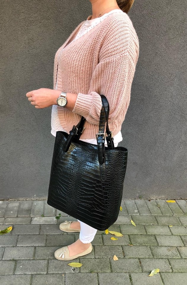 VERA PELLE włoska modna skórzana A4 torebka wykonana z wysokogatunkowej naturalnej skóry z motywem wężowym, łuski krokodyla. Wygodny dostęp do środka. Torebka dwukomorowa, od góry zamykana na suwak. Wewnątrz kieszonka na telefon + kieszonka na zamek + duża kieszeń na środku dzieląca torebkę na 2 komory. Torebka od środka wykończona porządną, materiałową podszewką. Elementy wykończenia w kolorze srebrnym. Z tyłu kieszeń na suwak. Uszy z możliwością regulacji długości. Dno usztywnione i podbite nóżkami, aby nie niszczył się spód.