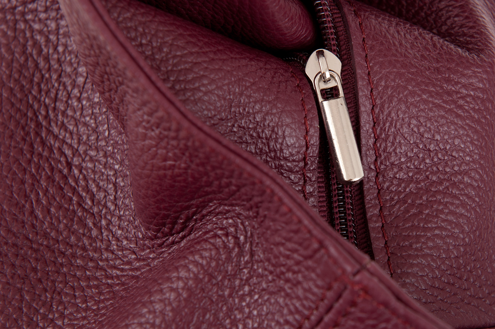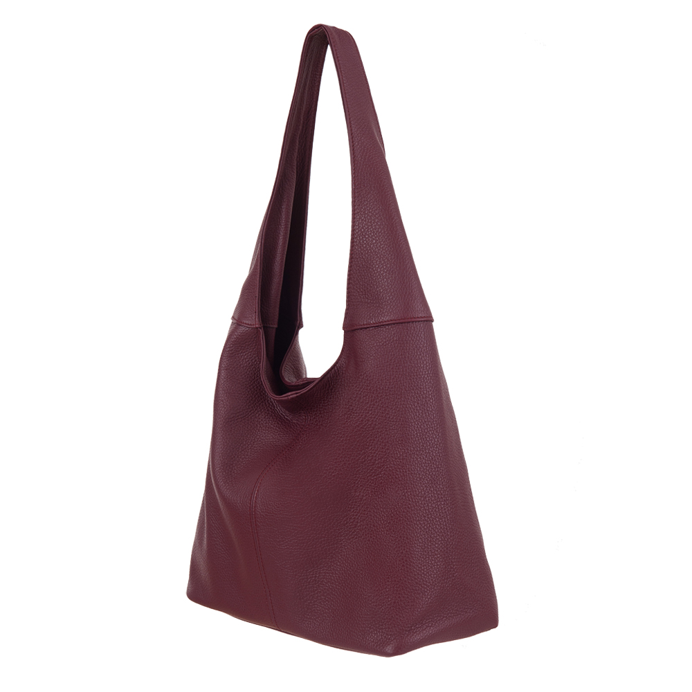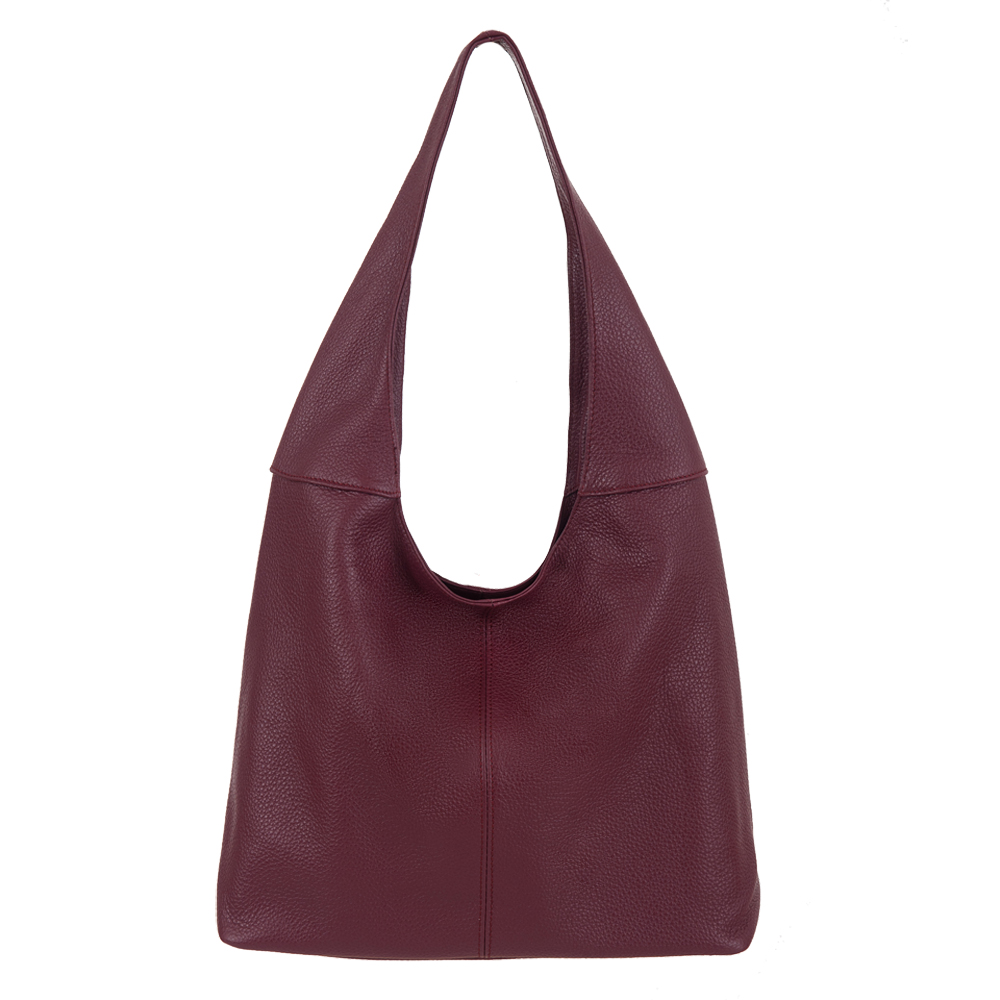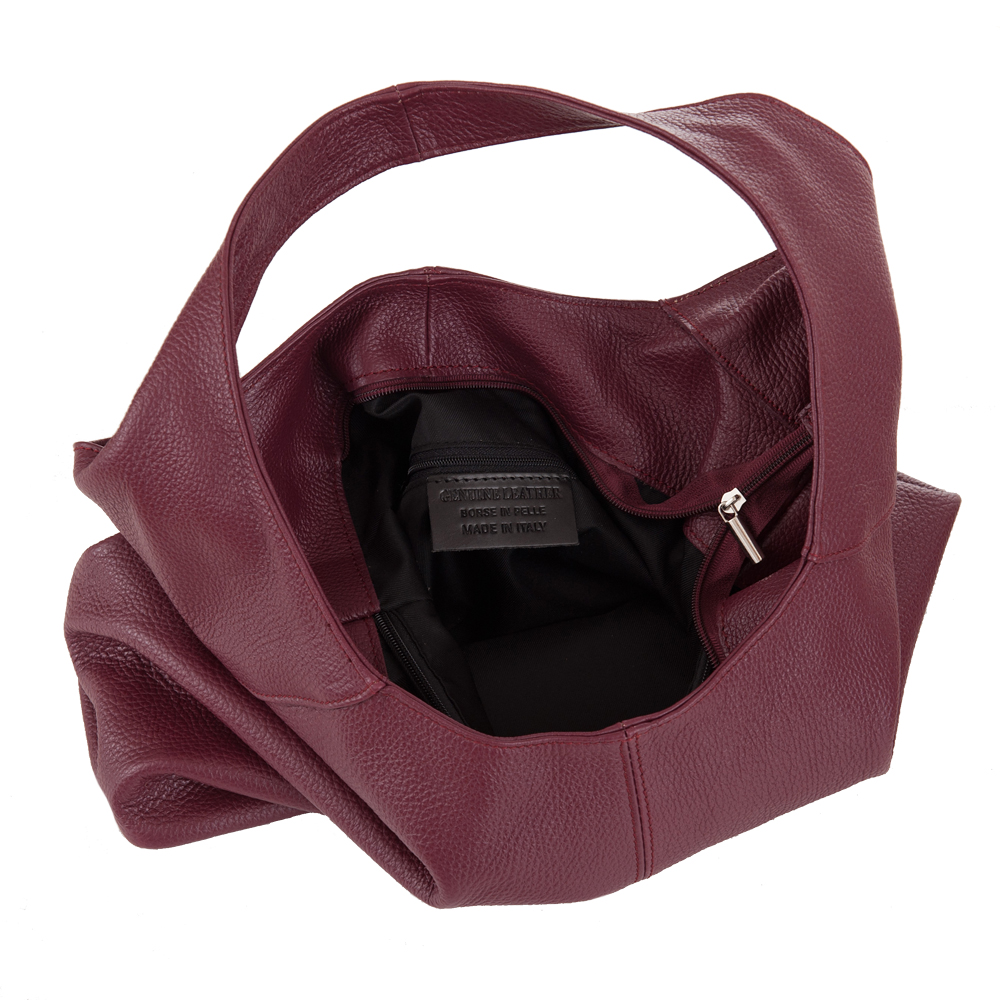 Włoska skórzana torebka / worek wykonana z wysokogatunkowej naturalnej miękkiej skóry. Zamykana z góry na suwak. Torebka dwukomorowa przedzielona na środku dużą kieszenią na suwak + wewnątrz jedna kieszonka na zamek oraz jedna na telefon. Wnętrze wykończone trwałą, czarną podszewką. Torebkę można nosić wygodnie na ramieniu dzięki szerokiemu paskowi.