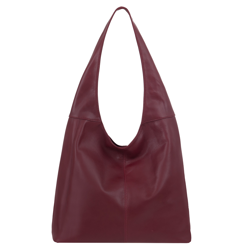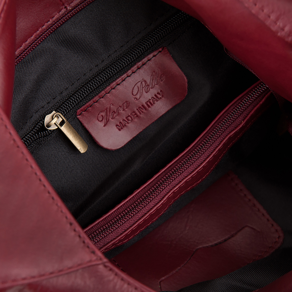 Włoska skórzana torebka / worek wykonana z wysokogatunkowej naturalnej miękkiej skóry. Zamykana z góry na suwak. Torebka dwukomorowa przedzielona na środku dużą kieszenią na suwak + wewnątrz jedna kieszonka na zamek oraz jedna na telefon. Wnętrze wykończone trwałą, czarną podszewką. Szerokie ucho umożliwia wygodne noszenie torebki na ramieniu.