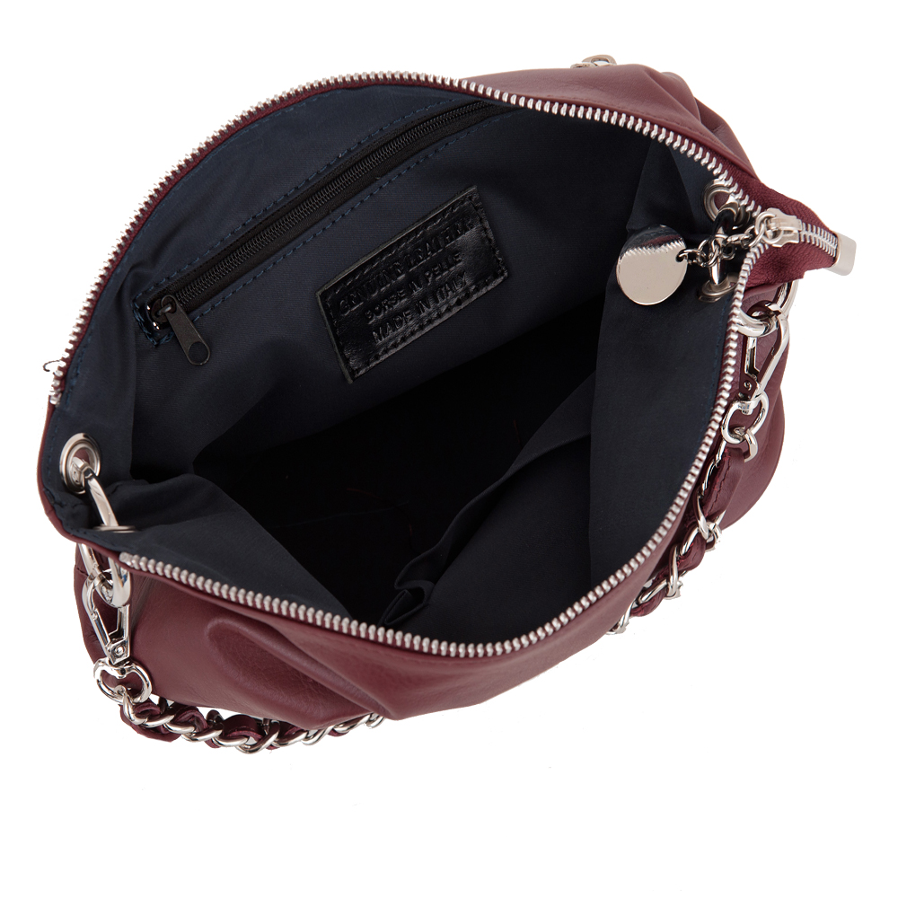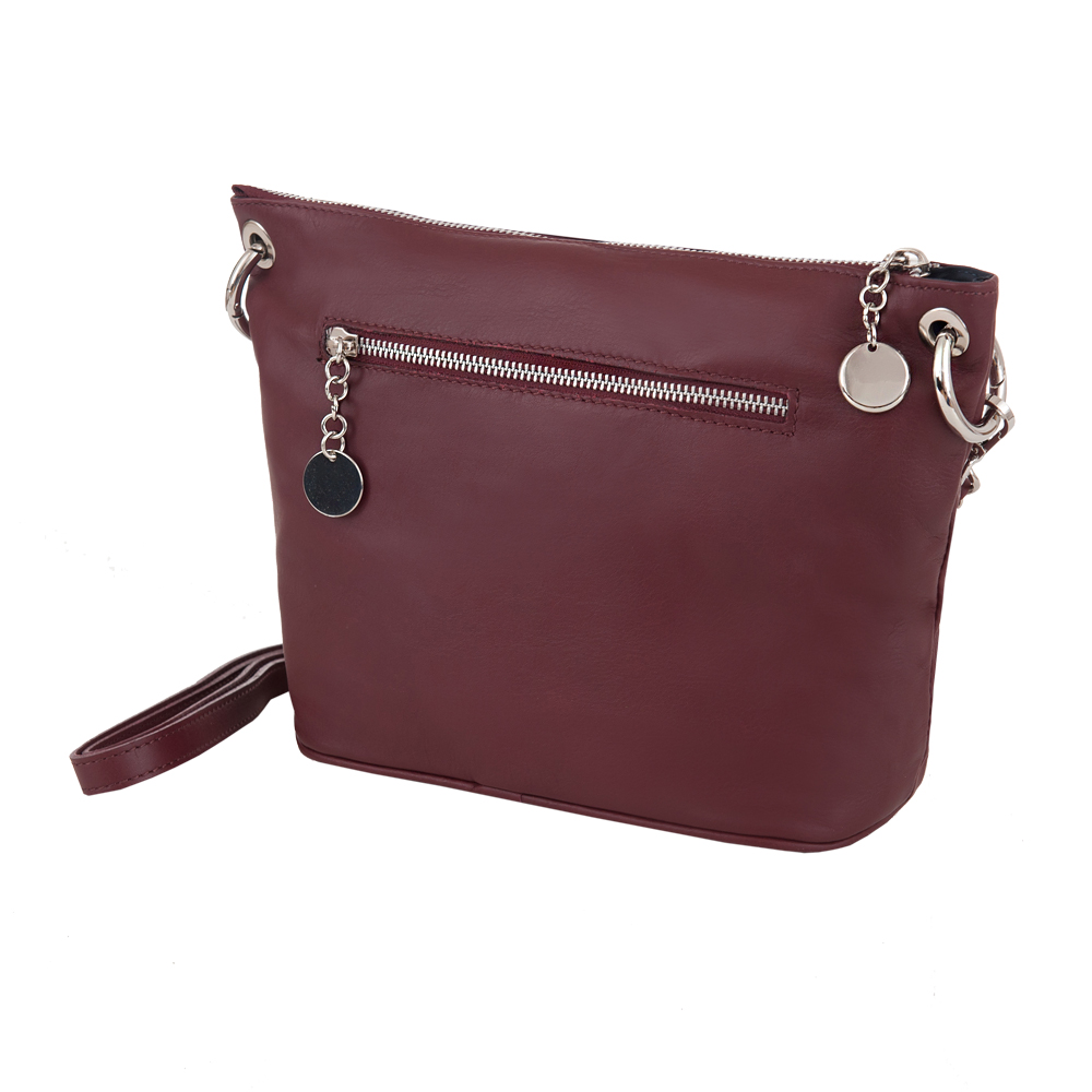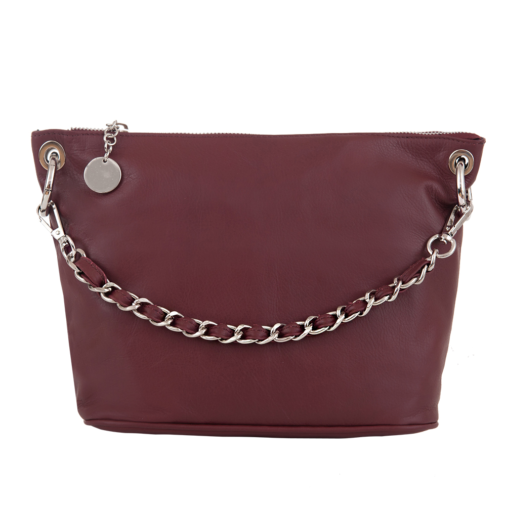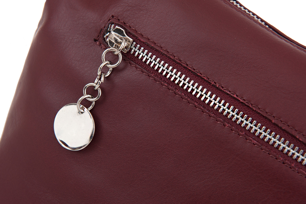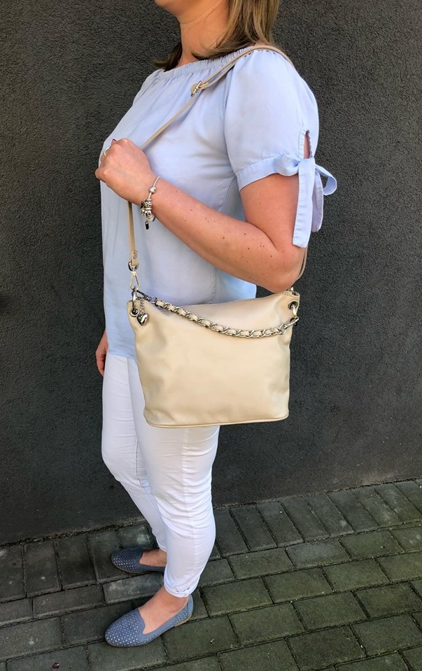 Włoska pojemna miękka skórzana torebka / listonoszka wykonana z naturalnej gładkiej skóry cielęcej. Zamykana od góry na zamek na całej szerokości torebki. Torebka jednokomorowa, wewnątrz jedna kieszonka na zamek + dwie dodatkowe kieszonki. Wnętrze wykończone trwałą, ciemną podszewką. Długi, regulowany pasek umożliwia wygodne noszenie na ramieniu lub przez ramię. Dodatkowa pojemna kieszeń z tyłu na zamek. Elementy wykończenia w kolorze srebrnym. Możliwość noszenia w ręce na łańcuszku ( łańcuszek jest również całkowicie wypinany ). Długi skórzany pasek w komplecie.