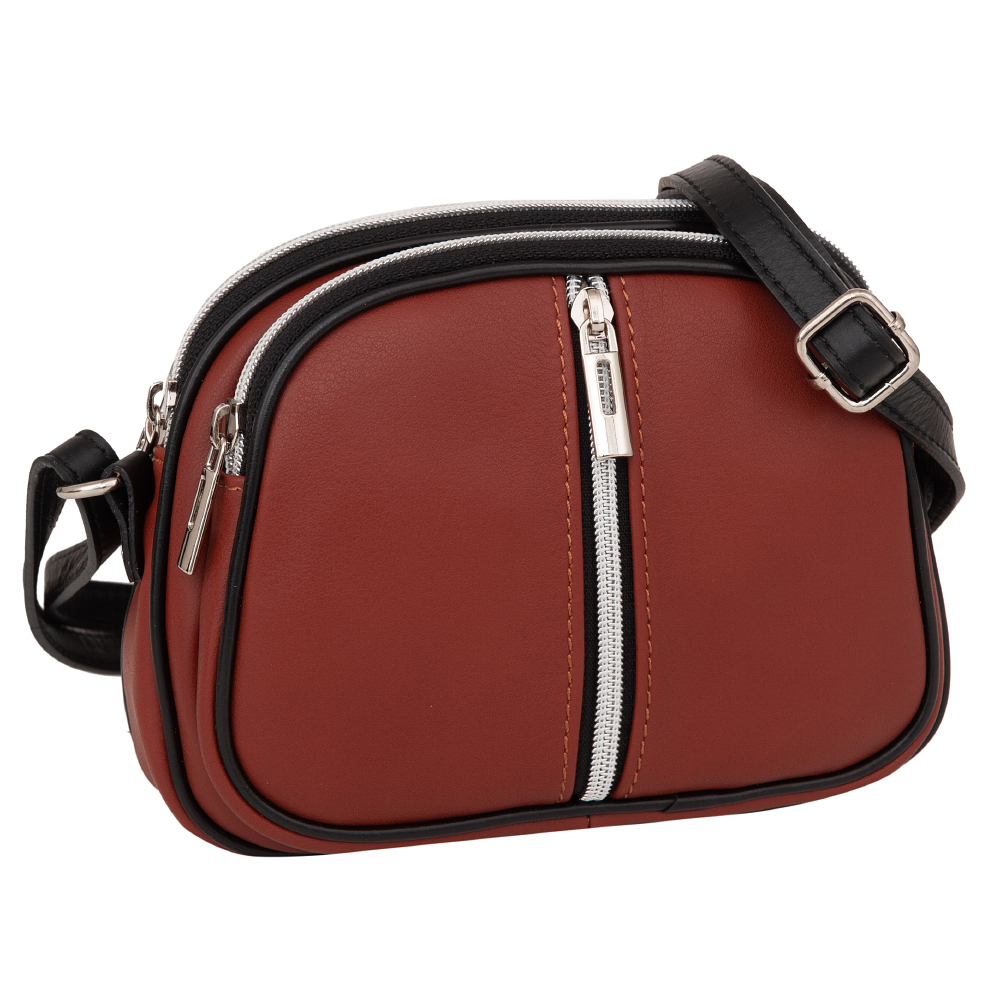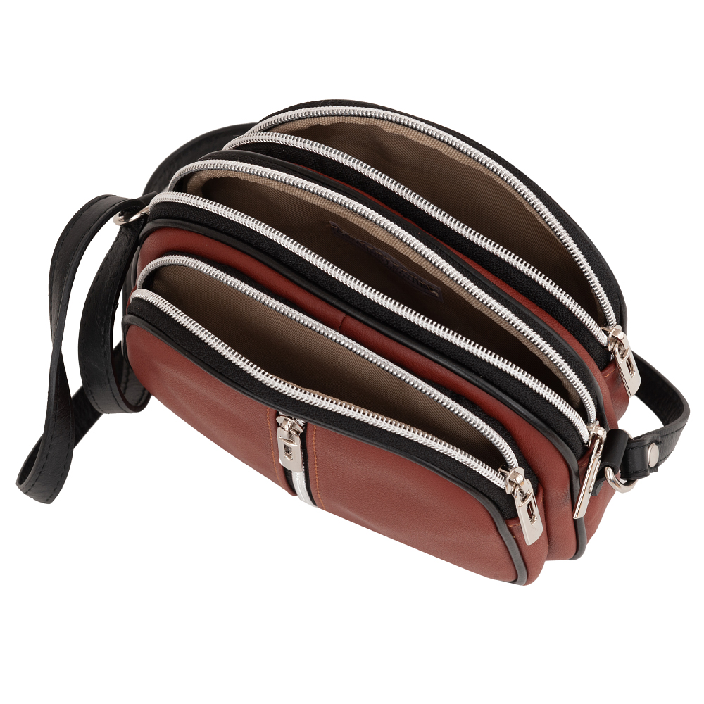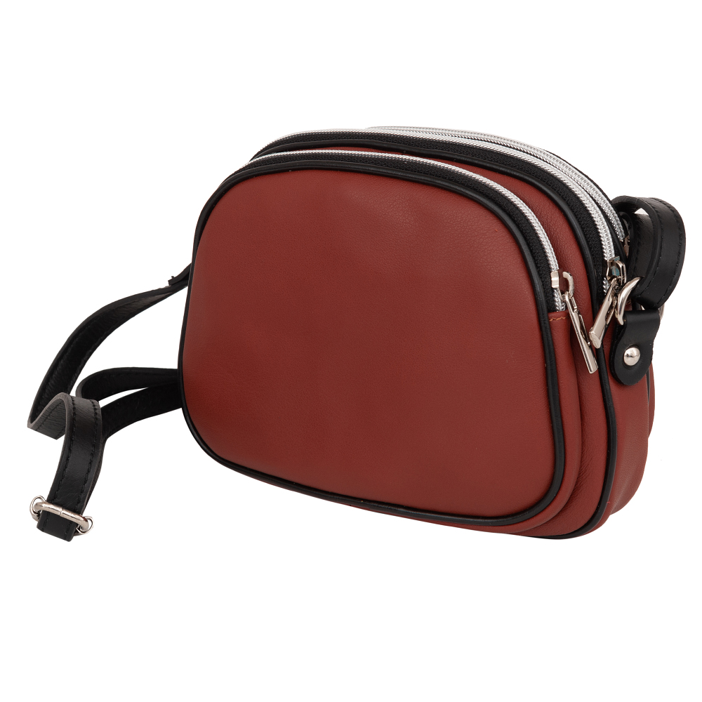 Włoska skórzana listonoszka wykonana z wysokogatunkowej naturalnej gładkiej skóry cielęcej. Zamykana z góry na suwaki. Trzy osobne przegródki zamykane na suwak + pionowa kieszonka na suwak z przodu. Wnętrze wykończone trwałą podszewką. Długi, regulowany pasek umożliwia wygodne noszenie na ramieniu.
