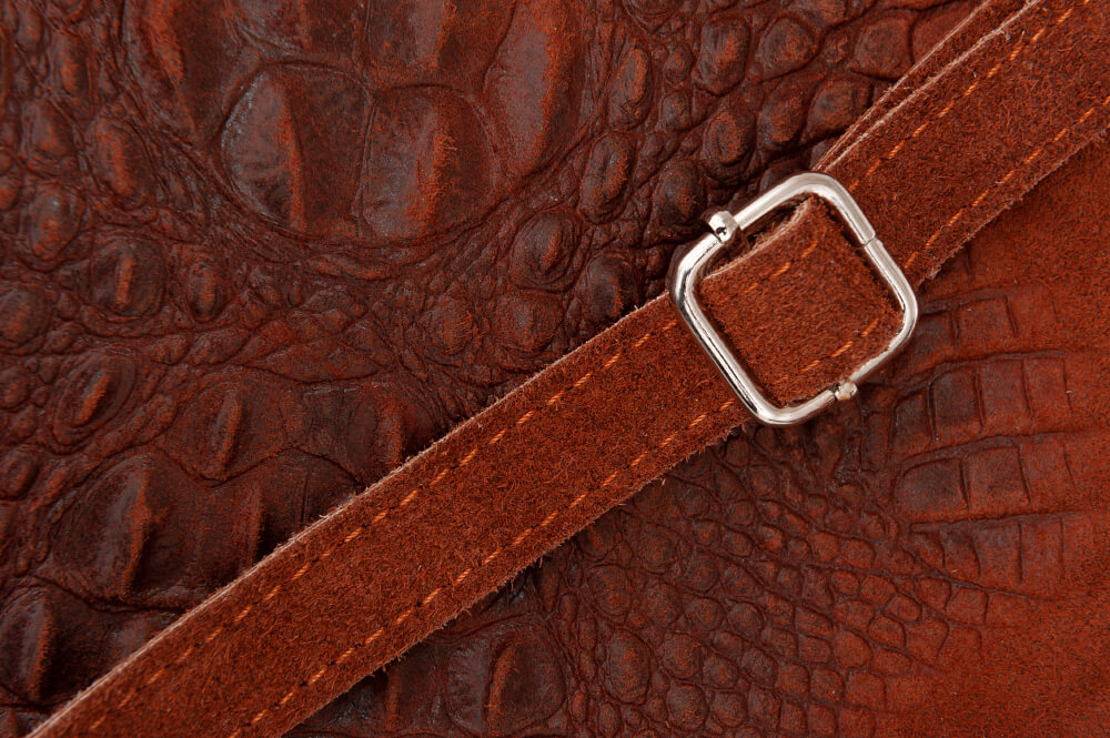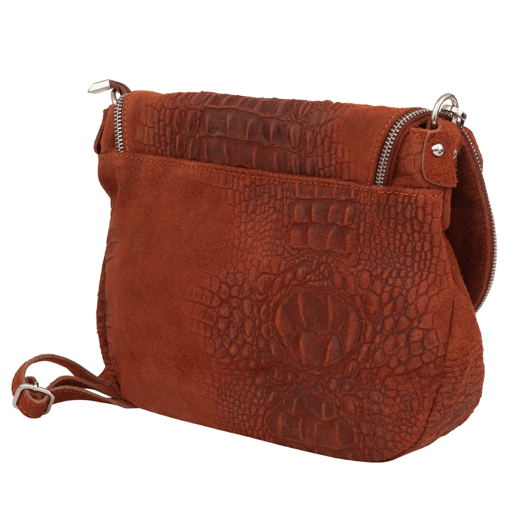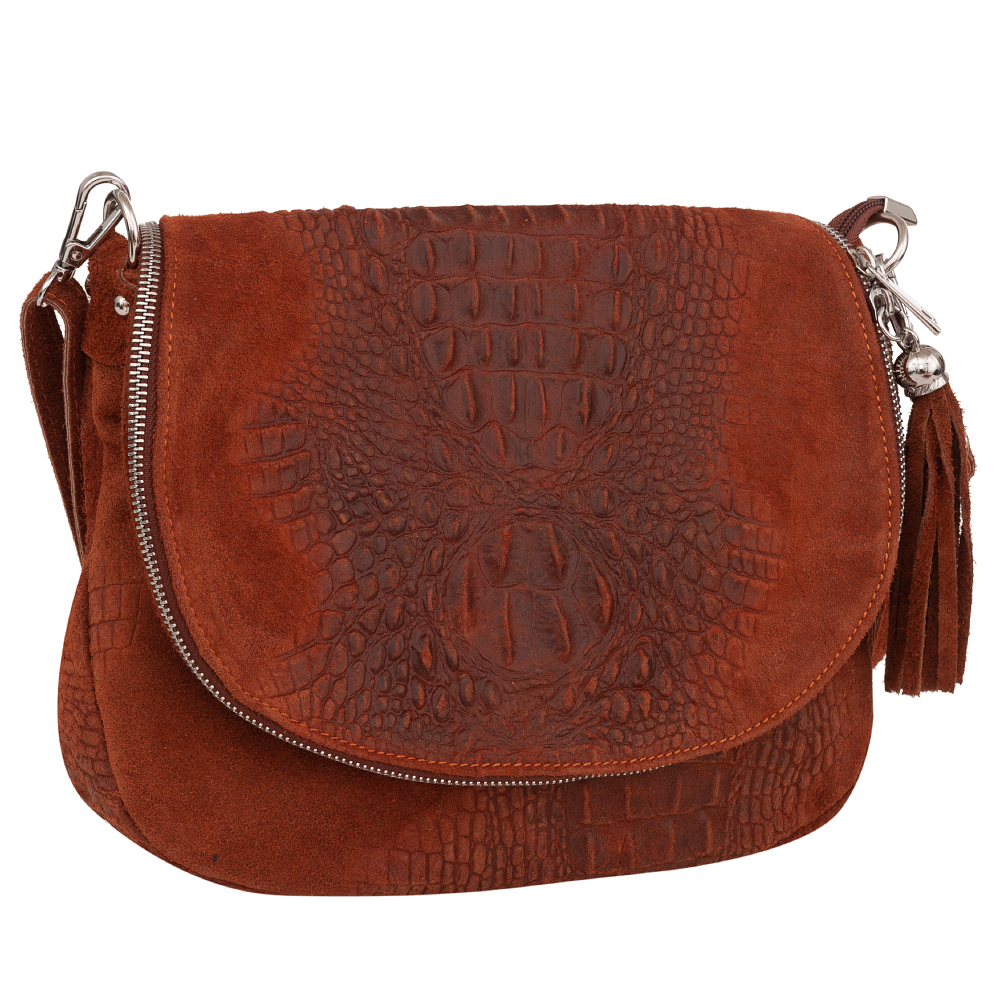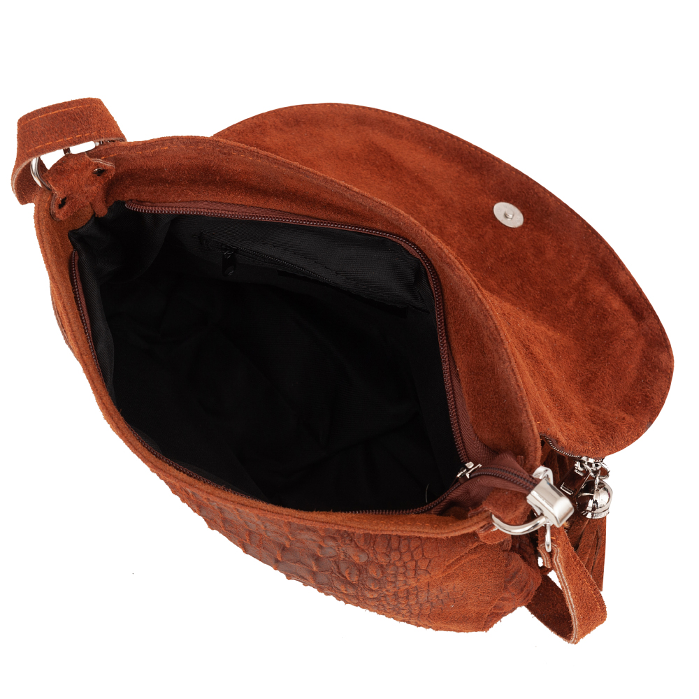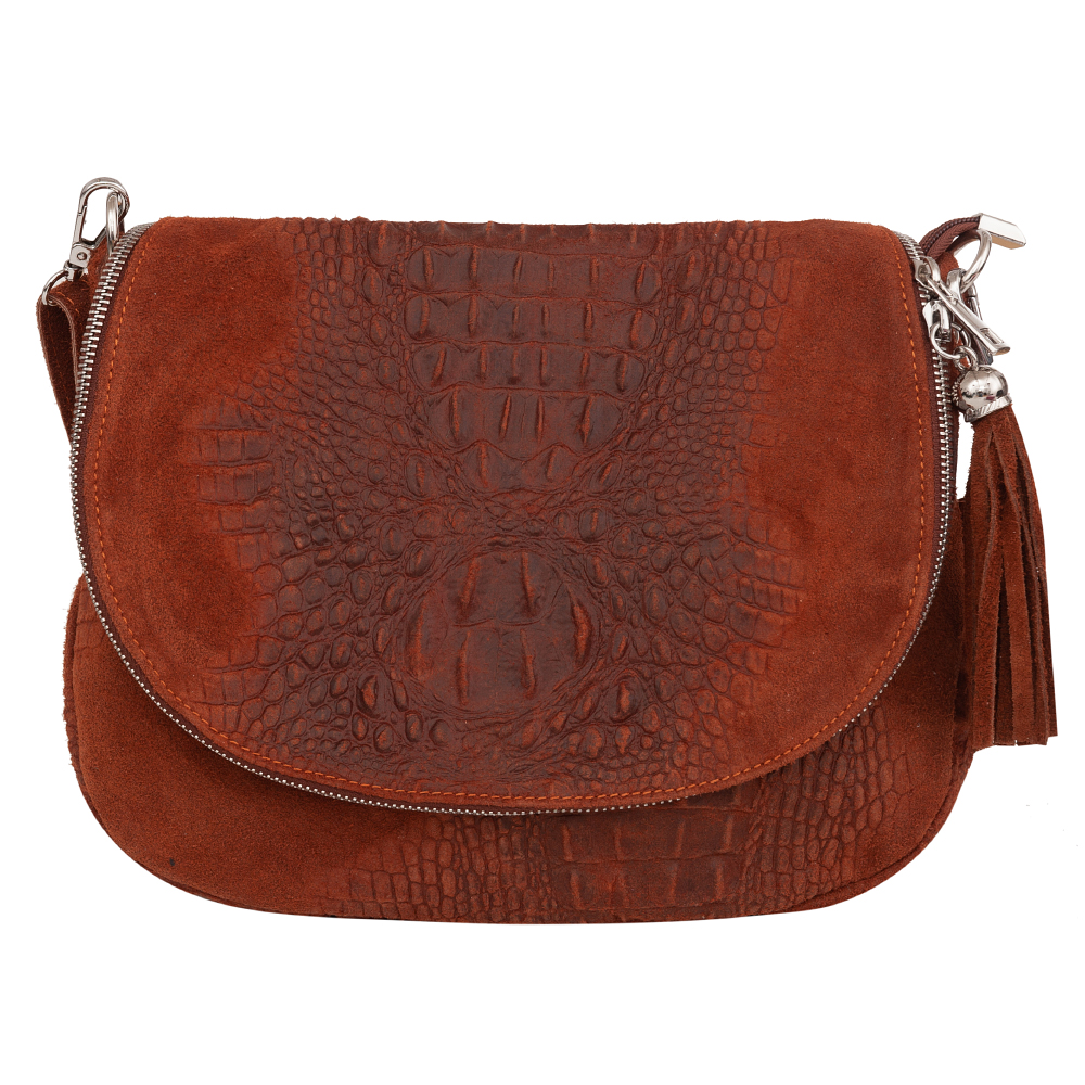 Vera Pelle - Włoska pojemna, modna skórzana listonoszka wykonana z wysokogatunkowej naturalnej skóry z motywem łuski krokodyla łączonej z gładkim zamszem naturalnym. Zamykana na dużą klapę na magnes + suwak. Torebka jednokomorowa, wewnątrz jedna kieszonka na zamek. Wnętrze wykończone trwałą, materiałową podszewką w kolorze czarnym. Długi, regulowany pasek umożliwia wygodne noszenie na ramieniu. Dodatkowa kieszeń w klapie torebki na suwak. Elementy wykończenia w kolorze srebrnym.