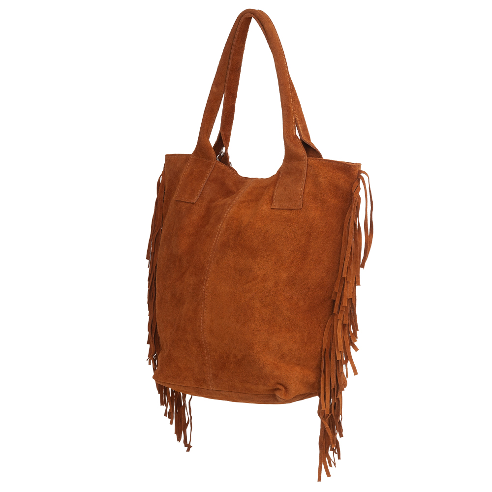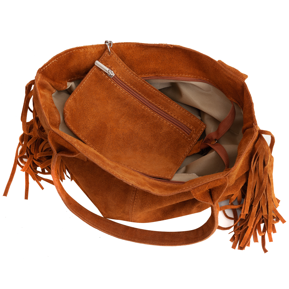 VERA PELLE - Włoska skórzana torebka worek wykonana z wysokogatunkowej naturalnej skóry zamszowej. Bardzo oryginalny i praktyczny model. Zamykana z góry na zamek. W środku mocna, materiałowa podszewka. Kieszonka na suwak + saszetka na suwak w środku + miejsce na telefon. Elementy wykończenia w kolorze srebrnym. Modny pęk frędzli z przodu torebki. Swobodnie można nosić ją w dłoni, przedramieniu jak i na ramieniu. Zamsz miękki, przyjemny w dotyku.