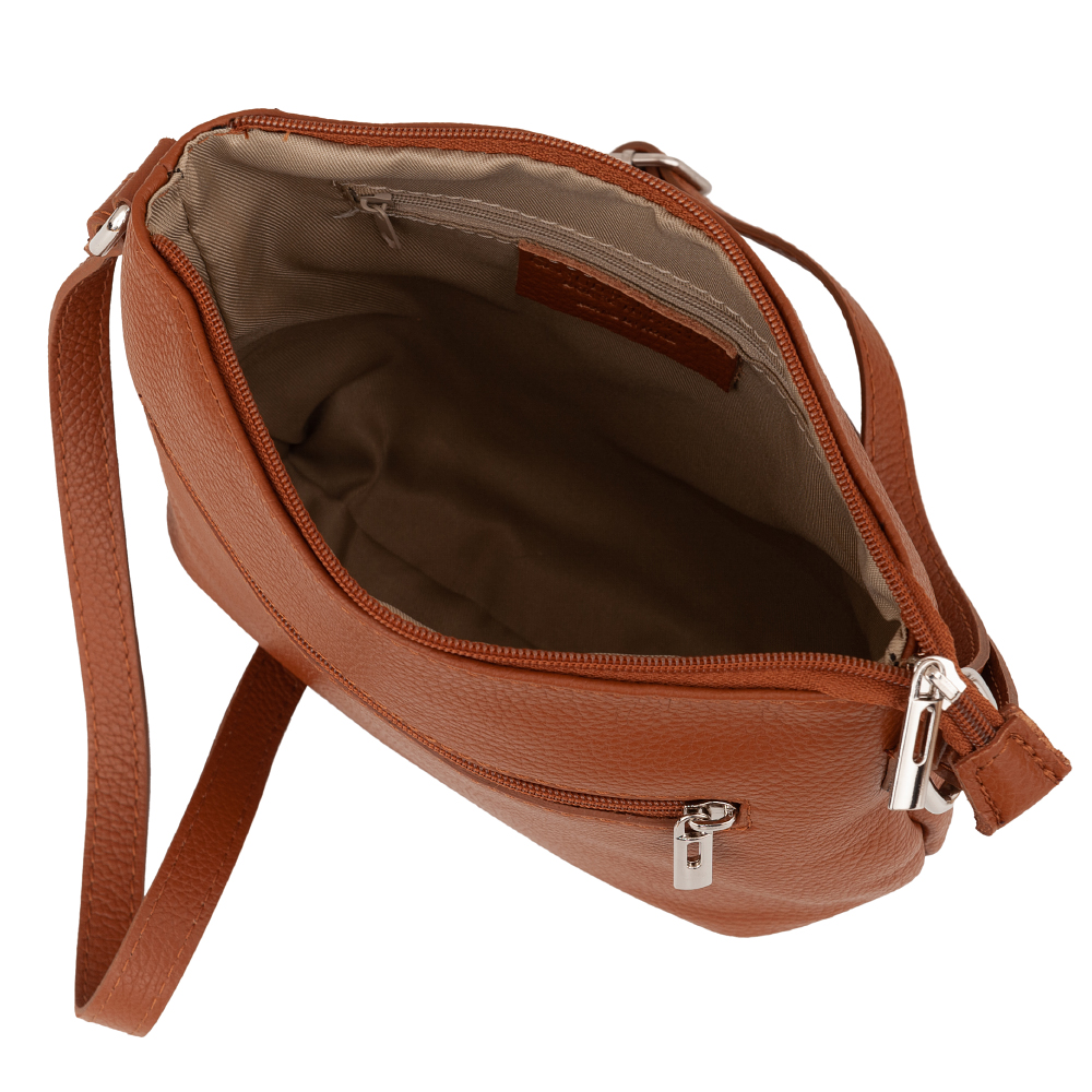 Włoska skórzana torebka listonoszka wykonana z wysokogatunkowej naturalnej skóry firmy VERA PELLE. Pojemny i poręczny model torebki. Torebka jednokomorowa, w środku kieszonka na zamek + kieszonka wsuwna na telefon. Metalowe elementy w kolorze srebrnym. Pasek z możliwością regulacji długości. Dodatkowa kieszonka z przodu i z tyłu torebki na zamek.