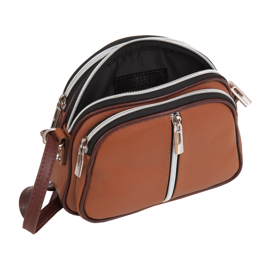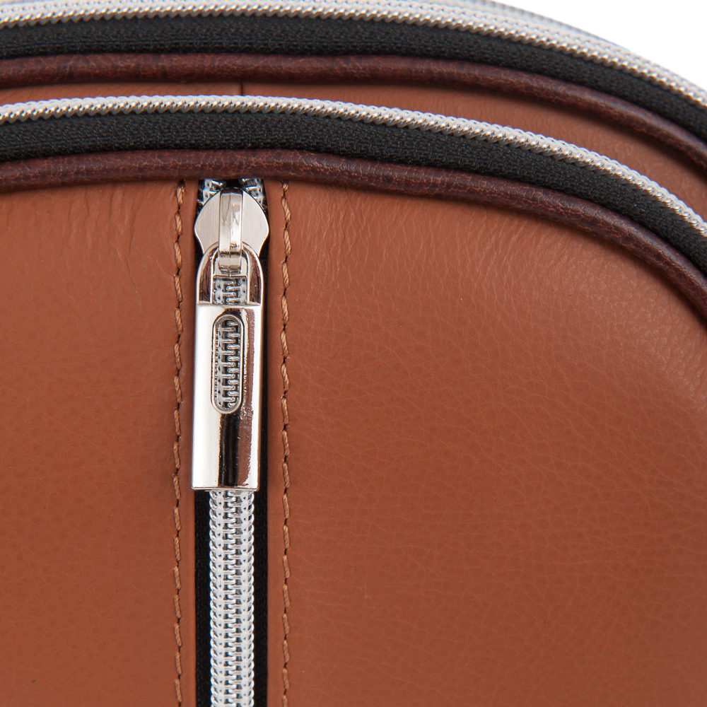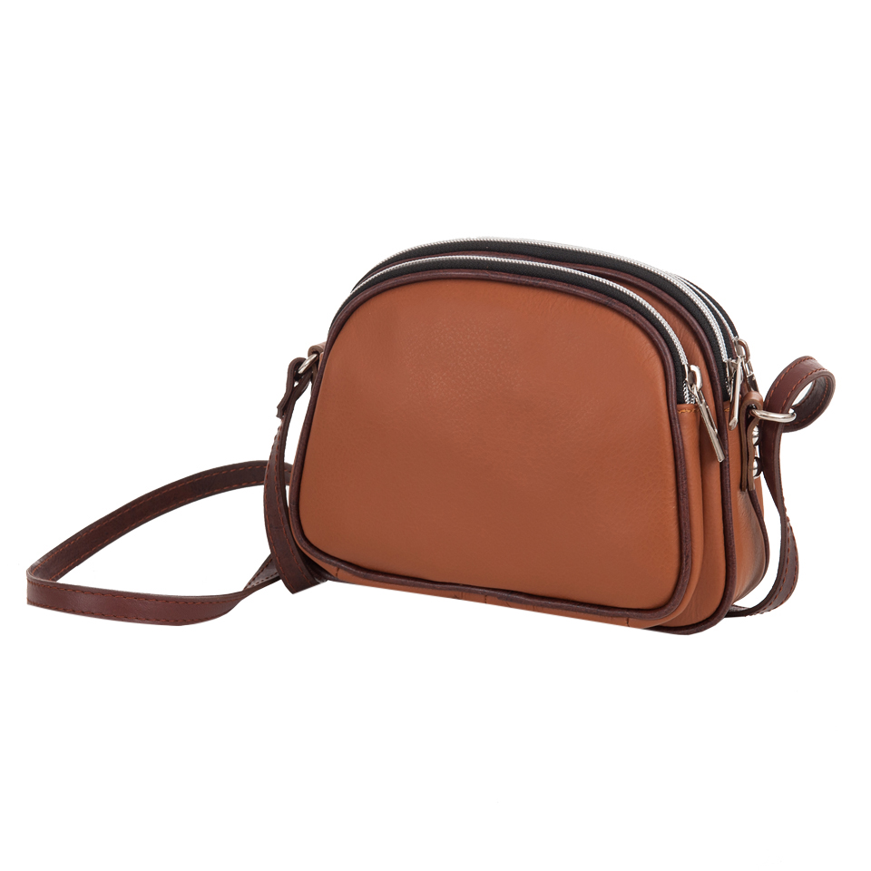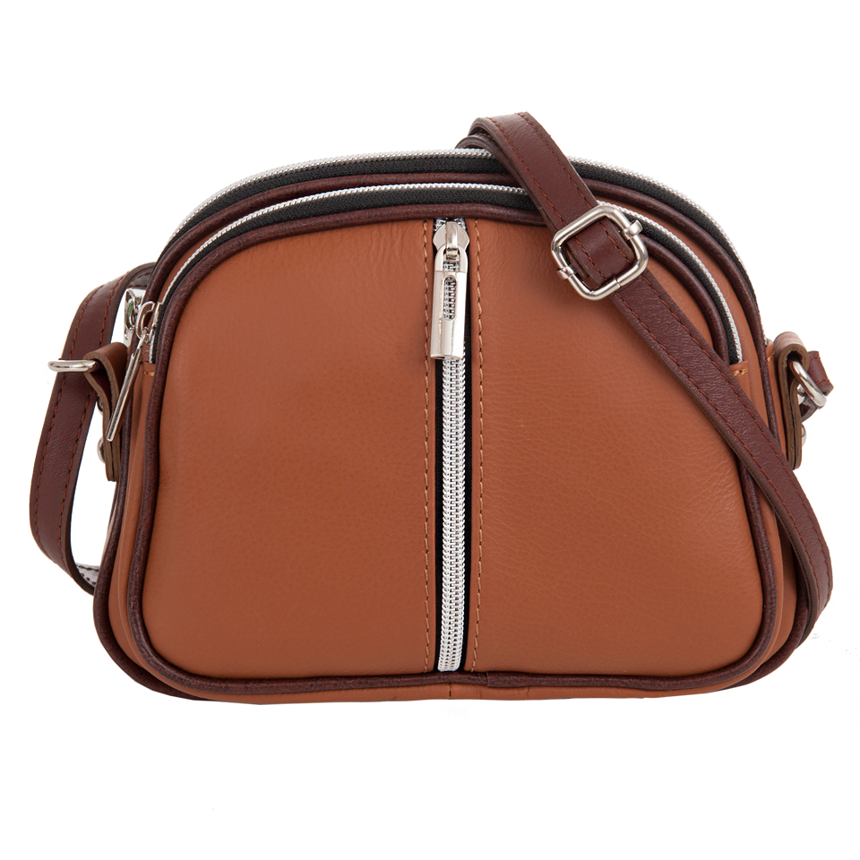 Włoska skórzana listonoszka wykonana z wysokogatunkowej naturalnej gładkiej skóry cielęcej. Zamykana z góry na suwaki. Trzy osobne przegródki zamykane na suwak + pionowa kieszonka na suwak z przodu. Wnętrze wykończone trwałą podszewką. Długi, regulowany pasek umożliwia wygodne noszenie na ramieniu.