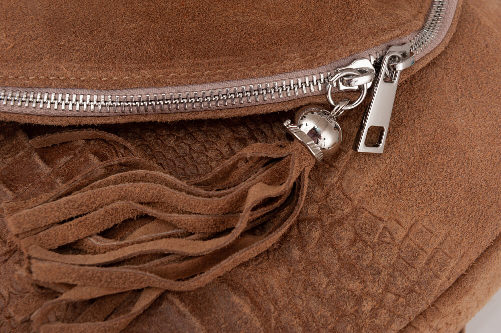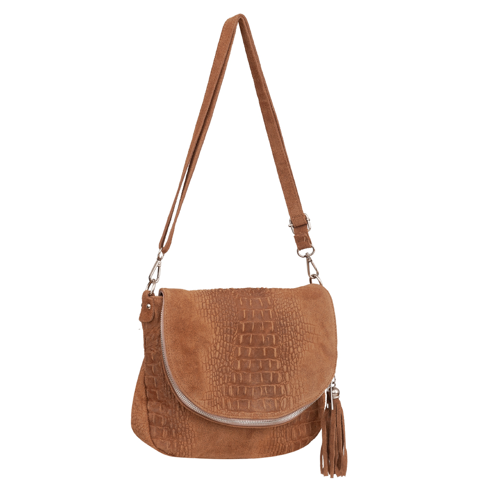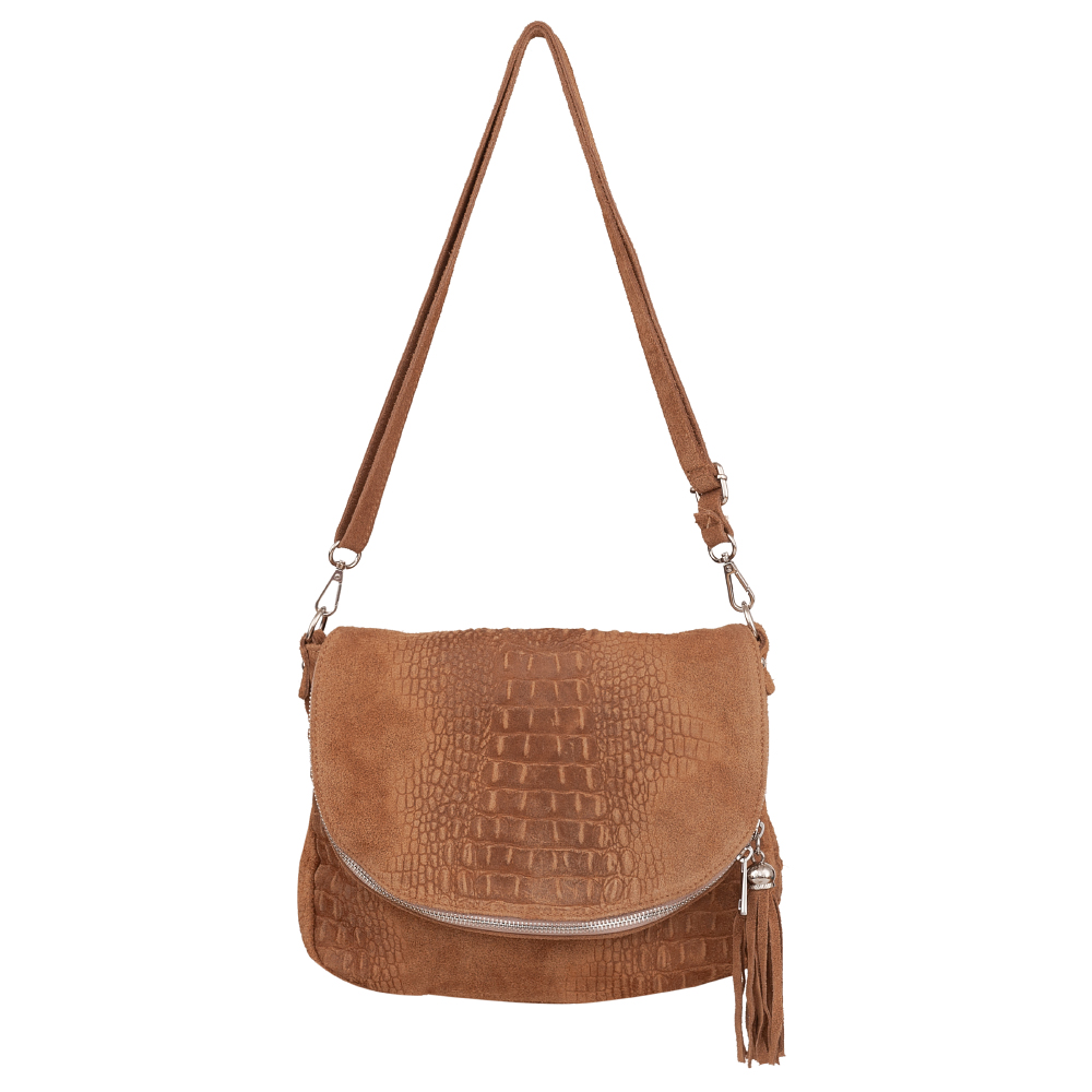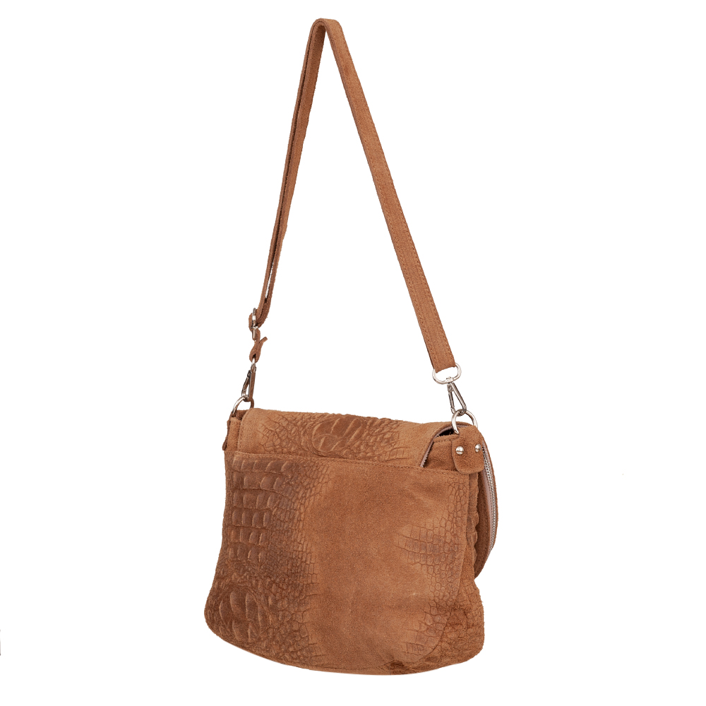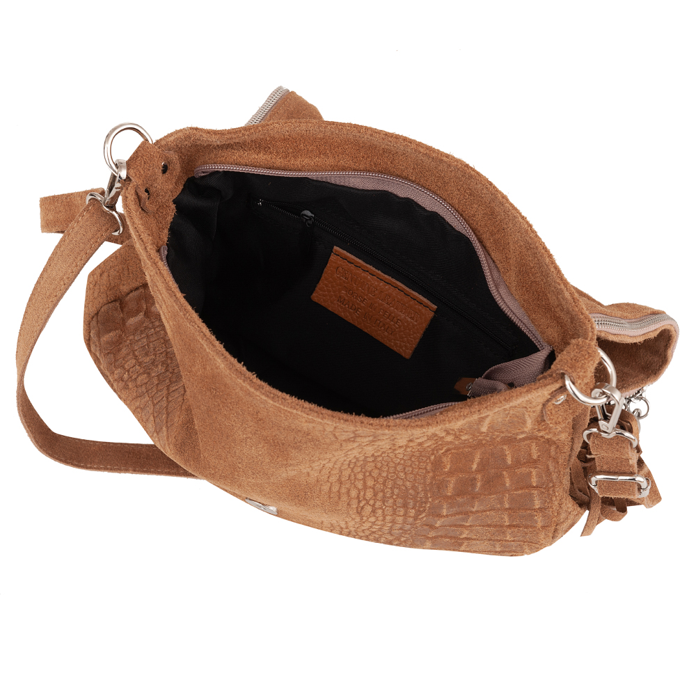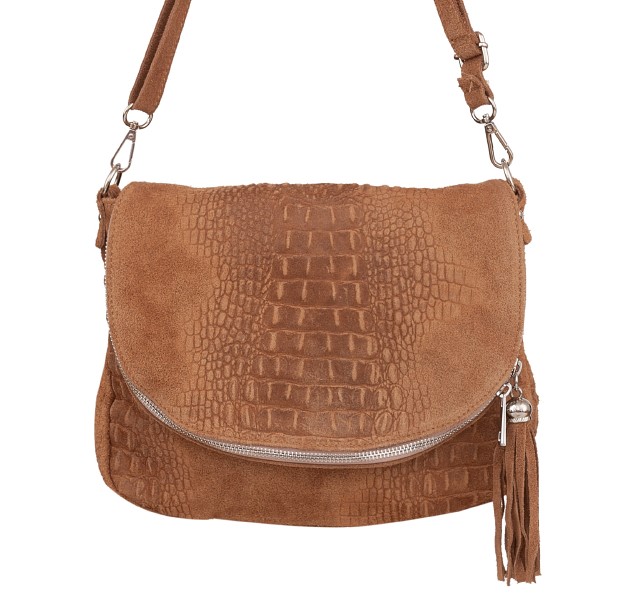 Vera Pelle - Włoska pojemna, modna skórzana listonoszka wykonana z wysokogatunkowej naturalnej skóry z motywem łuski krokodyla łączonej z gładkim zamszem naturalnym. Zamykana na dużą klapę na magnes + suwak. Torebka jednokomorowa, wewnątrz jedna kieszonka na zamek. Wnętrze wykończone trwałą, materiałową podszewką w kolorze czarnym. Długi, regulowany pasek umożliwia wygodne noszenie na ramieniu. Dodatkowa kieszeń w klapie torebki na suwak. Elementy wykończenia w kolorze srebrnym.