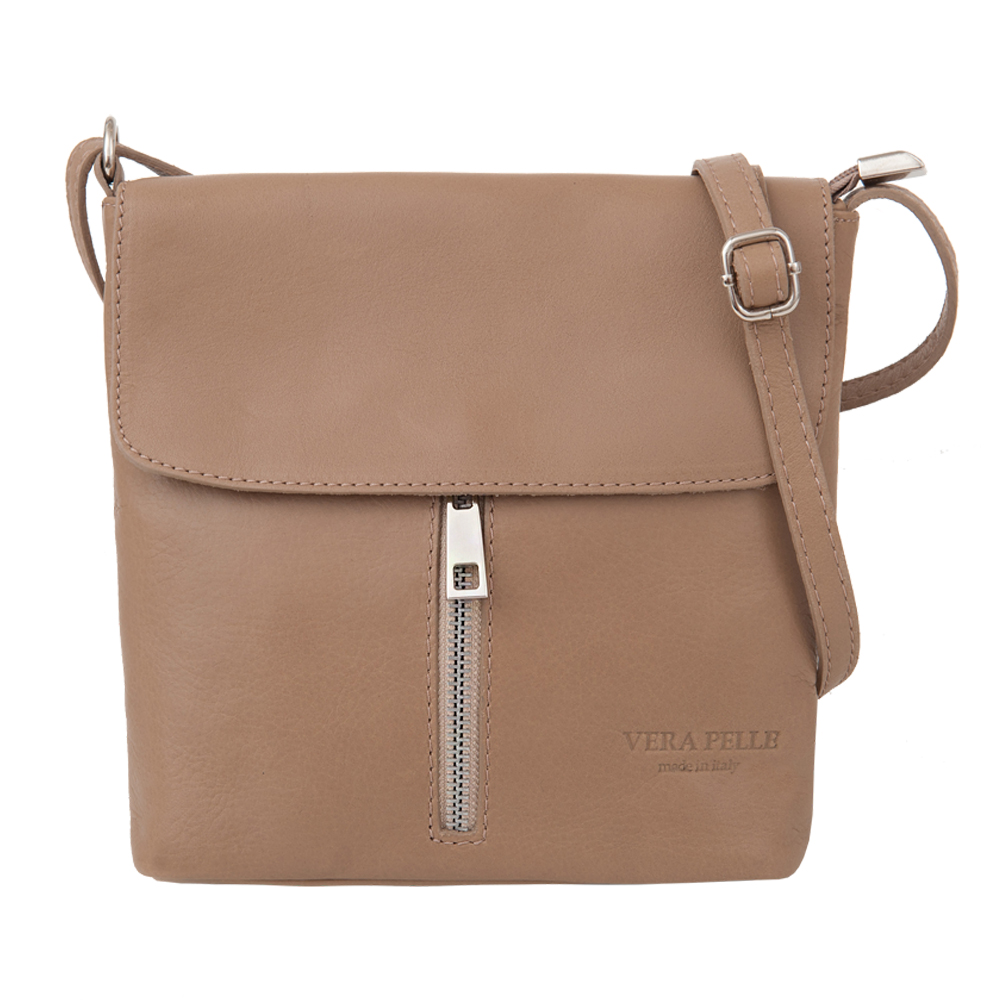 Włoska skórzana torebka / listonoszka wykonana z wysokogatunkowej naturalnej miękkiej skóry cielęcej. Zamykana od góry na zamek + klapka. Torebka jednokomorowa, wewnątrz dodatkowo jedna kieszonka na zamek + kieszonka na telefon + kieszonka z przodu + z tyłu torebki kieszonka na suwak. Wnętrze wykończone trwałą podszewką. Długi, regulowany pasek umożliwia wygodne noszenie na ramieniu lub przez ramię. Elementy wykończenia w kolorze srebrnym.