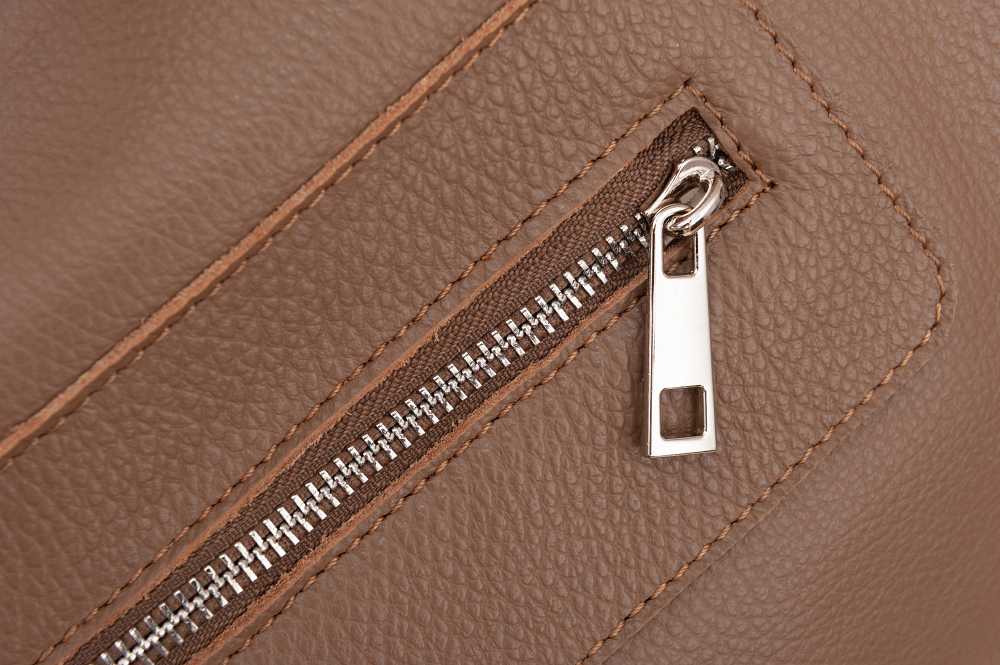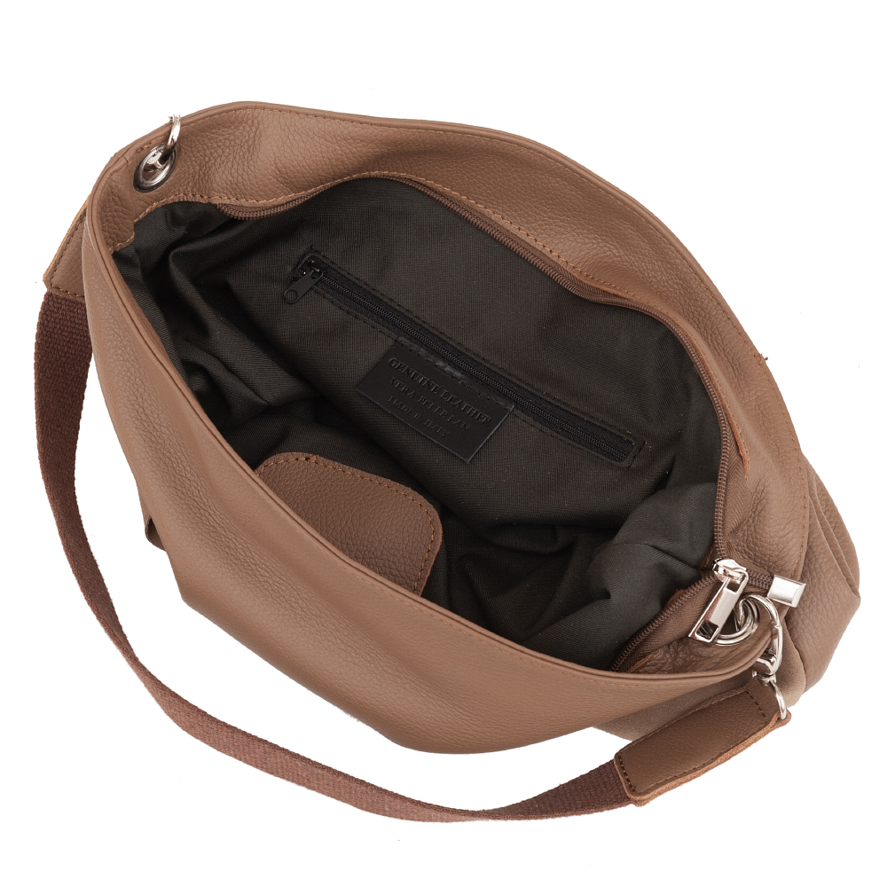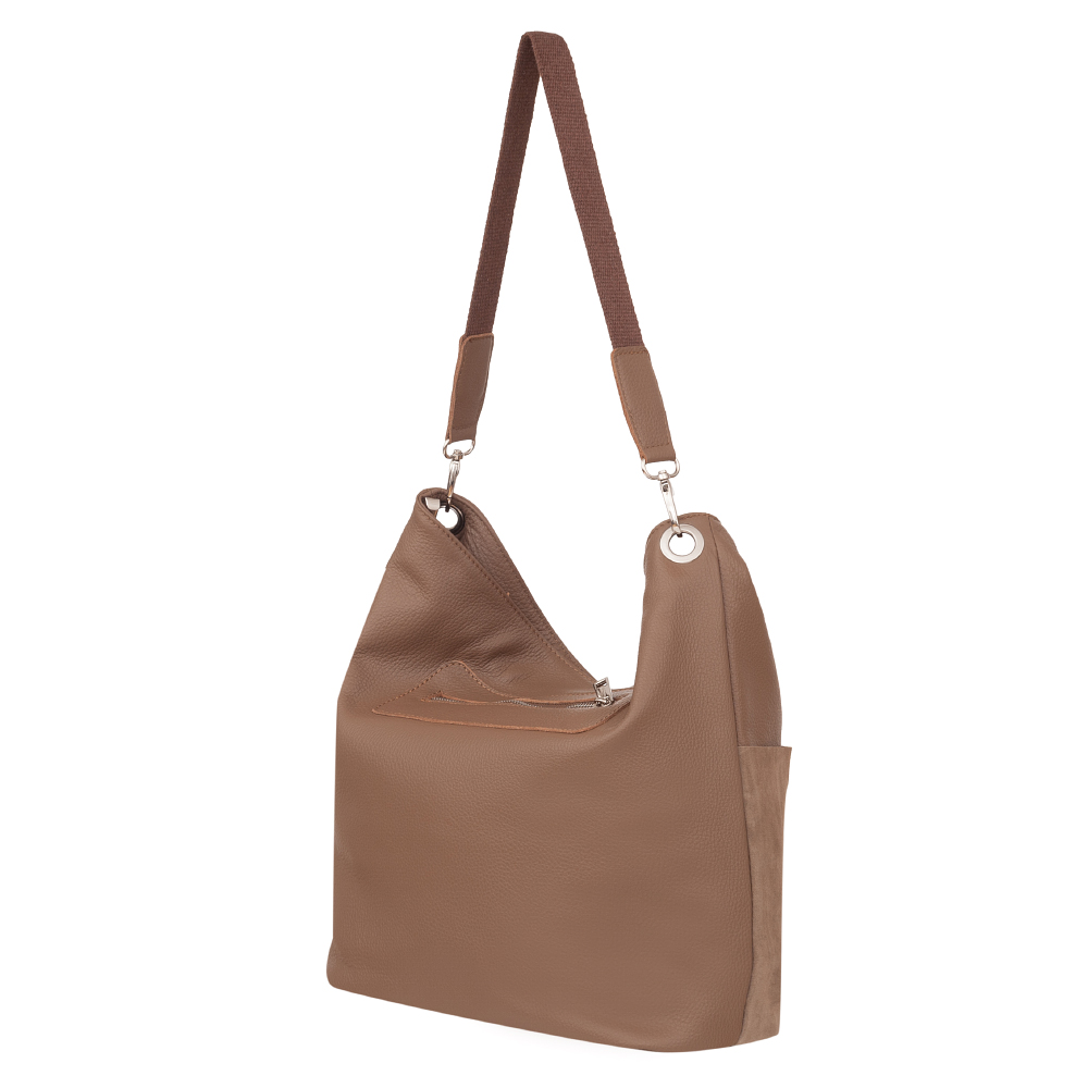 Włoska klasyczna skórzana torebka wykonana z miękkiej skóry naturalnej licowej łączonej z gładkim zamszem naturalnym. Skóra odporna na zarysowania. Zamykana z góry na zamek na całej szerokości. Torebka jednokomorowa + wewnątrz jedna kieszonka na zamek oraz jedna na telefon + 2 x kieszeń wsuwna z przodu torebki. Dodatkowo z tyłu torebki kieszeń na zamek. Wnętrze wykończone trwałą materiałową podszewką dopasowaną pod kolor skóry. Dodatkowy pasek z możliwością regulacji długości 60 - 125 cm. Metalowe elementy w kolorze srebrnym. Dno lekko usztywnione. Szerokie, wygodne parciano-skórzane ucho gwarantuję wygodne noszenie.