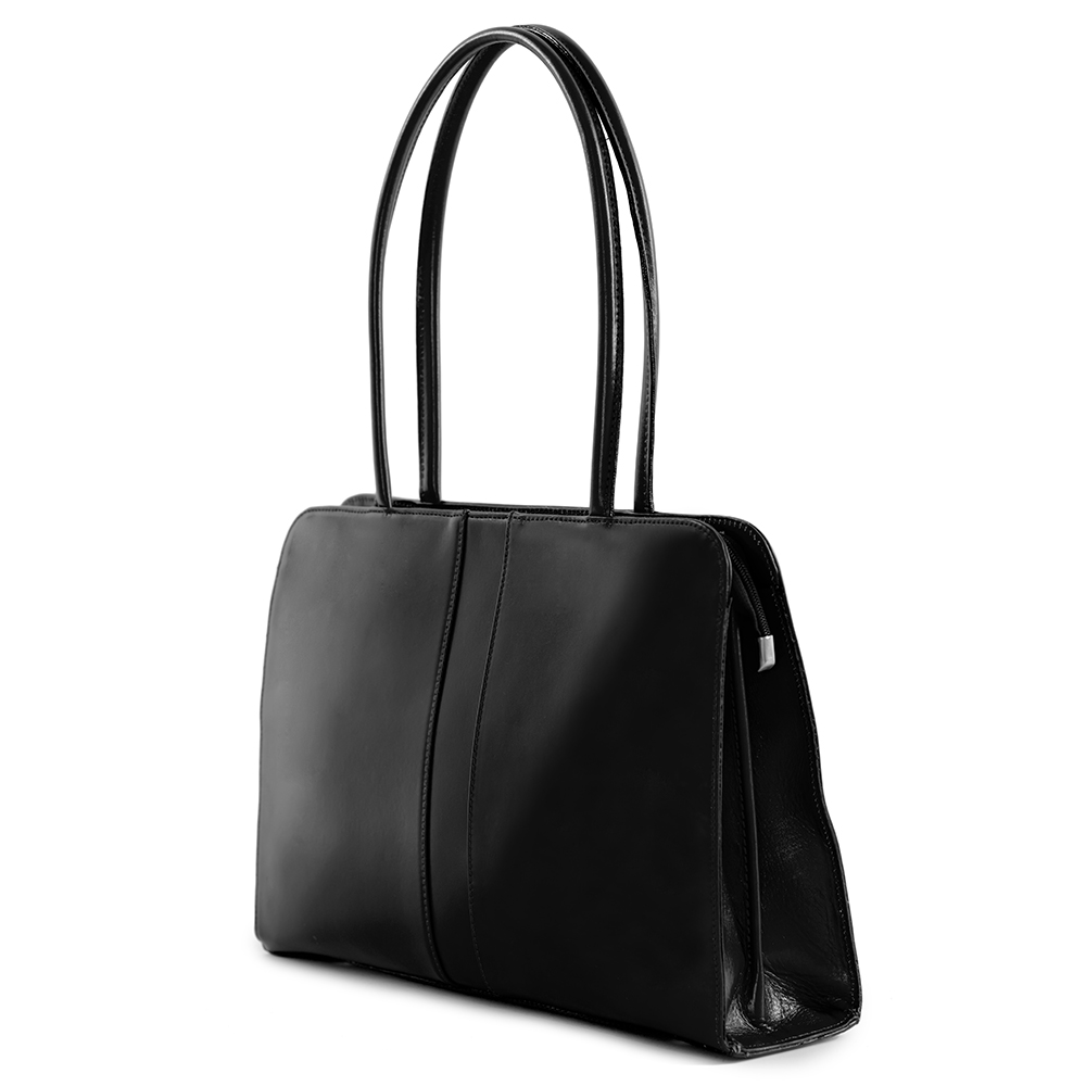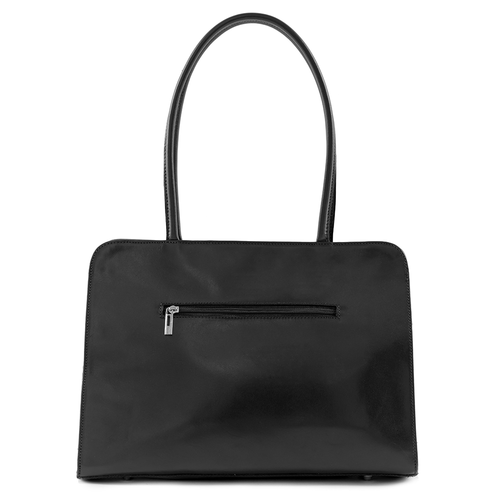 Włoska klasyczna A4 skórzana torebka / aktówka wykonana z wysokogatunkowej naturalnej gładkiej skóry licowej. Zamykana z góry na suwak. Torebka dwukomorowa przedzieloną dużą kieszenią na suwak na całej szerokości. Wewnątrz jedna kieszonka na zamek oraz jedna na telefon. Wnętrze wykończone trwałą podszewką. Dodatkowo z tyłu torebki kieszonka na suwak. Torebka od spodu usztywniona oraz podbita ćwiekami, co chroni ją przeciw uszkodzeniom. Elementy wykończenia w kolorze srebrnym.