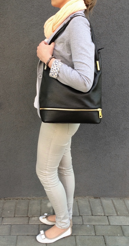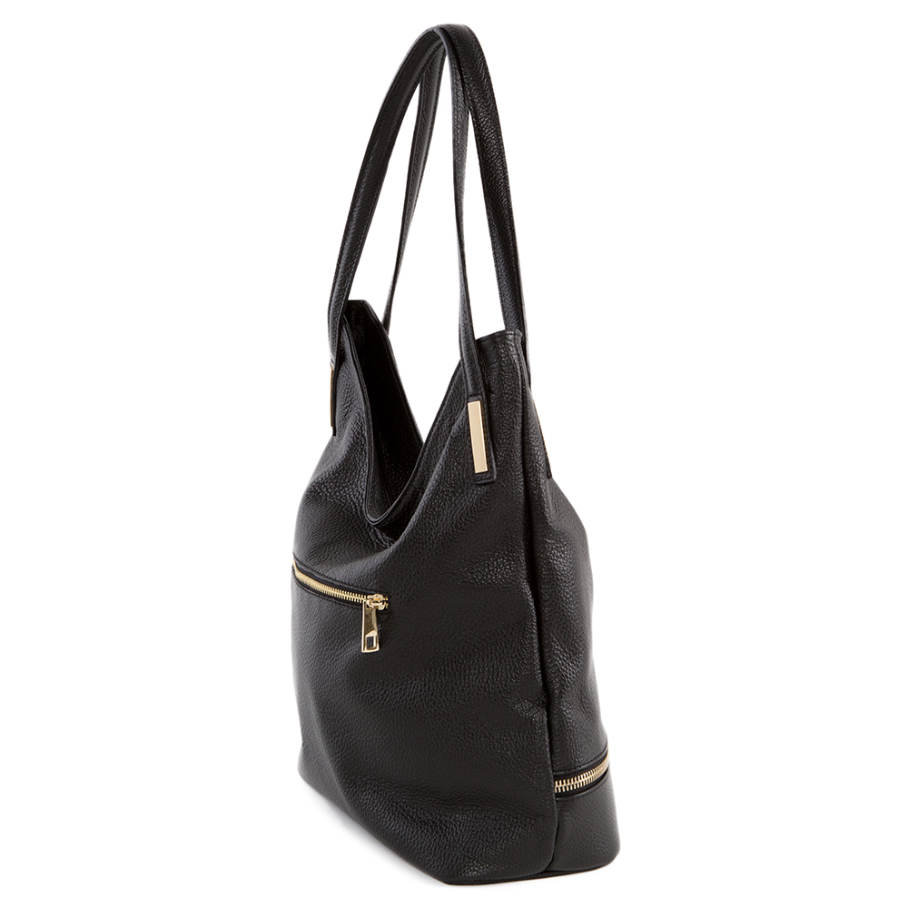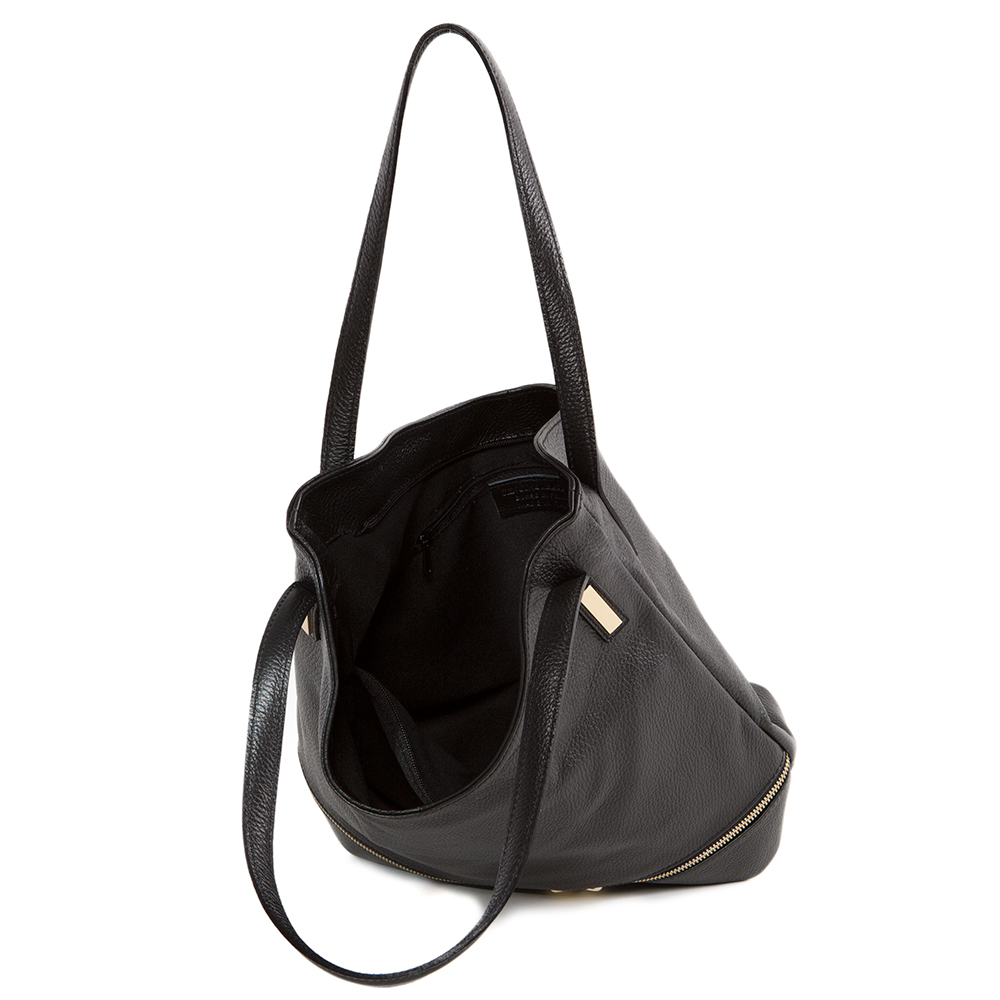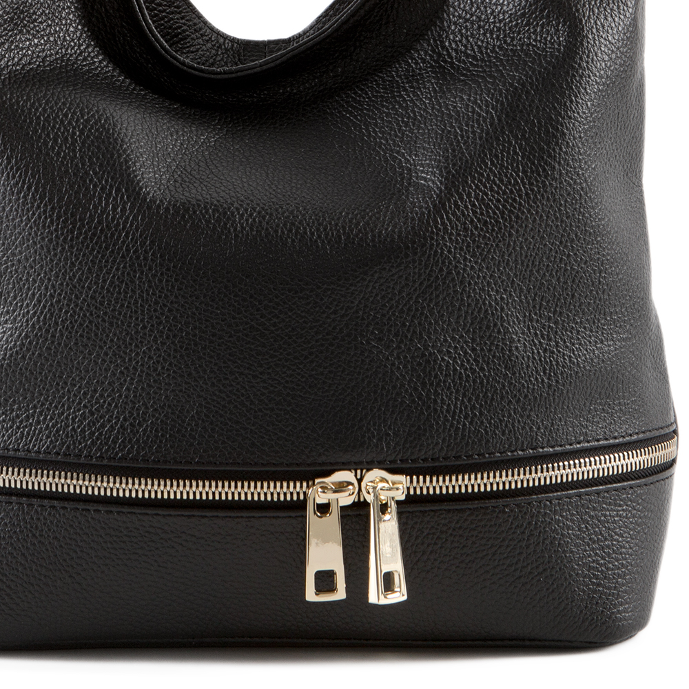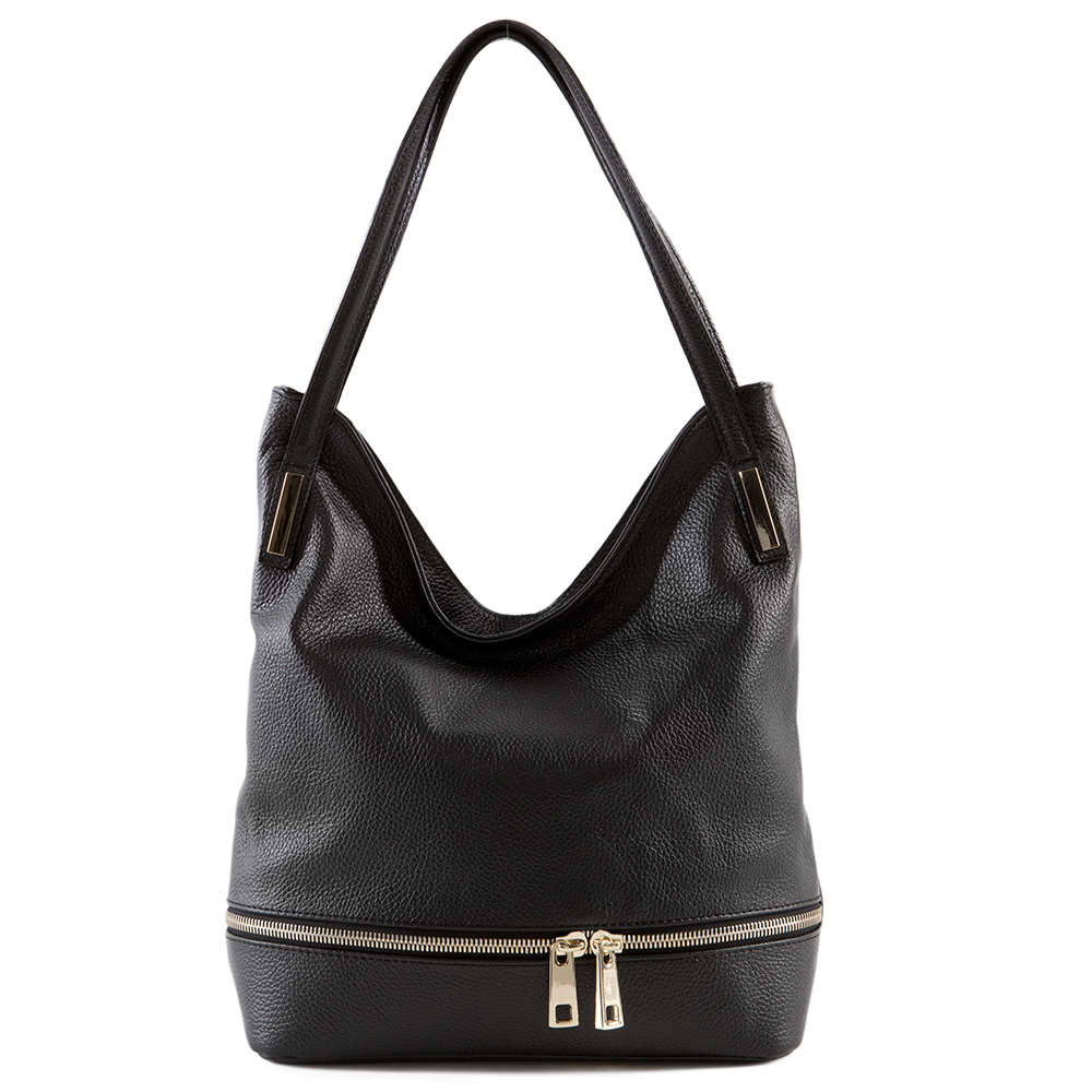 Włoska skórzana torebka / worek wykonana z wysokogatunkowej naturalnej skóry. Zamykana z góry na suwak. Torebka dwukomorowa przedzielona na środku dużą kieszenią na suwak + wewnątrz jedna kieszonka na zamek oraz jedna na telefon. Z tyłu torebki kieszeń na suwak + duża kieszonka z przodu na całej szerokośći. Wnętrze wykończone trwałą, czarną podszewką. Elementy wykończenia w kolorze złotym. Dno usztywnione.