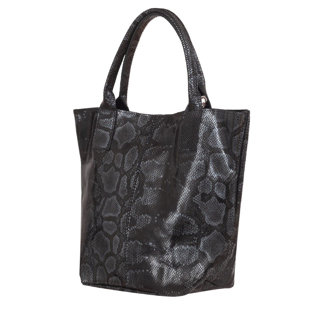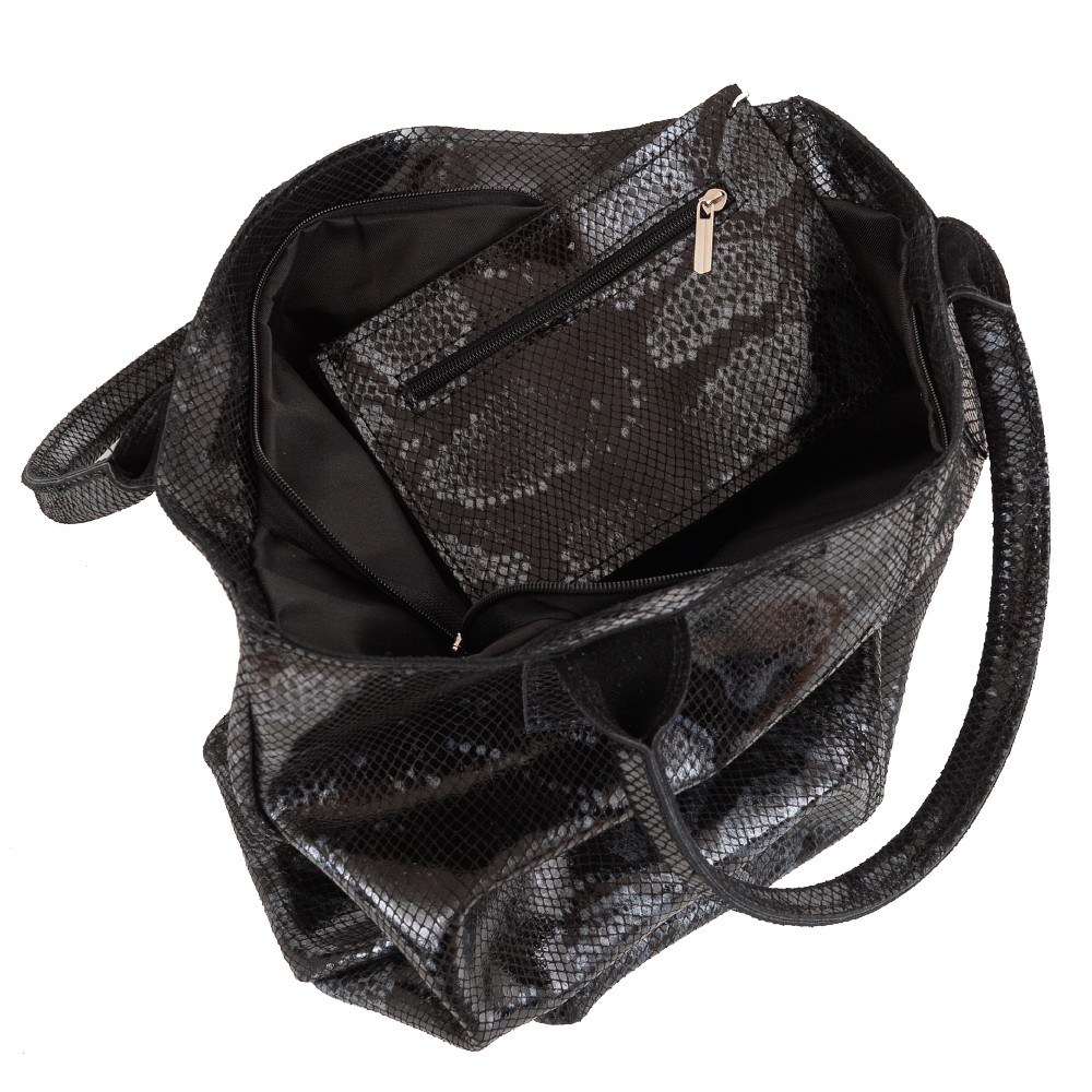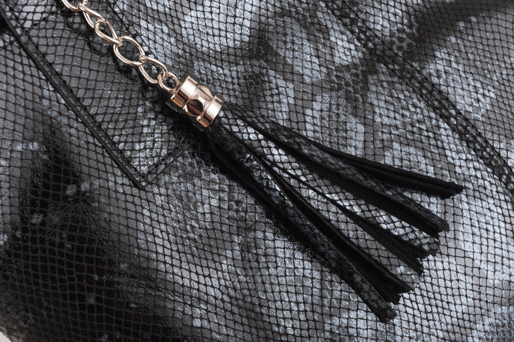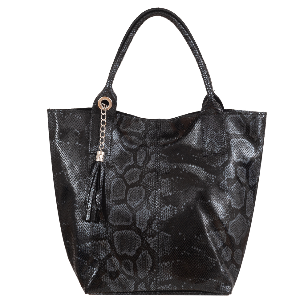VERA PELLE Włoska skórzana torebka / worek wykonana z miękkiej, wysokogatunkowej naturalnej miękkiej lakierowanej skóry z fakturą łuski. Bardzo oryginalny i praktyczny model. Zamykana z góry na zamek. W środku duża komora wykończona podszewką + kieszonka na zamek + saszetka zamykana na suwak. Elementy wykończenia w kolorze srebrnym. Modny pęk frędzli z przodu torebki.