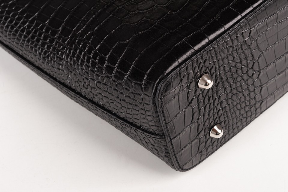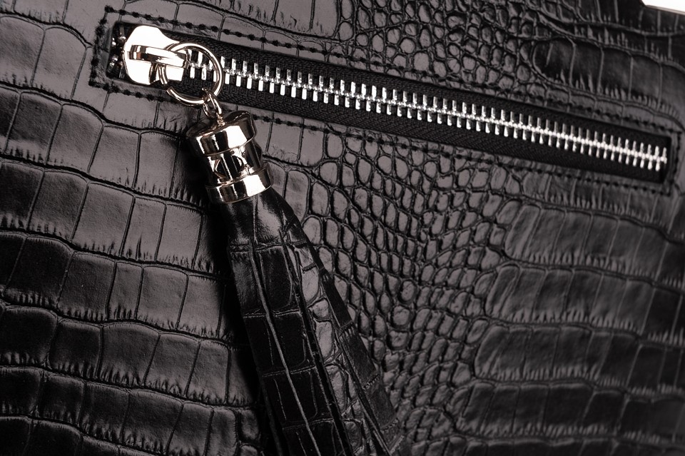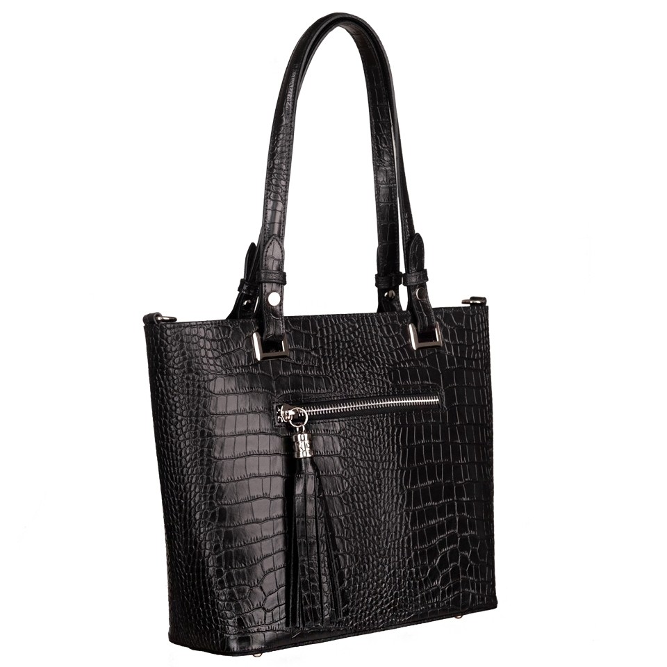 Vera Pelle - Włoska klasyczna skórzana torebka wykonana z wysokogatunkowej naturalnej skóry licowej z fakturą łuski krokodyla. Zamykana od góry na zamek na całej szerokości. Torebka jednokomorowa przedzieloną dużą kieszenią na suwak. Wewnątrz dodatkowo jedna kieszonka na zamek oraz jedna na telefon. Wnętrze wykończone trwałą, czarną materiałową podszewką. Dodatkowo z przodu torebki kieszonka na suwak z modnym pękiem frędzli. Torebka od spodu usztywniona oraz podbita metalowymi nóżkami, co chroni ją przeciw uszkodzeniom i zadrapaniom. Elementy wykończenia w kolorze srebrnym. Torebkę można swobodnie nosić na ramieniu dzięki optymalnie długim uszom. W komplecie dodatkowy długi pasek o długości 102 cm.