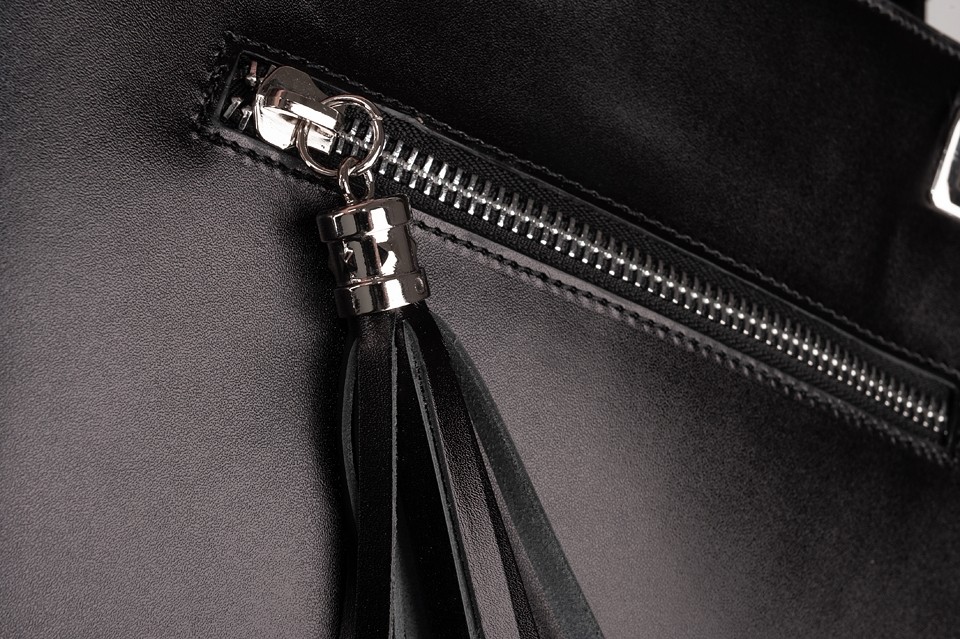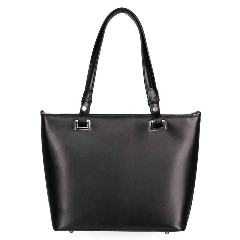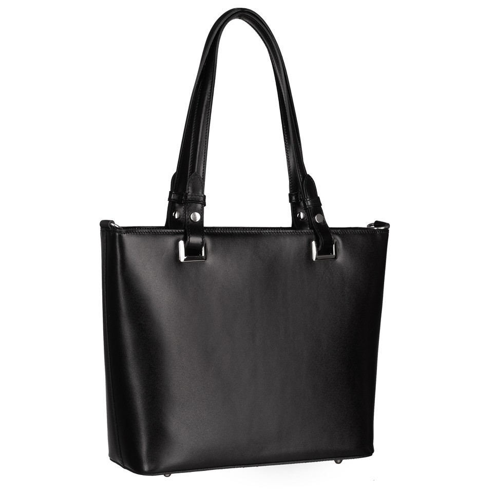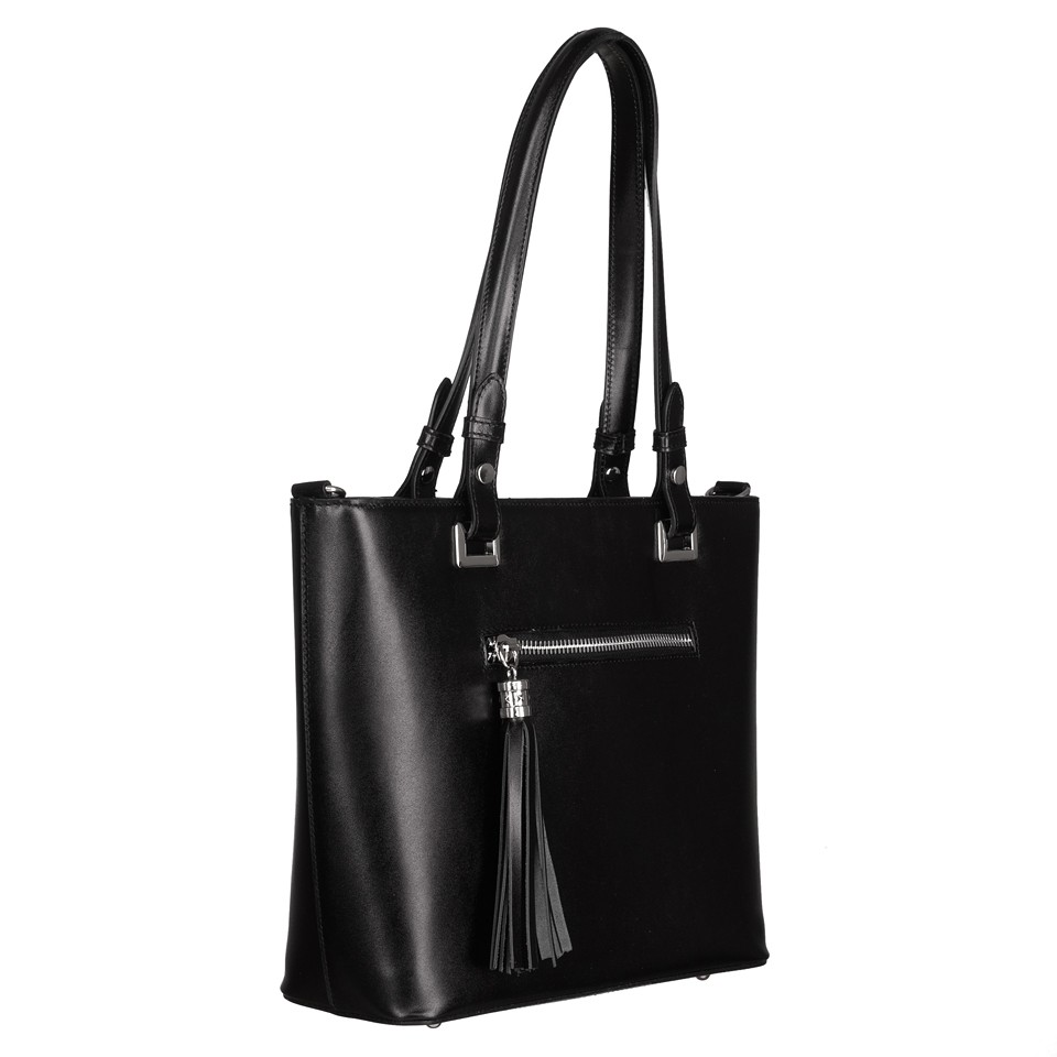 Vera Pelle - Włoska klasyczna skórzana torebka wykonana z wysokogatunkowej naturalnej gładkiej skóry licowej. Zamykana od góry na zamek na całej szerokości. Torebka jednokomorowa przedzieloną dużą kieszenią na suwak. Wewnątrz dodatkowo jedna kieszonka na zamek oraz jedna na telefon. Wnętrze wykończone trwałą, czarną materiałową podszewką. Dodatkowo z przodu torebki kieszonka na suwak z modnym pękiem frędzli. Torebka od spodu usztywniona oraz podbita metalowymi nóżkami, co chroni ją przeciw uszkodzeniom i zadrapaniom. Elementy wykończenia w kolorze srebrnym. Torebkę można swobodnie nosić na ramieniu dzięki optymalnie długim uszom. W komplecie dodatkowy długi pasek o długości 102 cm.