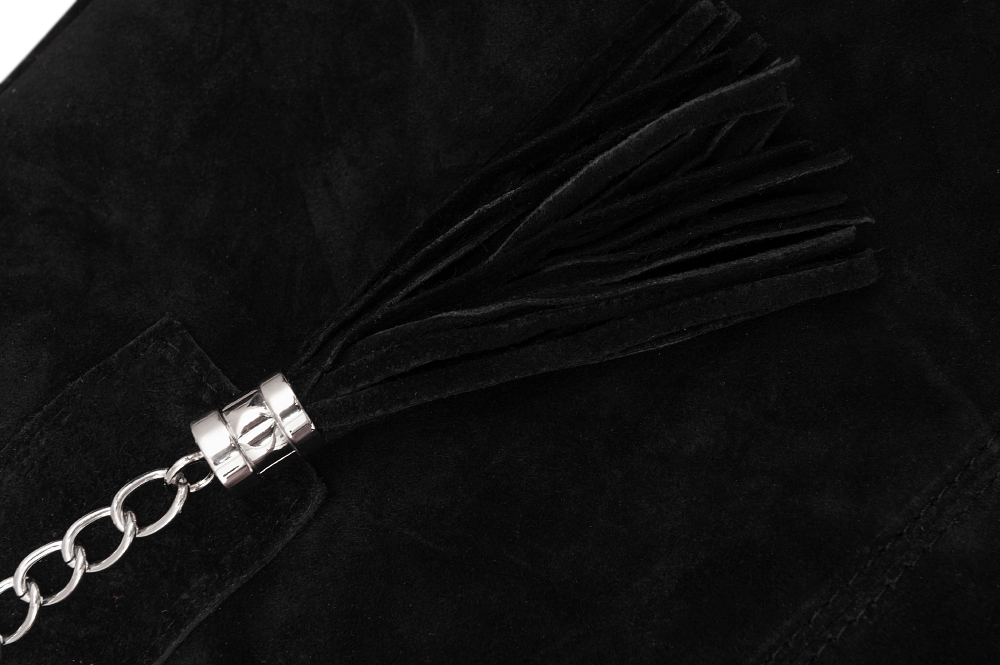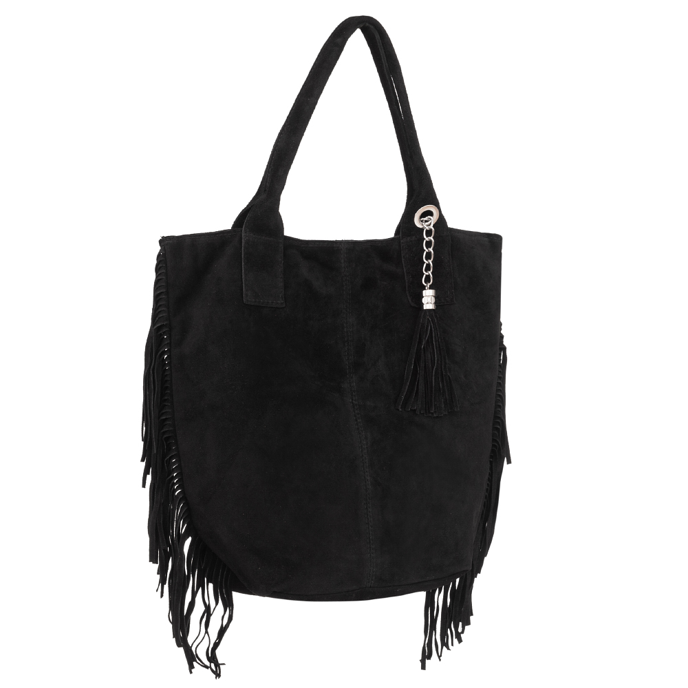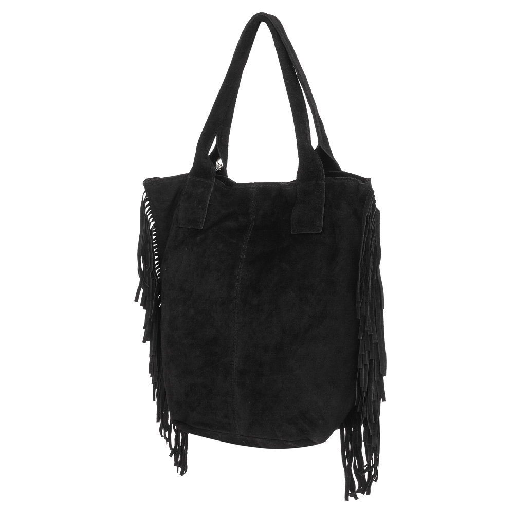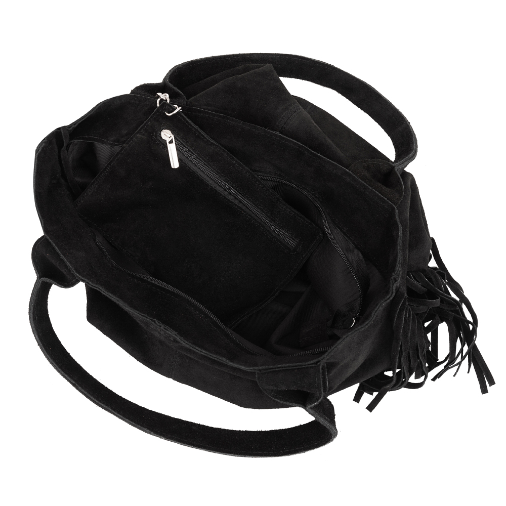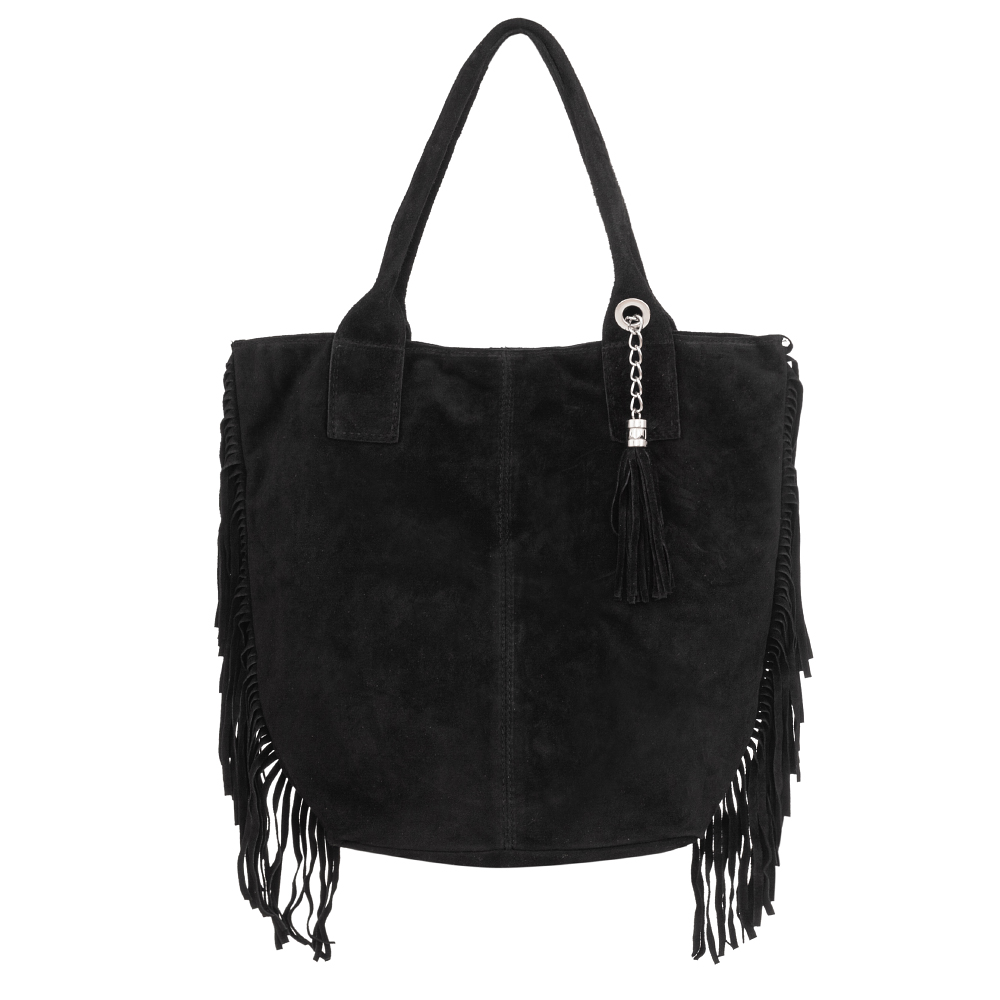 VERA PELLE - Włoska skórzana torebka worek wykonana z wysokogatunkowej naturalnej skóry zamszowej. Bardzo oryginalny i praktyczny model. Zamykana z góry na zamek. W środku mocna, materiałowa podszewka. Kieszonka na suwak + saszetka na suwak w środku + miejsce na telefon. Elementy wykończenia w kolorze srebrnym. Modny pęk frędzli z przodu torebki. Swobodnie można nosić ją w dłoni, przedramieniu jak i na ramieniu. Zamsz miękki, przyjemny w dotyku.