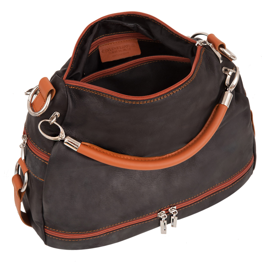 Włoska skórzana torebka / worek wykonana z wysokogatunkowej naturalnej gładkiej skóry cielęcej. Zamykana na suwak. Torebka jednokomorowa przedzielona kieszenią na suwak + w środku jedna kieszonka na zamek oraz jedna na telefon. Wnętrze wykończone trwałą podszewką kolorystycznie dopasowaną do skóry. Długi, regulowany pasek umożliwia wygodne noszenie na ramieniu. Dodatkowa kieszonka z tyłu torebki na suwak + kieszonka z przodu. Boczne uszy można regulować i przepinać ( możliwość całkowitego wypięcia ).