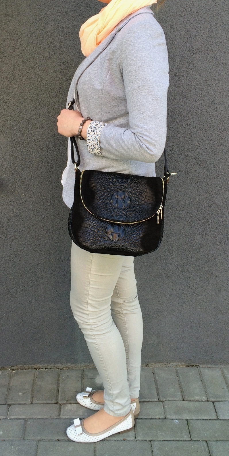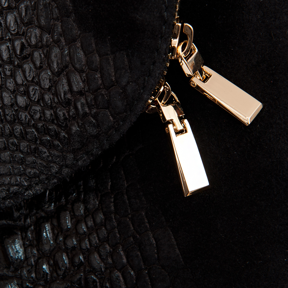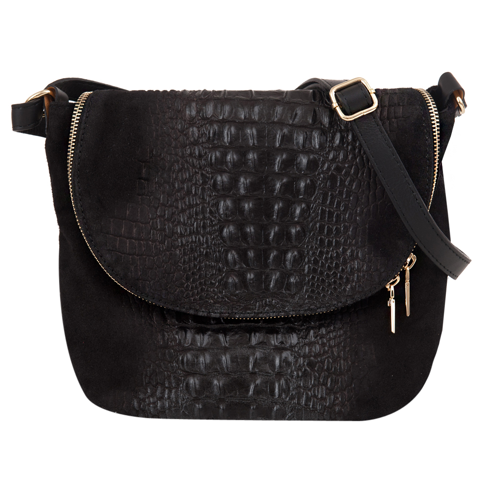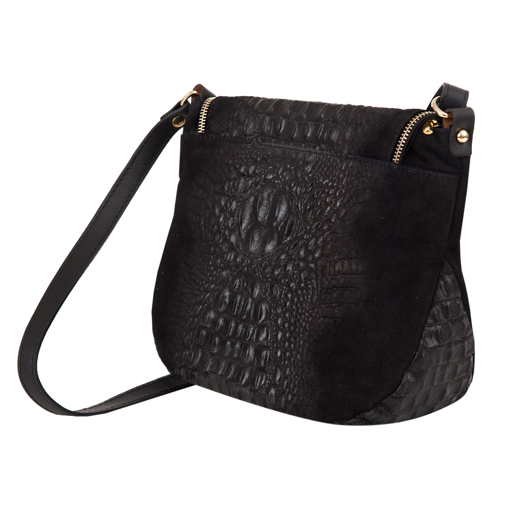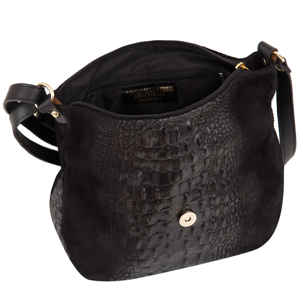Włoska duża skórzana listonoszka wykonana z wysokogatunkowej naturalnej skóry z motywem krokodyla łączonej z zamszem naturalnym. Zamykana na dużą klapę na magnes + suwak. Torebka jednokomorowa, wewnątrz jedna kieszonka na zamek. Wnętrze wykończone trwałą podszewką. Długi, regulowany pasek umożliwia wygodne noszenie na ramieniu. Dodatkowa kieszeń w klapie torebki na suwak. Elementy wykończenia w kolorze złotym.