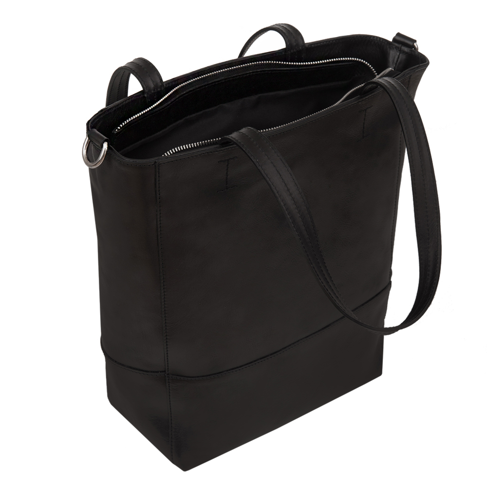 Włoska ekskluzywna A4 pojemna skórzana torebka wykonana z wysokogatunkowej naturalnej skóry licowej najwyższej jakości. Wygodny dostęp do środka, zamykana na zamek na całej szerokości. Torebka jednokomorowa, wewnątrz kieszonka na telefon + kieszonka na zamek. Torebka od środka wykończona porządną, czarną materiałowa podszewką. Od spodu torebka podbita metalowymi nóżkami. W komplecie dodatkowy długi, regulowany pasek o długości max. 122 cm. Metalowe elementy w kolorze srebrnym.