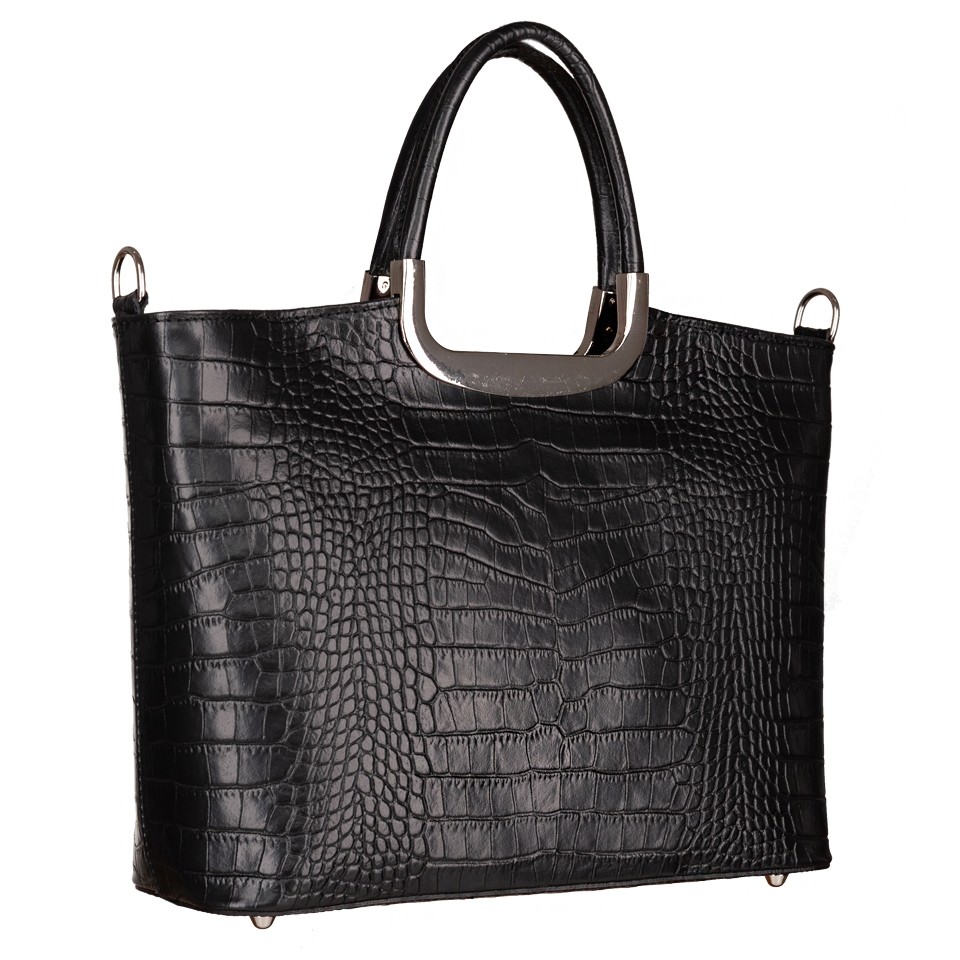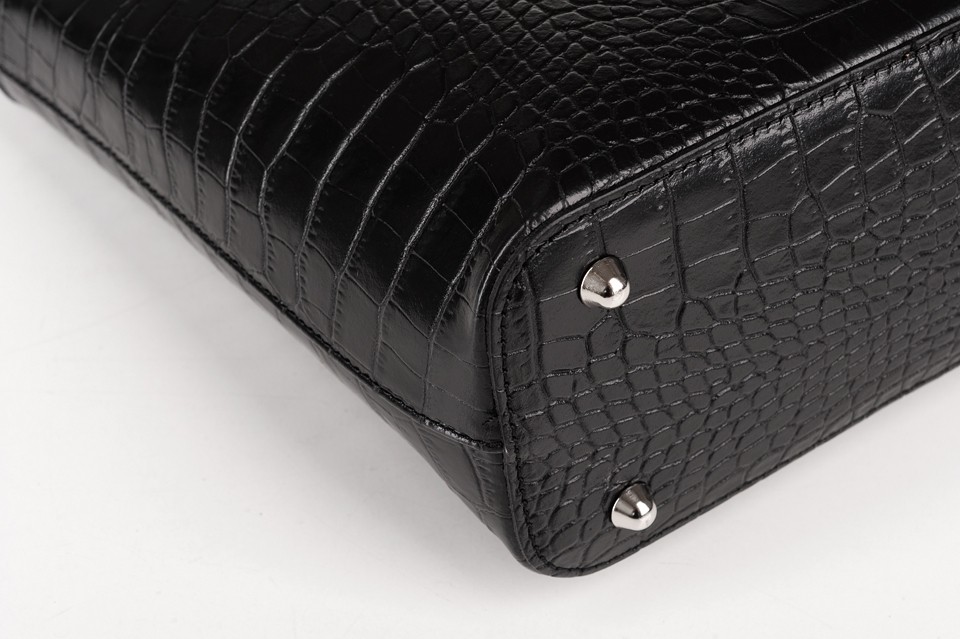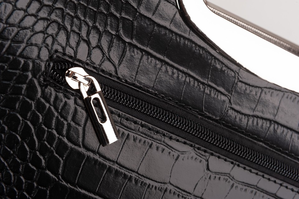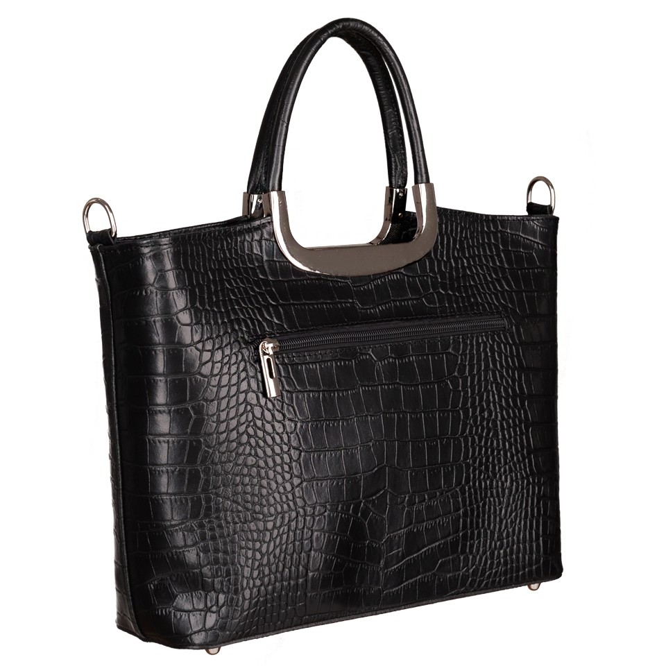 Włoska klasyczna skórzana torba aktówka wykonana z wysokogatunkowej naturalnej skóry z motywem łuski krokodyla. Zamykana z góry na zamek na całej szerokości. Torebka jednokomorowa przedzieloną dużą kieszenią na suwak. Wewnątrz jedna kieszonka na zamek oraz jedna na telefon. Wnętrze wykończone trwałą podszewką. Dodatkowo z tyłu torebki kieszonka na suwak. Torebka od spodu usztywniona oraz podbita ćwiekami, co chroni ją przeciw uszkodzeniom. Elementy wykończenia w kolorze srebrnym. Dodatkowy pasek o długości 92 cm.