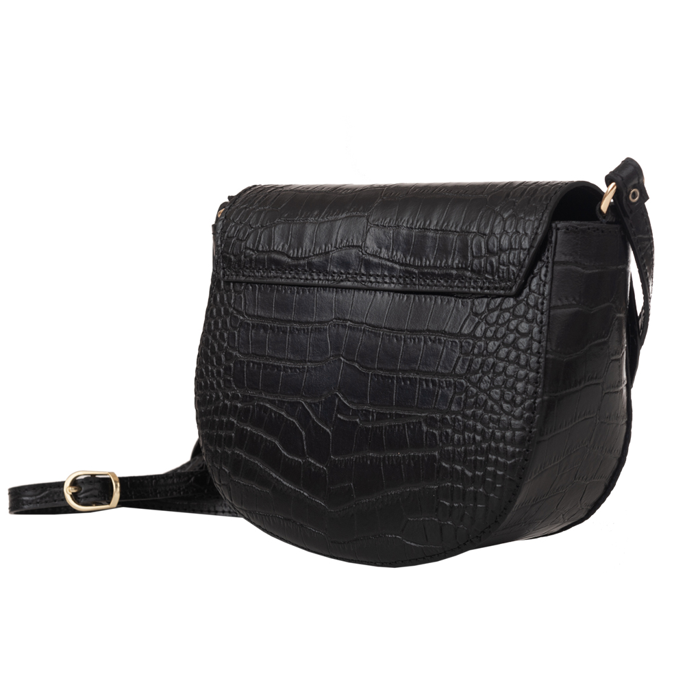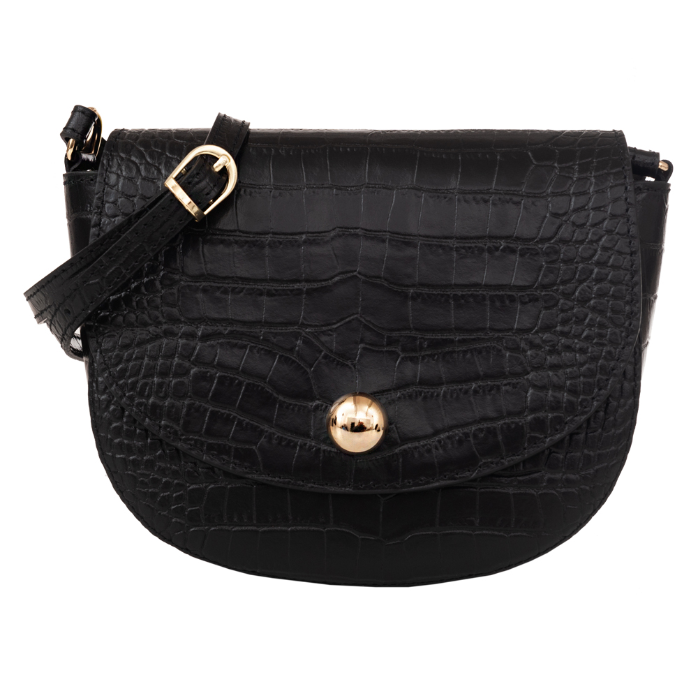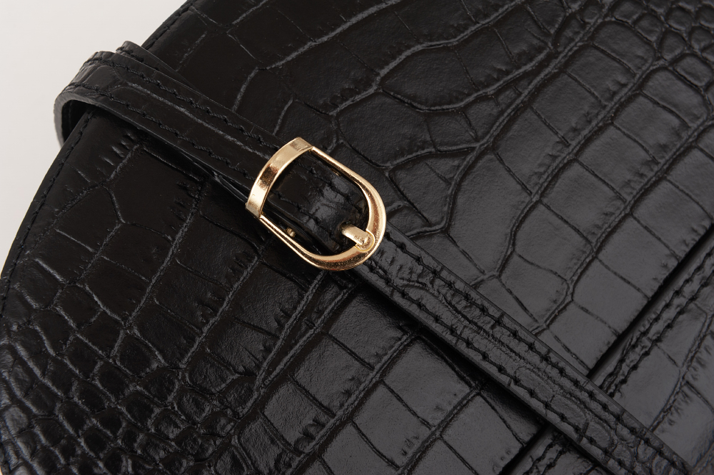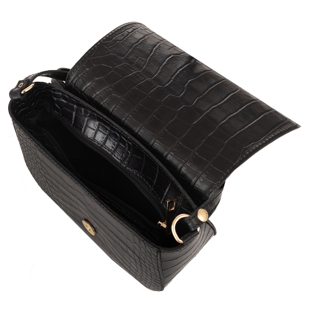 Hit sezonu! Oryginalna i modna włoska skórzana torebka listonoszka wykonana z wysokogatunkowej naturalnej skóry licowej z fakturą łuski krokodyla firmy Vera Pelle. Zamykana z góry na suwak + klapa na magnes. Torebka jednokomorowa, wewnątrz jedna kieszonka na zamek. Wnętrze wykończone trwałą, materiałową czarną podszewką. Długi, regulowany pasek umożliwia wygodne noszenie na ramieniu lub przez ramię. Elementy wykończenia, zamki w kolorze złotym.