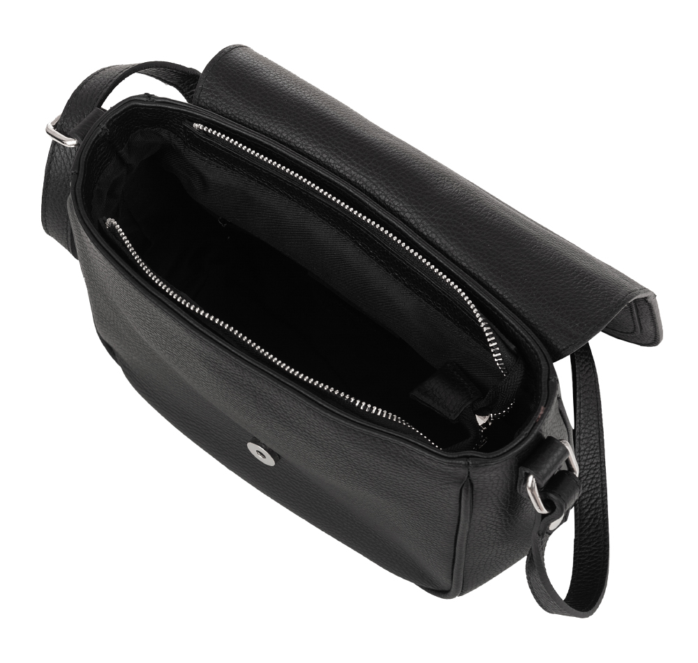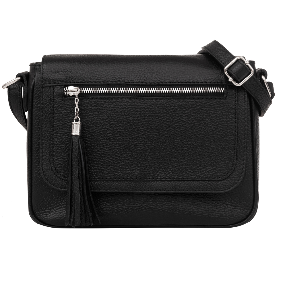Vera Pelle - Włoska klasyczna skórzana torebka / listonoszka z klapą wykonana w całości ze skóry naturalnej. Skóra mocna, odporna na zarysowania. Zamykana z góry na zamek na całej szerokości + klapa na magnes. Torebka jednokomorowa + w środku kieszonka na zamek + kieszonka na telefon. Dodatkowo z tyłu torebki kieszeń na zamek + kieszonka z przodu na klapie zakończona modnym pękiem frędzli. Wnętrze wykończone trwałą, materiałową podszewką. Metalowe elementy w kolorze srebrnym. Dno lekko usztywnione. Pełna regulacja długości paska. Torebkę można swobodnie nosić przez ramię jako listonoszkę.