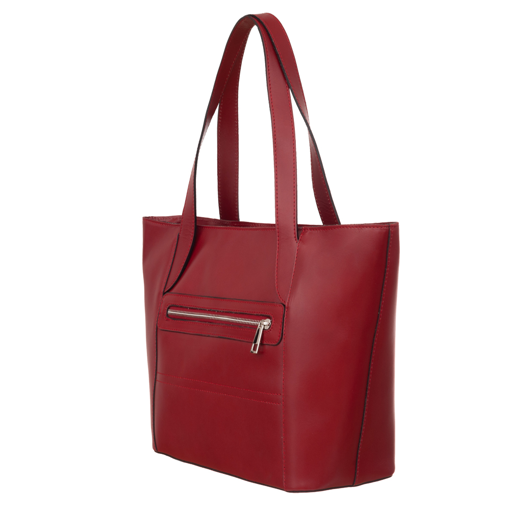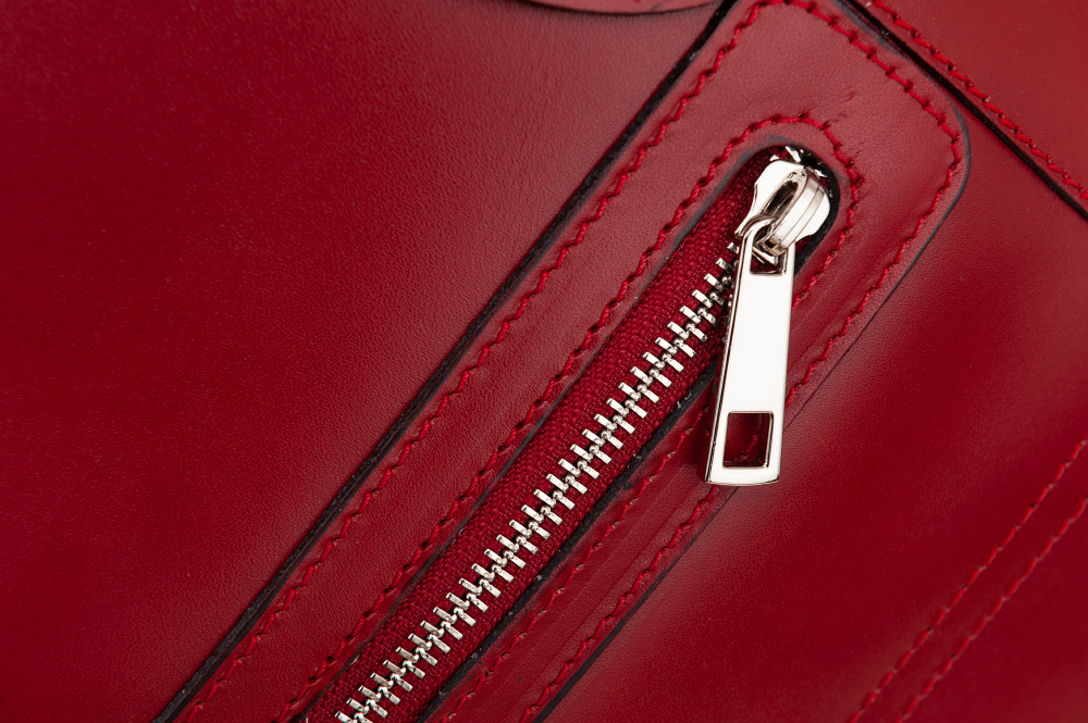 Włoska klasyczna skórzana torebka wykonana z wysokogatunkowej naturalnej gładkiej skóry licowej. Zamykana z góry na suwak na całej szerokości. Torebka dwukomorowa przedzieloną dużą kieszenią na suwak. Wewnątrz dodatkowo jedna kieszonka na zamek oraz jedna na telefon. Wnętrze wykończone trwałą, ciemną podszewką. Dodatkowo z tyłu torebki kieszonka na suwak + kieszeń z przodu. Torebka od spodu usztywniona oraz podbita ćwiekami, co chroni ją przeciw uszkodzeniom i zadrapaniom. Elementy wykończenia w kolorze srebrnym.