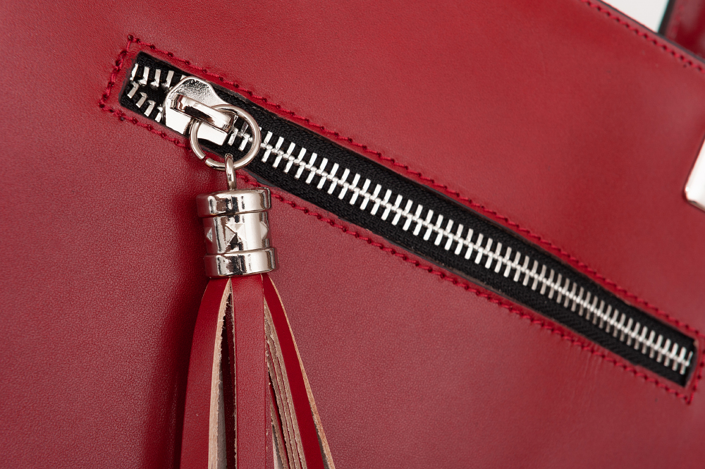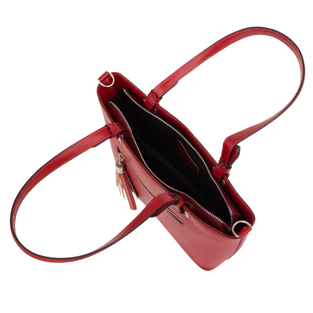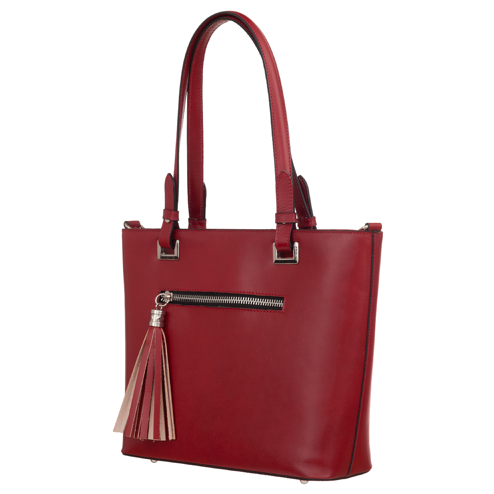 Vera Pelle - Włoska klasyczna skórzana torebka wykonana z wysokogatunkowej naturalnej gładkiej skóry licowej. Zamykana od góry na zamek na całej szerokości. Torebka jednokomorowa przedzieloną dużą kieszenią na suwak. Wewnątrz dodatkowo jedna kieszonka na zamek oraz jedna na telefon. Wnętrze wykończone trwałą, czarną materiałową podszewką. Dodatkowo z przodu torebki kieszonka na suwak z modnym pękiem frędzli. Torebka od spodu usztywniona oraz podbita metalowymi nóżkami, co chroni ją przeciw uszkodzeniom i zadrapaniom. Elementy wykończenia w kolorze srebrnym. Torebkę można swobodnie nosić na ramieniu dzięki optymalnie długim uszom. W komplecie dodatkowy długi pasek o długości 102 cm.