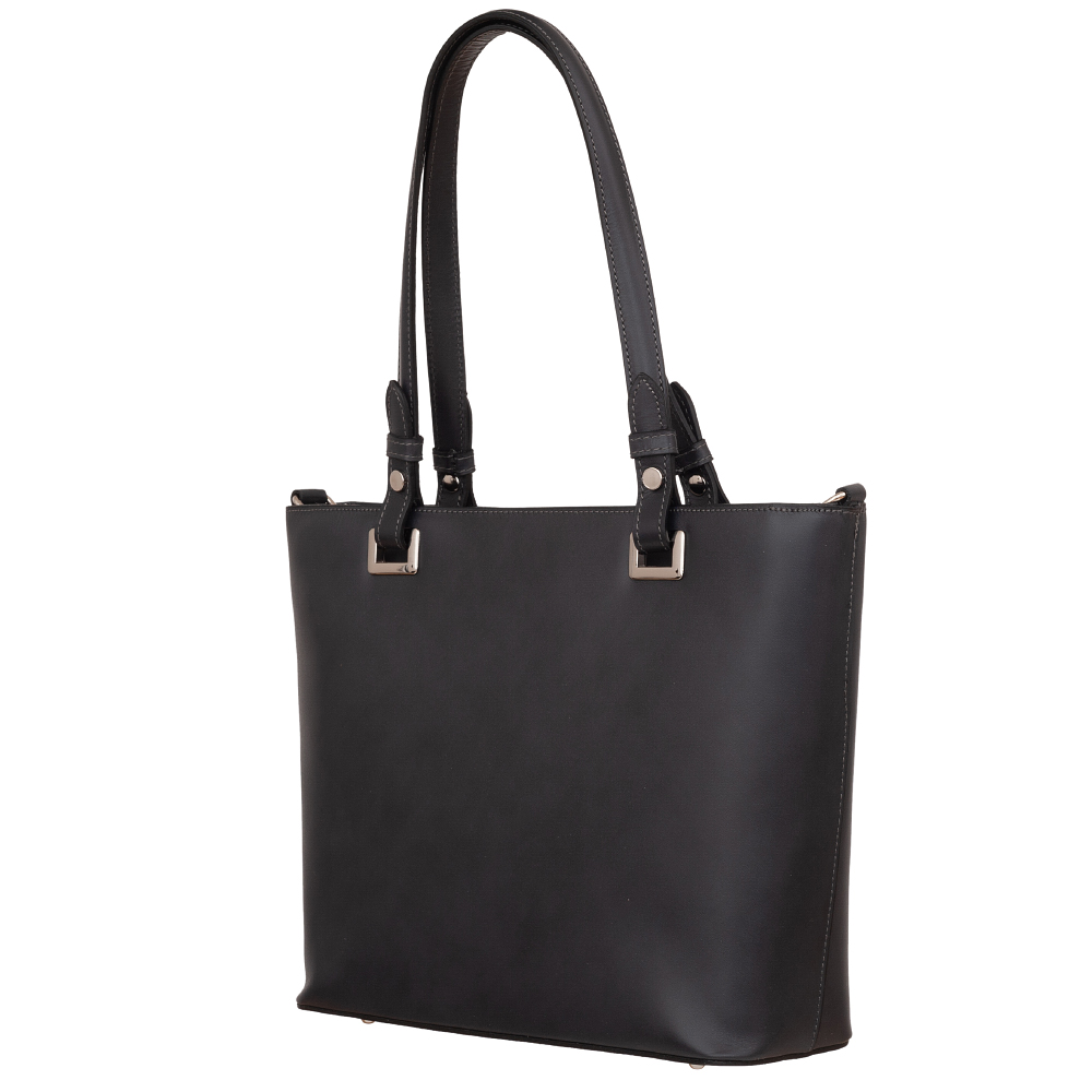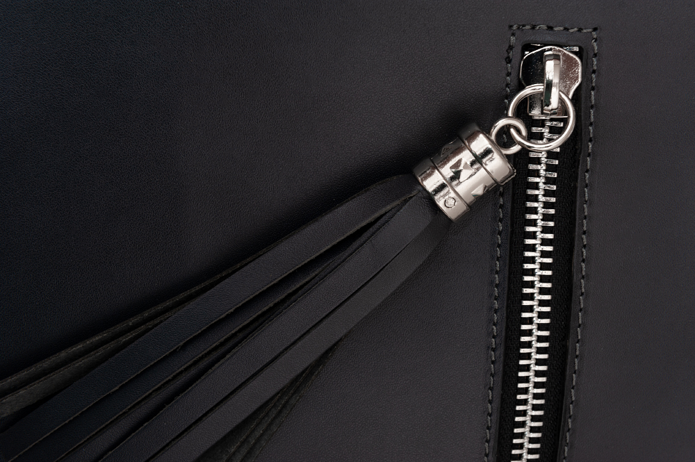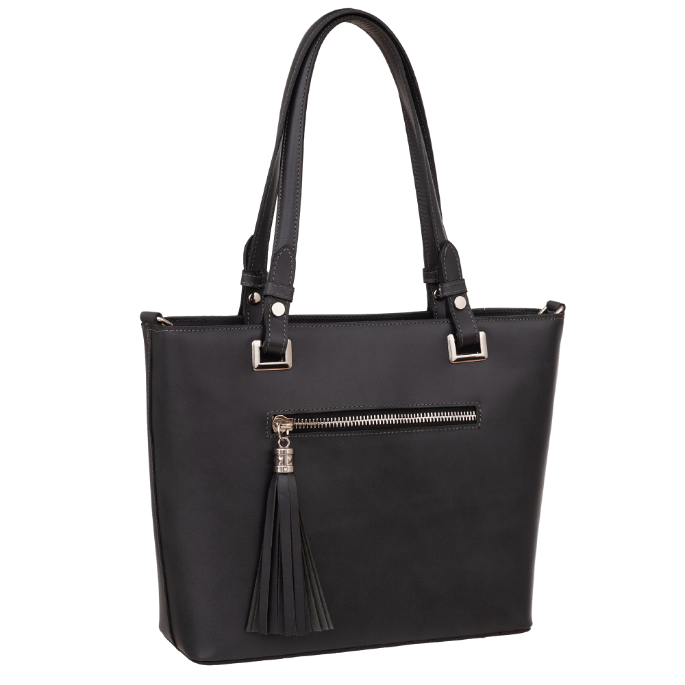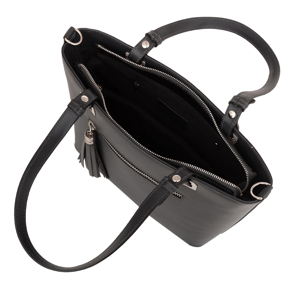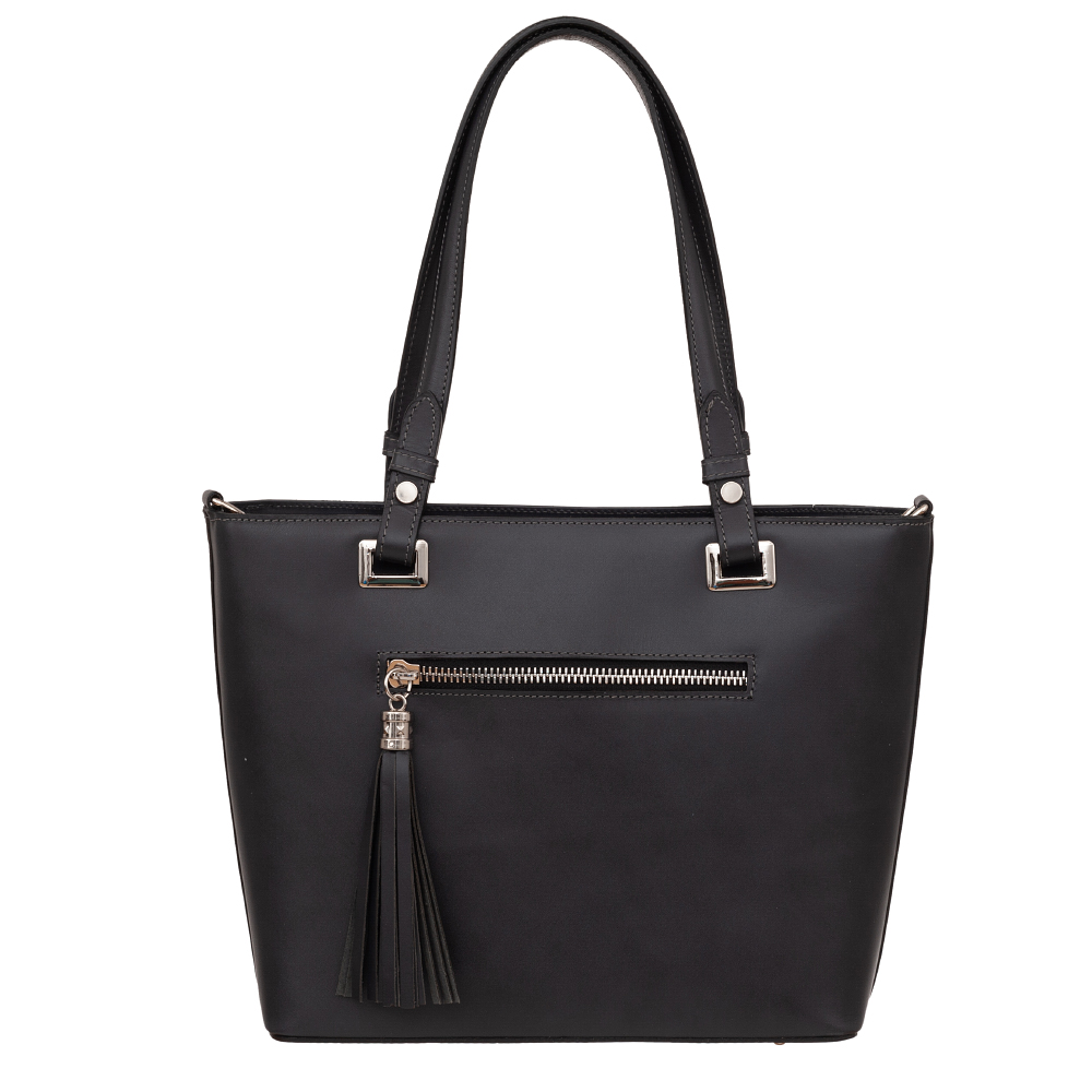 Vera Pelle - Włoska klasyczna skórzana torebka wykonana z wysokogatunkowej naturalnej gładkiej skóry licowej. Zamykana od góry na zamek na całej szerokości. Torebka jednokomorowa przedzieloną dużą kieszenią na suwak. Wewnątrz dodatkowo jedna kieszonka na zamek oraz jedna na telefon. Wnętrze wykończone trwałą, czarną materiałową podszewką. Dodatkowo z przodu torebki kieszonka na suwak z modnym pękiem frędzli. Torebka od spodu usztywniona oraz podbita metalowymi nóżkami, co chroni ją przeciw uszkodzeniom i zadrapaniom. Elementy wykończenia w kolorze srebrnym. Torebkę można swobodnie nosić na ramieniu dzięki optymalnie długim uszom. W komplecie dodatkowy długi pasek o długości 102 cm.