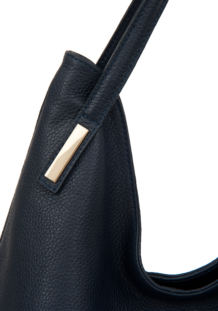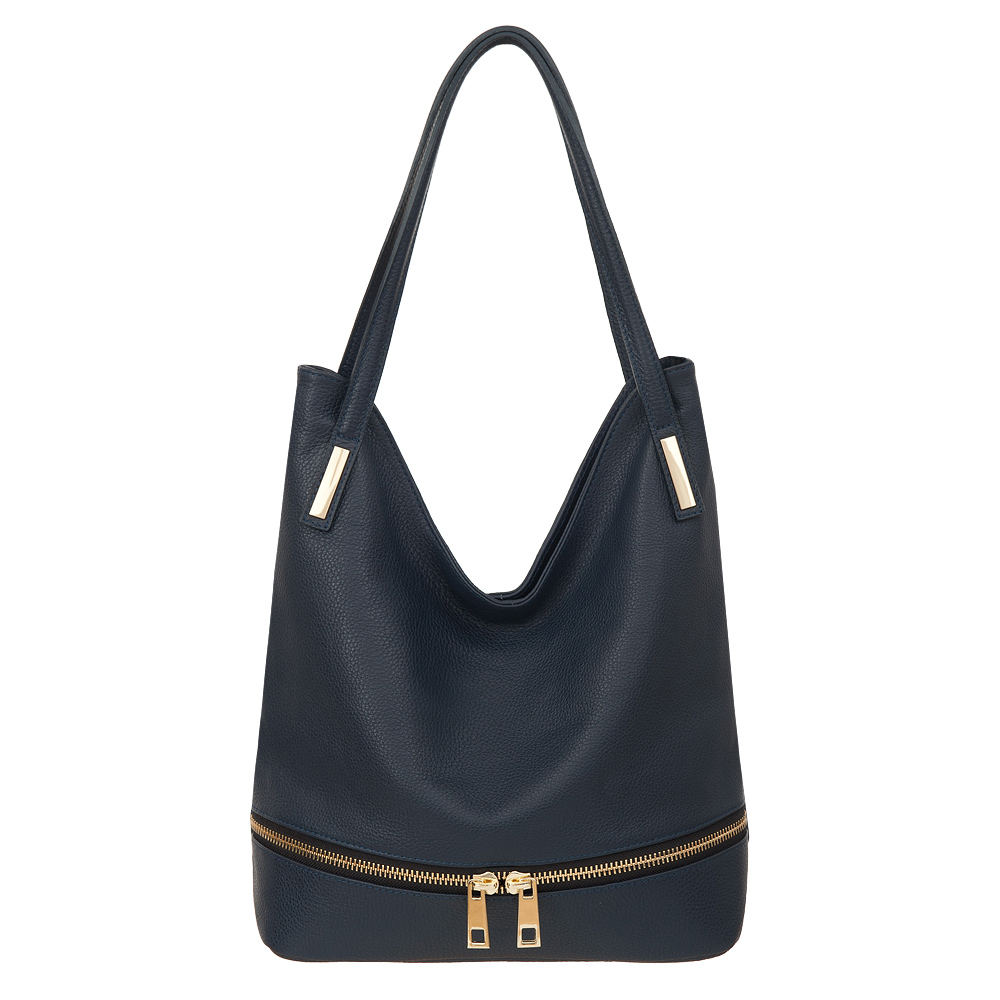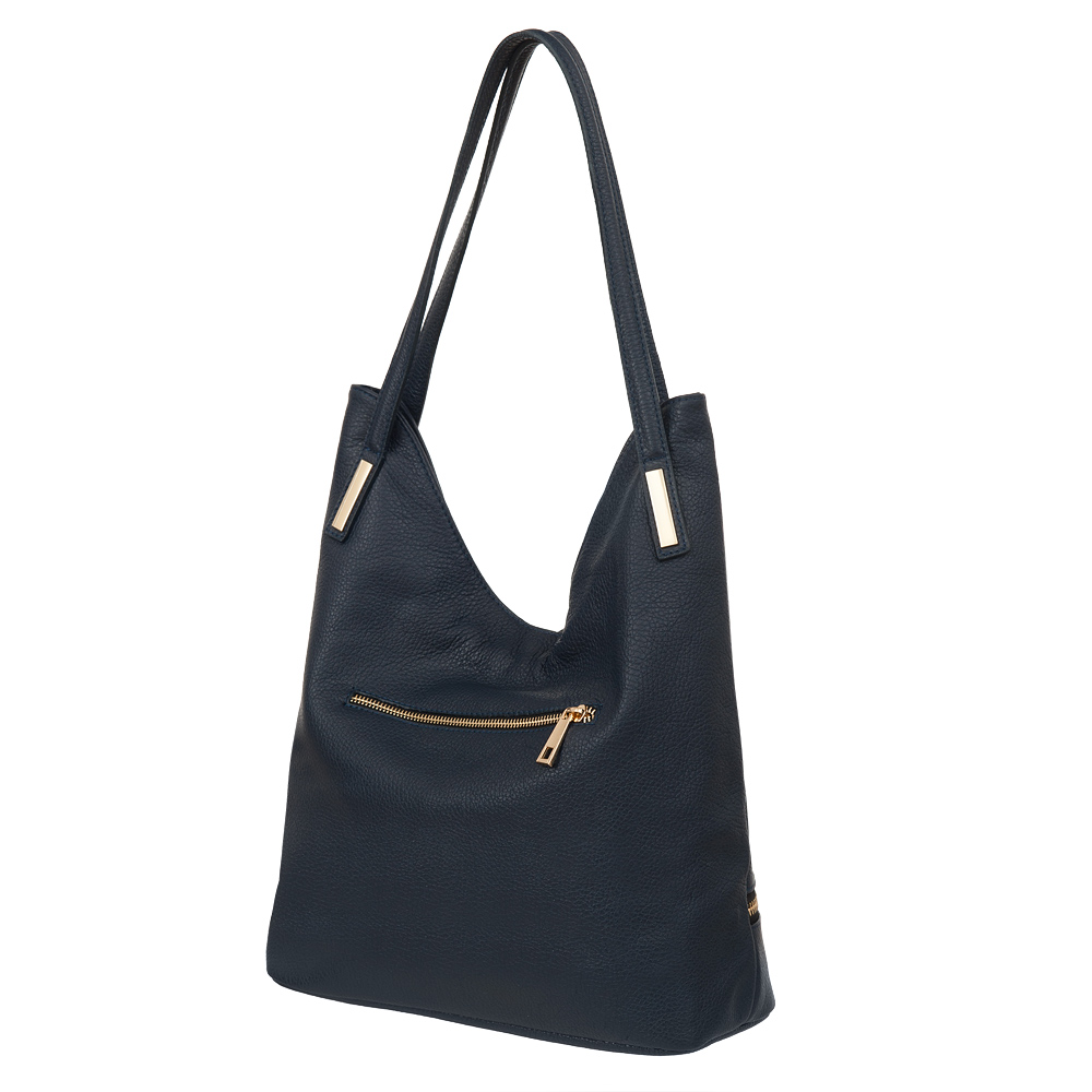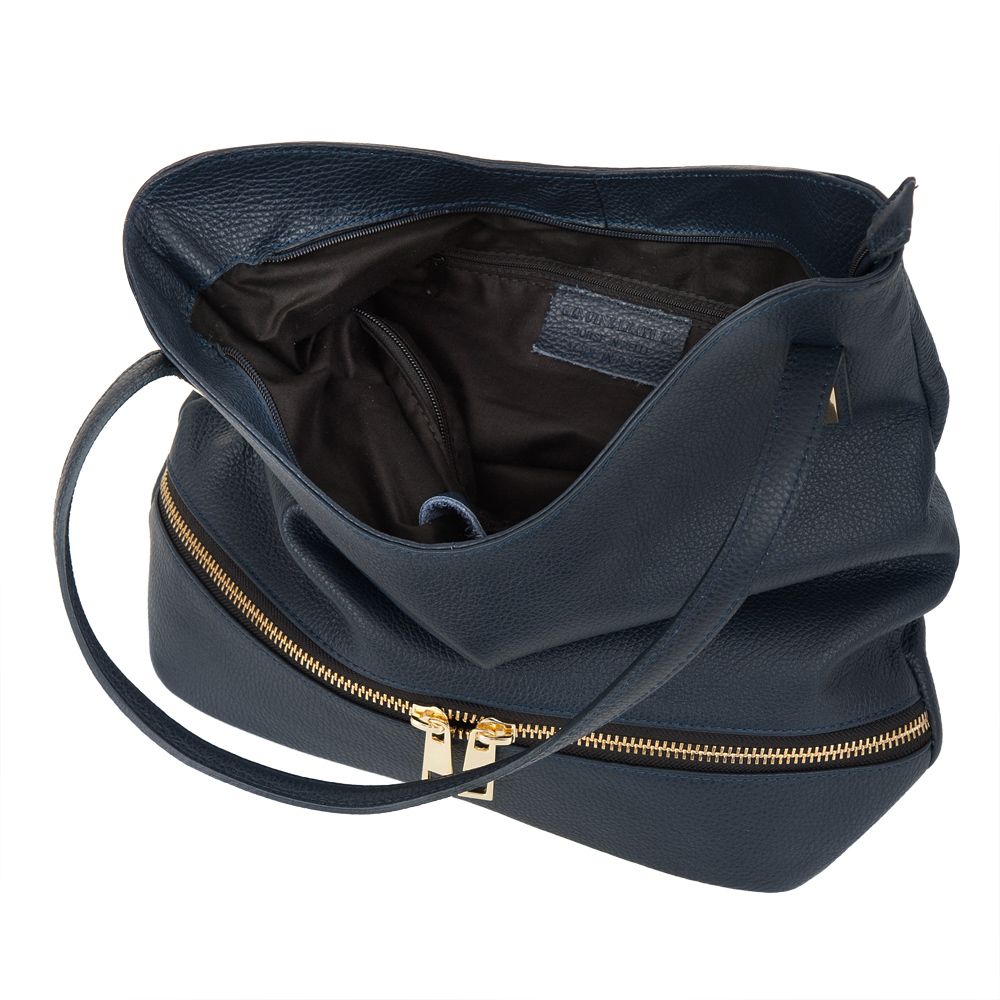 Włoska skórzana torebka / worek wykonana z wysokogatunkowej naturalnej skóry. Zamykana z góry na suwak. Torebka dwukomorowa przedzielona na środku dużą kieszenią na suwak + wewnątrz jedna kieszonka na zamek oraz jedna na telefon. Z tyłu torebki kieszeń na suwak + duża kieszonka z przodu na całej szerokośći. Wnętrze wykończone trwałą, czarną podszewką. Elementy wykończenia w kolorze złotym. Dno usztywnione.