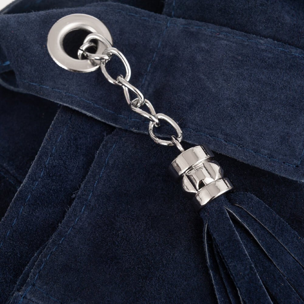 VERA PELLE - Włoska skórzana torebka worek wykonana z wysokogatunkowej naturalnej skóry zamszowej. Bardzo oryginalny i praktyczny model. Zamykana z góry na zamek. W środku mocna, materiałowa podszewka. Kieszonka na suwak + saszetka na suwak w środku + miejsce na telefon. Elementy wykończenia w kolorze srebrnym. Modny pęk frędzli z przodu torebki. Swobodnie można nosić ją w dłoni, przedramieniu jak i na ramieniu. Zamsz miękki, przyjemny w dotyku.