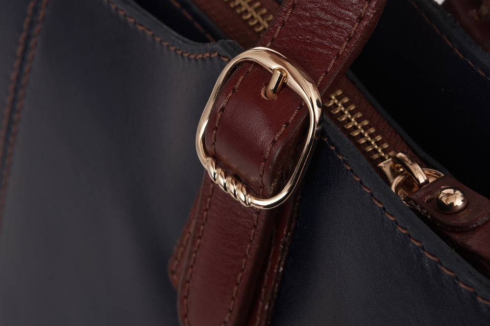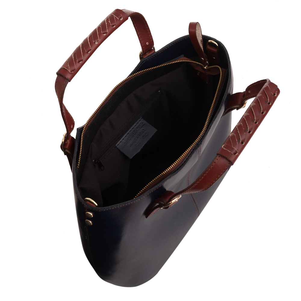 MODA IN ITALIA Włoska skórzana torebka shopper bag wykonana z wysokogatunkowej naturalnej gładkiej skóry licowej. Wygodny dostęp do środka. Zamykana od góry na suwak. Torebka jednokomorowa. Wewnątrz kieszonka na telefon + kieszeń na suwak. Od środka wykończona porządną czarną podszwką. Elementy wykończenia w kolorze złotym. Dodatkowy pasek o długości 96 cm.