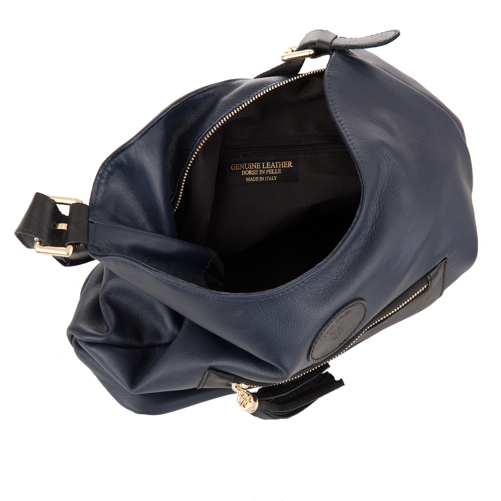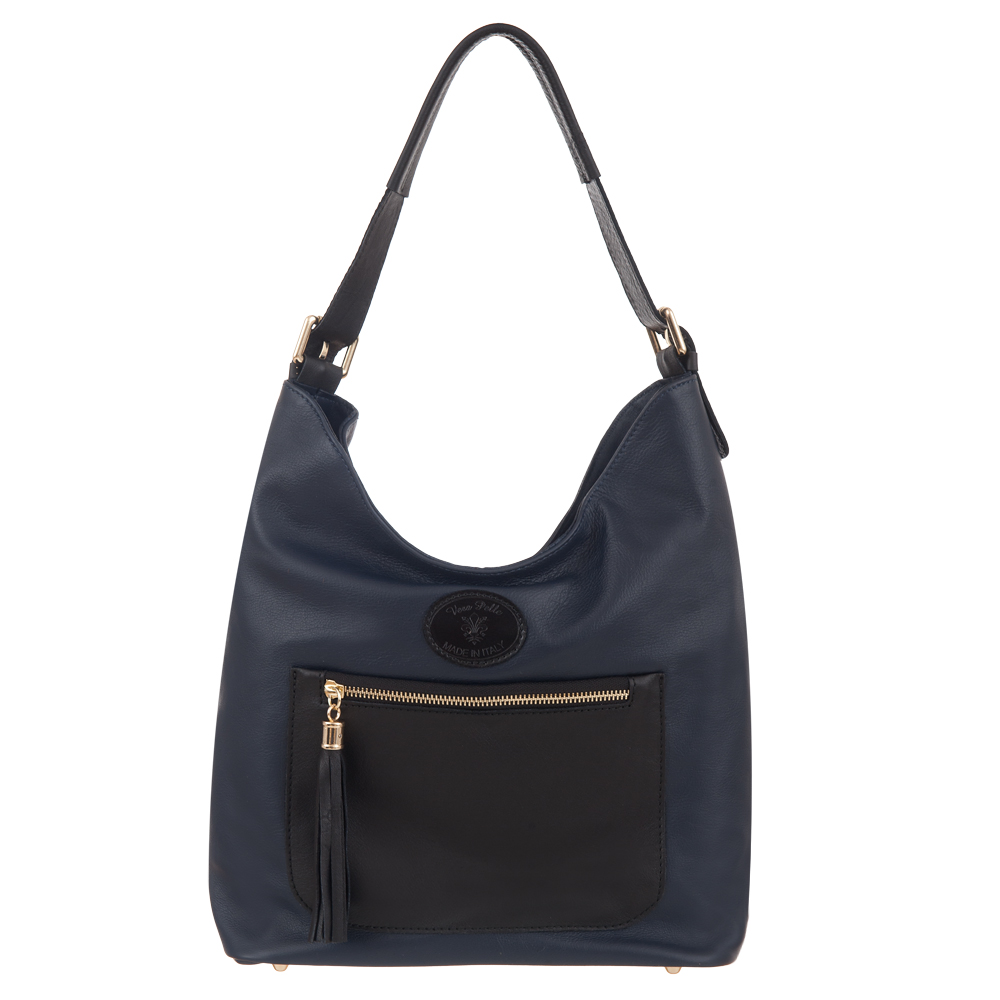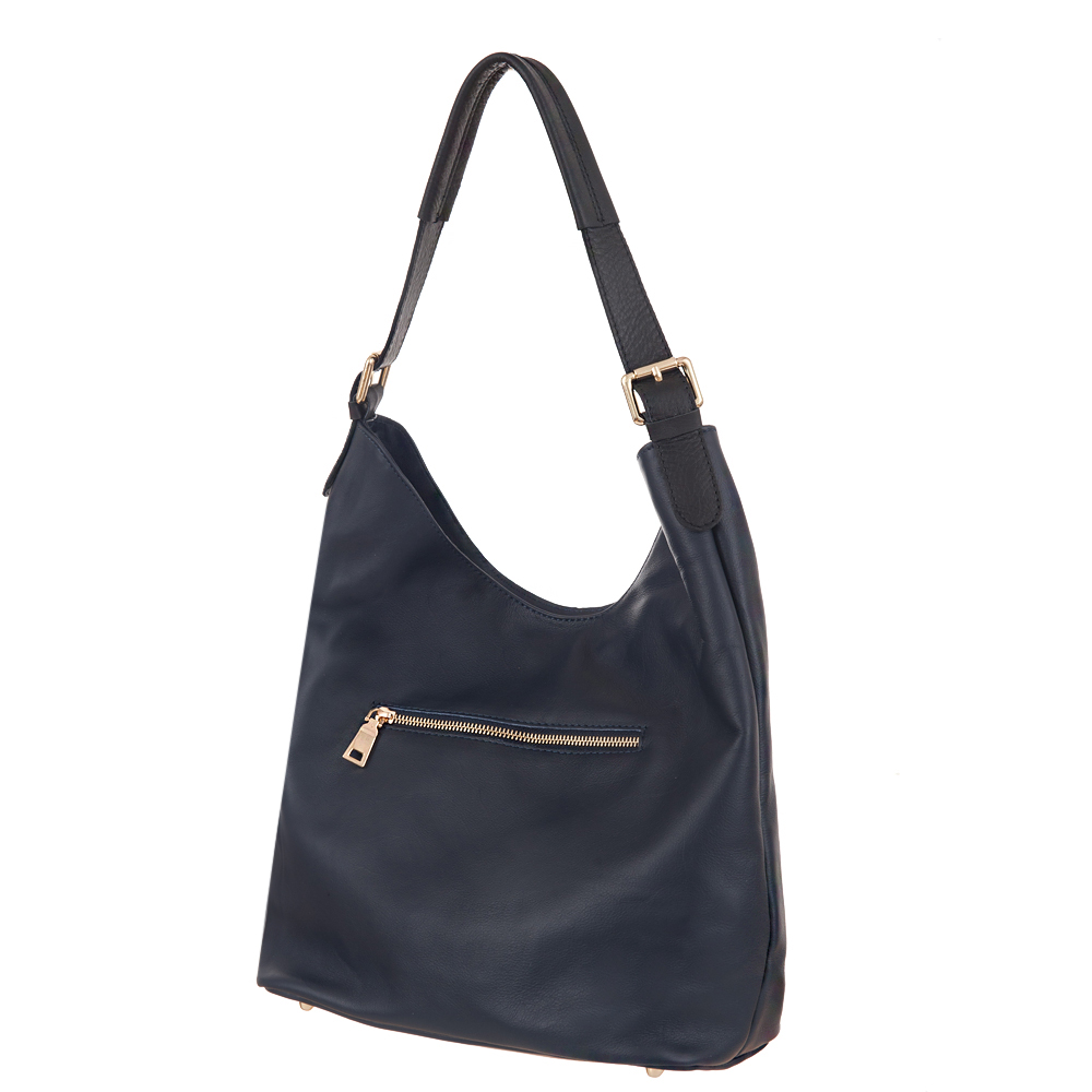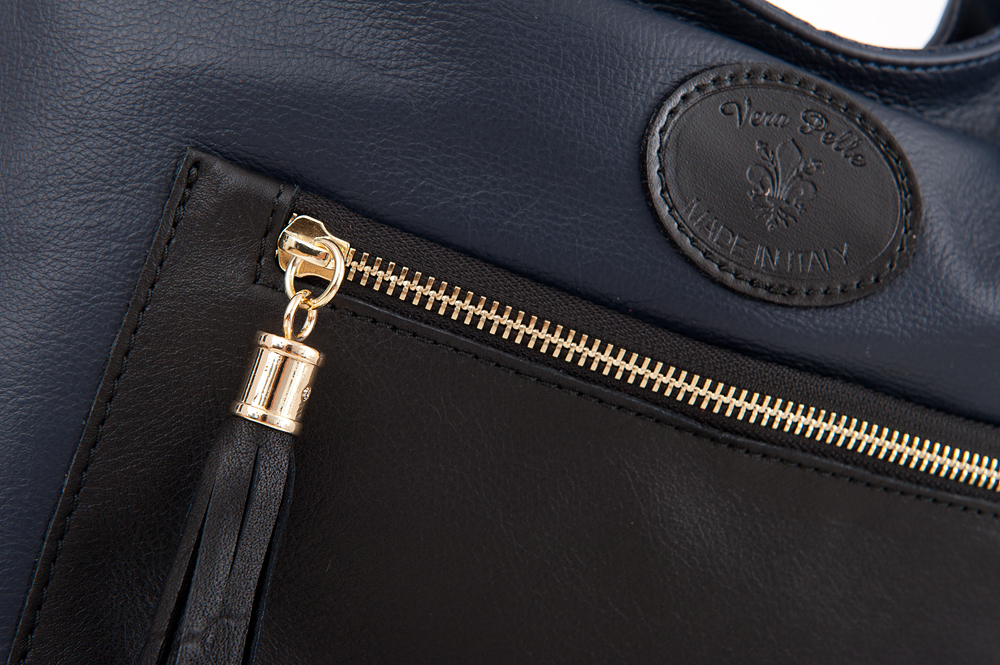 Vera Pelle - włoska skórzana torebka wykonana z wysokogatunkowej naturalnej, miękkiej skóry cielęcej. Zamykana od góry na suwak. Torebka jednokomorowa. Wewnątrz jedna kieszonka na zamek, jedna na telefon + dodatkowa kieszonka na drobiazgi. Dodatkowo z przodu i z tyłu torebki kieszeń na zamek. Wnętrze wykończone trwałą, czarną podszewką. Główne ucho z możliwością regulacji długości. Dodatkowy pasek o długości 100 cm. Dno lekko usztywnione i podbite metalowymi nóżkami, aby nie niszczył się spód. Wykończenia w kolorze złotym.