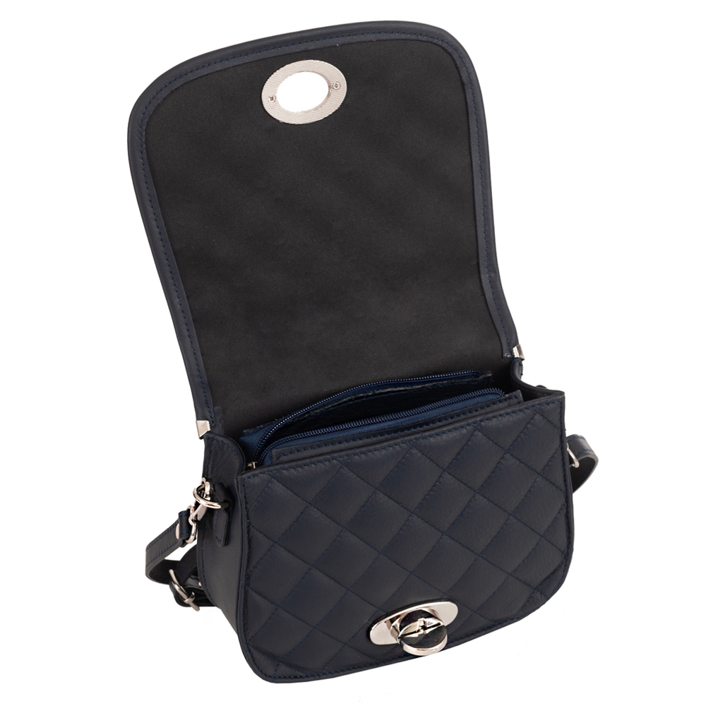 Włoska skórzana pikowana torebka wykonana z wysokogatunkowej naturalnej gładkiej skóry cielęcej VERA PELLE. Zamykana z góry na suwak + klapa na przekrętkę. Torebka jednokomorowa, wewnątrz jedna kieszonka. Wnętrze wykończone trwałą podszewką. Metalowe elementy wykończenia w kolorze srebrnym. Pasek z możliwością całkowitego odpięcia, dzięki czemu torebkę można nosić jako elegancką kopertówkę. Pasek z możliwością regulacji długości.