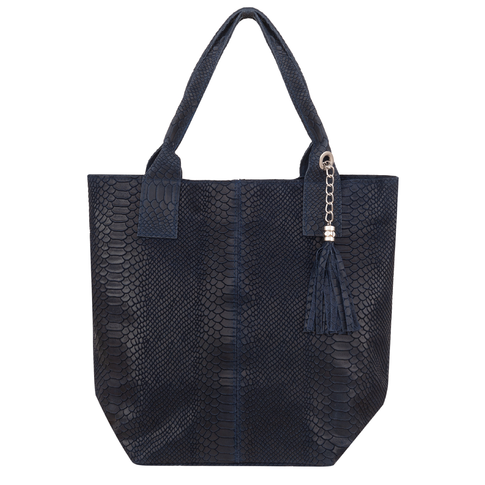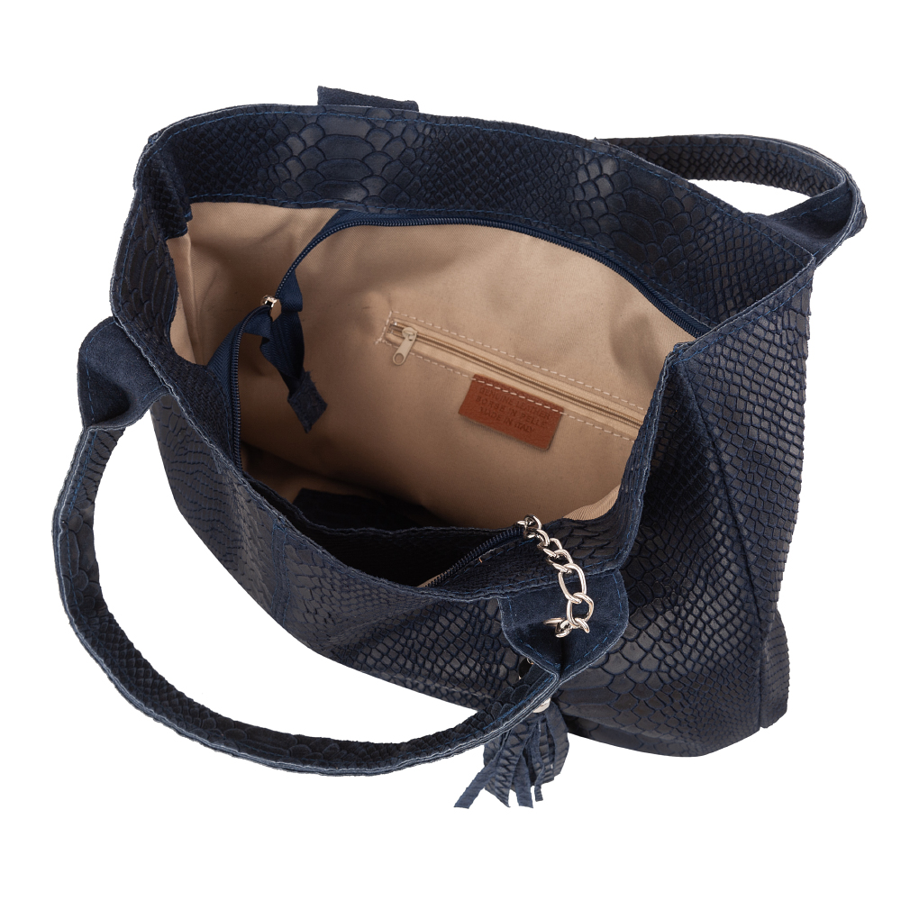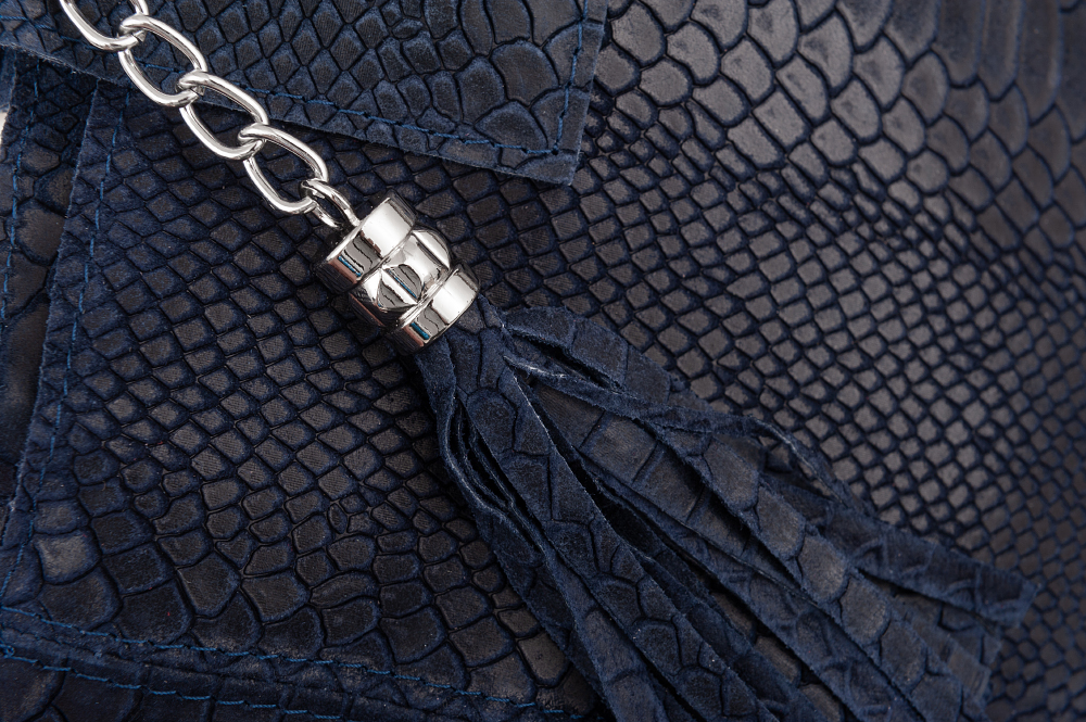 VERA PELLE Włoska skórzana torebka worek wykonana z naturalnej skóry z motywem łuski krokodyla. Bardzo oryginalny i praktyczny model. Zamykana z góry na zamek. W środku mocna, materiałowa podszewka. Kieszonka na suwak + saszetka na suwak w środku + miejsce na telefon. Elementy wykończenia w kolorze srebrnym. Modny pęk frędzli z przodu torebki. Swobodnie można nosić ją w dłoni, przedramieniu jak i na ramieniu.